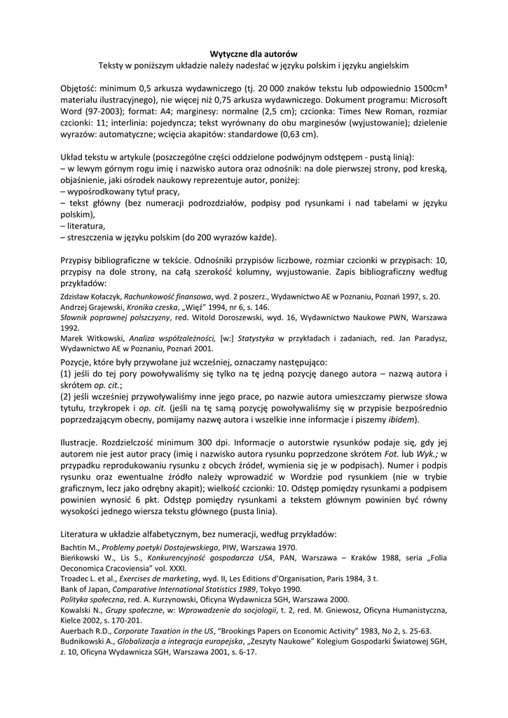 Wytyczne dla autorów Teksty w poniższym układzie należy nadesłać w języku polskim i języku angielskim Objętość: minimum 0,5 arkusza wydawniczego (tj. 20 000 znaków tekstu lub odpowiednio 1500cm³ materiału ilustracyjnego), nie więcej niż 0,75 arkusza wydawniczego. Dokument programu: Microsoft Word (97-2003); format: A4; marginesy: normalne (2,5 cm); czcionka: Times New Roman, rozmiar czcionki: 11; interlinia: pojedyncza; tekst wyrównany do obu marginesów (wyjustowanie); dzielenie wyrazów: automatyczne; wcięcia akapitów: standardowe (0,63 cm). Układ tekstu w artykule (poszczególne części oddzielone podwójnym odstępem - pustą linią): – w lewym górnym rogu imię i nazwisko autora oraz odnośnik: na dole pierwszej strony, pod kreską, objaśnienie, jaki ośrodek naukowy reprezentuje autor, poniżej: – wypośrodkowany tytuł pracy, – tekst główny (bez numeracji podrozdziałów, podpisy pod rysunkami i nad tabelami w języku polskim), – literatura, – streszczenia w języku polskim (do 200 wyrazów każde). Przypisy bibliograficzne w tekście. Odnośniki przypisów liczbowe, rozmiar czcionki w przypisach: 10, przypisy na dole strony, na całą szerokość kolumny, wyjustowanie. Zapis bibliograficzny według przykładów: Zdzisław Kołaczyk, Rachunkowość finansowa, wyd. 2 poszerz., Wydawnictwo AE w Poznaniu, Poznań 1997, s. 20. Andrzej Grajewski, Kronika czeska, „Więź” 1994, nr 6, s. 146. Słownik poprawnej polszczyzny, red. Witold Doroszewski, wyd. 16, Wydawnictwo Naukowe PWN, Warszawa 1992. Marek Witkowski, Analiza współzależności, [w:] Statystyka w przykładach i zadaniach, red. Jan Paradysz, Wydawnictwo AE w Poznaniu, Poznań 2001. Pozycje, które były przywołane już wcześniej, oznaczamy następująco: (1) jeśli do tej pory powoływaliśmy się tylko na tę jedną pozycję danego autora – nazwą autora i skrótem op. cit.; (2) jeśli wcześniej przywoływaliśmy inne jego prace, po nazwie autora umieszczamy pierwsze słowa tytułu, trzykropek i op. cit. (jeśli na tę samą pozycję powoływaliśmy się w przypisie bezpośrednio poprzedzającym obecny, pomijamy nazwę autora i wszelkie inne informacje i piszemy ibidem). Ilustracje. Rozdzielczość minimum 300 dpi. Informacje o autorstwie rysunków podaje się, gdy jej autorem nie jest autor pracy (imię i nazwisko autora rysunku poprzedzone skrótem Fot. lub Wyk.; w przypadku reprodukowaniu rysunku z obcych źródeł, wymienia się je w podpisach). Numer i podpis rysunku oraz ewentualne źródło należy wprowadzić w Wordzie pod rysunkiem (nie w trybie graficznym, lecz jako odrębny akapit); wielkość czcionki: 10. Odstęp pomiędzy rysunkami a podpisem powinien wynosić 6 pkt. Odstęp pomiędzy rysunkami a tekstem głównym powinien być równy wysokości jednego wiersza tekstu głównego (pusta linia). Literatura w układzie alfabetycznym, bez numeracji, według przykładów: Bachtin M., Problemy poetyki Dostojewskiego, PIW, Warszawa 1970. Bieńkowski W., Lis S., Konkurencyjność gospodarcza USA, PAN, Warszawa – Kraków 1988, seria „Folia Oeconomica Cracoviensia” vol. XXXI. Troadec L. et al., Exercises de marketing, wyd. II, Les Editions d’Organisation, Paris 1984, 3 t. Bank of Japan, Comparative International Statistics 1989, Tokyo 1990. Polityka społeczna, red. A. Kurzynowski, Oficyna Wydawnicza SGH, Warszawa 2000. Kowalski N., Grupy społeczne, w: Wprowadzenie do socjologii, t. 2, red. M. Gniewosz, Oficyna Humanistyczna, Kielce 2002, s. 170-201. Auerbach R.D., Corporate Taxation in the US, “Brookings Papers on Economic Activity” 1983, No 2, s. 25-63. Budnikowski A., Globalizacja a integracja europejska, „Zeszyty Naukowe” Kolegium Gospodarki Światowej SGH, z. 10, Oficyna Wydawnicza SGH, Warszawa 2001, s. 6-17.