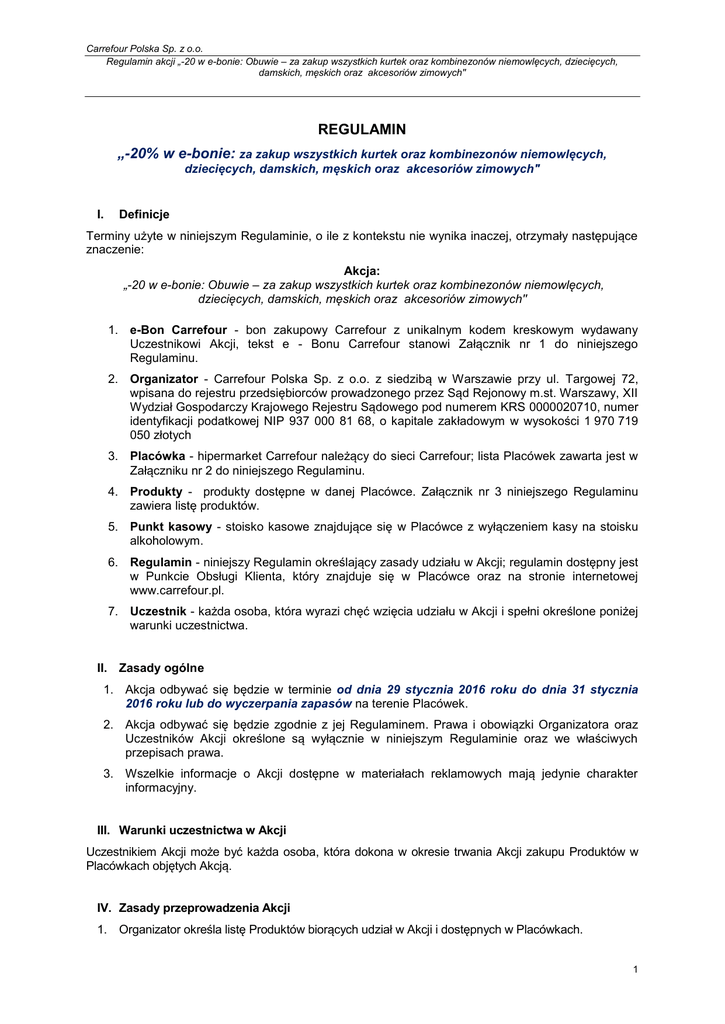 Carrefour Polska Sp. z o.o. Regulamin akcji „-20 w e-bonie: Obuwie – za zakup wszystkich kurtek oraz kombinezonów niemowlęcych, dziecięcych, damskich, męskich oraz akcesoriów zimowych" REGULAMIN „-20% w e-bonie: za zakup wszystkich kurtek oraz kombinezonów niemowlęcych, dziecięcych, damskich, męskich oraz akcesoriów zimowych" I. Definicje Terminy użyte w niniejszym Regulaminie, o ile z kontekstu nie wynika inaczej, otrzymały następujące znaczenie: Akcja: „-20 w e-bonie: Obuwie – za zakup wszystkich kurtek oraz kombinezonów niemowlęcych, dziecięcych, damskich, męskich oraz akcesoriów zimowych" 1. e-Bon Carrefour - bon zakupowy Carrefour z unikalnym kodem kreskowym wydawany Uczestnikowi Akcji, tekst e - Bonu Carrefour stanowi Załącznik nr 1 do niniejszego Regulaminu. 2. Organizator - Carrefour Polska Sp. z o.o. z siedzibą w Warszawie przy ul. Targowej 72, wpisana do rejestru przedsiębiorców prowadzonego przez Sąd Rejonowy m.st. Warszawy, XII Wydział Gospodarczy Krajowego Rejestru Sądowego pod numerem KRS 0000020710, numer identyfikacji podatkowej NIP 937 000 81 68, o kapitale zakładowym w wysokości 1 970 719 050 złotych 3. Placówka - hipermarket Carrefour należący do sieci Carrefour; lista Placówek zawarta jest w Załączniku nr 2 do niniejszego Regulaminu. 4. Produkty - produkty dostępne w danej Placówce. Załącznik nr 3 niniejszego Regulaminu zawiera listę produktów. 5. Punkt kasowy - stoisko kasowe znajdujące się w Placówce z wyłączeniem kasy na stoisku alkoholowym. 6. Regulamin - niniejszy Regulamin określający zasady udziału w Akcji; regulamin dostępny jest w Punkcie Obsługi Klienta, który znajduje się w Placówce oraz na stronie internetowej www.carrefour.pl. 7. Uczestnik - każda osoba, która wyrazi chęć wzięcia udziału w Akcji i spełni określone poniżej warunki uczestnictwa. II. Zasady ogólne 1. Akcja odbywać się będzie w terminie od dnia 29 stycznia 2016 roku do dnia 31 stycznia 2016 roku lub do wyczerpania zapasów na terenie Placówek. 2. Akcja odbywać się będzie zgodnie z jej Regulaminem. Prawa i obowiązki Organizatora oraz Uczestników Akcji określone są wyłącznie w niniejszym Regulaminie oraz we właściwych przepisach prawa. 3. Wszelkie informacje o Akcji dostępne w materiałach reklamowych mają jedynie charakter informacyjny. III. Warunki uczestnictwa w Akcji Uczestnikiem Akcji może być każda osoba, która dokona w okresie trwania Akcji zakupu Produktów w Placówkach objętych Akcją. IV. Zasady przeprowadzenia Akcji 1. Organizator określa listę Produktów biorących udział w Akcji i dostępnych w Placówkach. 1 Carrefour Polska Sp. z o.o. Regulamin akcji „-20 w e-bonie: Obuwie – za zakup wszystkich kurtek oraz kombinezonów niemowlęcych, dziecięcych, damskich, męskich oraz akcesoriów zimowych" V. Warunki otrzymania e-Bonu za zakup Produktu. 1. Każdemu Uczestnikowi przysługuje jednorazowo prawo do otrzymania e-Bonu za zakup Produktu na zasadach określonych w niniejszym Regulaminie. 2. Warunkiem otrzymania e-Bonu jest nabycie przez Uczestnika Produktu w Placówce w okresie obowiązywania Akcji. 3. Wartość otrzymanego e-Bonu uzależniona jest od ostatecznej kwoty figurującej na paragonie fiskalnym potwierdzającym dokonane przez Uczestnika zakupu Produktów w Placówce, po uwzględnieniu wszystkich wykorzystanych przez Uczestnika rabatów. Maksymalna wartość otrzymanego do jednej transakcji e- Bonu wynosi do 600,00 złotych brutto tj. e – Bony nie będą przyznawane od kwoty wydanej na Produkty przekraczającej 3 000,00 złotych brutto. 4. e-Bony będą wydawane w Punkcie Kasowym przez kasjera tylko i wyłącznie po dokonaniu zapłaty za Produkty przez Uczestnika. e-Bon nie będzie wydawany w innym dniu niż dzień nabycia Produktów oraz tylko i wyłącznie bezpośrednio po dokonaniu przez Uczestnika zapłaty za Produkty. Po wydaniu e-Bonu kasjer dokona na paragonie fiskalnym adnotacji o treści ”Bon wydany sztuk….”. Wydanie kolejnego e-Bonu na podstawie paragonu, na którym znajduje się taka adnotacja nie będzie możliwe. 5. Organizator zastrzega sobie prawo do odmowy wydania e-Bonu w przypadku, gdy Uczestnik wielokrotnie dokonuje nabycia Produktów w tym samym dniu podczas trwania Akcji. 6. Akcja łączy się z innymi akcjami i promocjami przeprowadzanymi w Placówkach. W żadnym przypadku wartość przyznanych łącznie Uczestnikowi bonów, w tym e-Bonów oraz bonów Carrefour, które mogą zostać przyznane Uczestnikowi na podstawie innych promocji, w których bierze udział, obowiązujących w tym samym czasie w Placówkach, nie może przekroczyć łącznie kwoty 760 złotych do jednego paragonu. VI. e-Bon 1. e-Bon jest bonem na okaziciela, uprawniającymi okaziciela e-Bonu do częściowej lub całkowitej zapłaty za zakupione produkty oferowane do sprzedaży w Placówkach. Możliwość realizacji eBonu w terminie jego ważności uwarunkowana jest zakupem produktów w Placówkach. 2. e-Bon Carrefour podlega realizacji wyłącznie w terminie na nim określonym, tj. od 01 lutego do 29 lutego 2016 r. 3. W przypadku, gdy wartość zakupionych Produktów będzie niższa od wartości nominalnej eBonu Placówka nie zwraca różnicy pomiędzy wartością zakupionych produktów, a wartością eBonu Carrefour. 4. W przypadku, gdy wartość Produktów będzie wyższa od wartości e-Bonu, jego okaziciel będzie zobowiązany dopłacić różnicę. 5. W przypadku utraty, zniszczenia lub uszkodzenia e-Bonu po jego wydaniu, duplikaty nie będą wydawane, a okazicielowi e-Bonu nie przysługują jakiekolwiek roszczenia z tego tytułu. 6. e-Bon nie podlega wymianie ani zwrotowi. 7. e-Bony nie są realizowane w kasach samoobsługowych. VII. Postępowanie reklamacyjne 1. Prawo do składania reklamacji, w zakresie niezgodności przeprowadzenia Akcji z niniejszym Regulaminem, służy każdemu Uczestnikowi w terminie 30 dni od daty zakupu Produktów. 2. Reklamacje należy kierowa