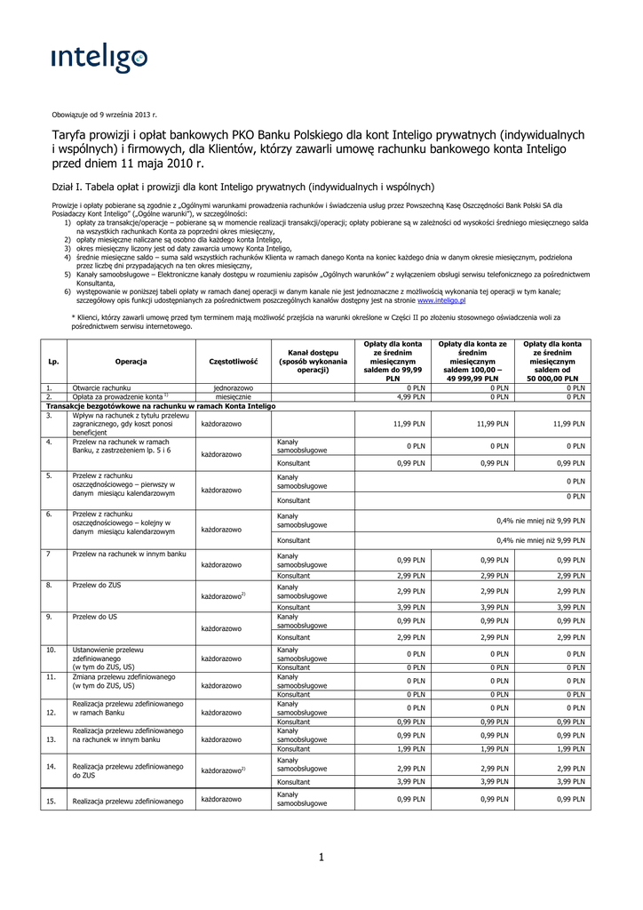 Obowiązuje od 9 września 2013 r. Taryfa prowizji i opłat bankowych PKO Banku Polskiego dla kont Inteligo prywatnych (indywidualnych i wspólnych) i firmowych, dla Klientów, którzy zawarli umowę rachunku bankowego konta Inteligo przed dniem 11 maja 2010 r. Dział I. Tabela opłat i prowizji dla kont Inteligo prywatnych (indywidualnych i wspólnych) Prowizje i opłaty pobierane są zgodnie z „Ogólnymi warunkami prowadzenia rachunków i świadczenia usług przez Powszechną Kasę Oszczędności Bank Polski SA dla Posiadaczy Kont Inteligo” („Ogólne warunki”), w szczególności: 1) opłaty za transakcje/operacje – pobierane są w momencie realizacji transakcji/operacji; opłaty pobierane są w zależności od wysokości średniego miesięcznego salda na wszystkich rachunkach Konta za poprzedni okres miesięczny, 2) opłaty miesięczne naliczane są osobno dla każdego konta Inteligo, 3) okres miesięczny liczony jest od daty zawarcia umowy Konta Inteligo, 4) średnie miesięczne saldo – suma sald wszystkich rachunków Klienta w ramach danego Konta na koniec każdego dnia w danym okresie miesięcznym, podzielona przez liczbę dni przypadających na ten okres miesięczny, 5) Kanały samoobsługowe – Elektroniczne kanały dostępu w rozumieniu zapisów „Ogólnych warunków” z wyłączeniem obsługi serwisu telefonicznego za pośrednictwem Konsultanta, 6) występowanie w poniższej tabeli opłaty w ramach danej operacji w danym kanale nie jest jednoznaczne z możliwością wykonania tej operacji w tym kanale; szczegółowy opis funkcji udostępnianych za pośrednictwem poszczególnych kanałów dostępny jest na stronie www.inteligo.pl * Klienci, którzy zawarli umowę przed tym terminem mają możliwość przejścia na warunki określone w Części II po złożeniu stosownego oświadczenia woli za pośrednictwem serwisu internetowego. Lp. Operacja Częstotliwość Kanał dostępu (sposób wykonania operacji) 1. Otwarcie rachunku jednorazowo 2. Opłata za prowadzenie konta 1) miesięcznie Transakcje bezgotówkowe na rachunku w ramach Konta Inteligo 3. Wpływ na rachunek z tytułu przelewu zagranicznego, gdy koszt ponosi każdorazowo beneficjent 4. Przelew na rachunek w ramach Kanały Banku, z zastrzeżeniem lp. 5 i 6 samoobsługowe każdorazowo Konsultant 5. 6. 7 Przelew z rachunku oszczędnościowego – pierwszy w danym miesiącu kalendarzowym każdorazowo Przelew z rachunku oszczędnościowego – kolejny w danym miesiącu kalendarzowym każdorazowo 9. 10. Przelew na rachunek w innym banku 11. 12. 13. 14. 15. Realizacja przelewu zdefiniowanego na rachunek w innym banku Realizacja przelewu zdefiniowanego do ZUS Realizacja przelewu zdefiniowanego 11,99 PLN 11,99 PLN 11,99 PLN 0 PLN 0 PLN 0 PLN 0,99 PLN 0,99 PLN 0,99 PLN Kanały samoobsługowe 0 PLN 0 PLN Kanały samoobsługowe 0,4% nie mniej niż 9,99 PLN Konsultant 0,4% nie mniej niż 9,99 PLN 0,99 PLN 0,99 PLN 0,99 PLN Konsultant 2,99 PLN 2,99 PLN 2,99 PLN każdorazowo2) Kanały samoobsługowe 2,99 PLN 2,99 PLN 2,99 PLN 3,99 PLN 3,99 PLN 3,99 PLN każdorazowo Konsultant Kanały samoobsługowe 0,99 PLN 0,99 PLN 0,99 PLN Konsultant 2,99 PLN 2,99 PLN 2,99 PLN 0 PLN 0 PLN 0 PLN 0 PLN 0 PLN 0 PLN 0 PLN 0 PLN 0 PLN 0 PLN 0 PLN 0 PLN 0 PLN 0 PLN 0 PLN 0,99 PLN 0,99 PLN 0,99 PLN 0,99 PLN 0,99 PLN 0,99 PLN 1,99 PLN 1,99 PLN 1,99 PLN Przelew do US Realizacja przelewu zdefiniowanego w ramach Banku Opłaty dla konta ze średnim miesięcznym saldem od 50 000,00 PLN 0 PLN 0 PLN Kanały samoobsługowe Przelew do ZUS Ustanowienie przelewu zdefiniowanego (w tym do ZUS, US) Zmiana przelewu zdefiniowanego (w tym do ZUS, US) Opłaty dla konta ze średnim miesięcznym saldem 100,00 – 49 999,99 PLN 0 PLN 0 PLN Konsultant każdorazowo 8. Opłaty dla konta ze średnim miesięcznym saldem do 99,99 PLN 0 PLN 4,99 PLN każdorazowo każdorazowo każdorazowo każdorazowo każdorazowo2) każdorazowo Kanały samoobsługowe Konsultant Kanały samoobsługowe Konsultant Kanały samoobsługowe Konsultant Kanały samoobsługowe Konsultant Kanały samoobsługowe 2,99 PLN 2,99 PLN 2,99 PLN Konsultant 3,99 PLN 3,99 PLN 3,99 PLN Kanały samoobsługowe 0,99 PLN 0,99 PLN 0,99 PLN 1 do US 16. Ustanowienie zlecenia stałego 17. Zmiana zlecenia stałego 18. Realizacja stałego zlecenia na rachunek w ramach Kont Inteligo Realizacja stałego zlecenia na prowadzony przez Bank rachunek inny niż rachunek w ramach Kont Inteligo 19. 20. 21. Realizacja stałego zlecenia na rachunek w innym banku Wypłata części środków z lokaty o zmiennym oprocentowaniu przed upływem okresu umownego (do wysokości salda minimalnego) Konsultant każdorazowo Kanały samoobsługowe 1,99 PLN 1,99 PLN 1,99 PLN 0 PLN 0 PLN 0 PLN Konsultant 0,99 PLN 0,99 PLN 0,99 PLN każdorazowo Konsultant 0 PLN 0 PLN 0 PLN każdorazowo Automatycznie 0 PLN 0 PLN 0 PLN każdorazowo Automatycznie 0 PLN 0 PLN 0 PLN 0,99 PLN 0,99 PLN 0,99 PLN 0 PLN 0 PLN 0 PLN 0,99 PLN 0,99 PLN 0,99 PLN każdorazowo Kanały samoobsługowe każdorazowo Konsultant 22. Przelew na zakup jednostek uczestnictwa w funduszach PKO TFI 0 PLN 0 PLN 0 PLN każdorazowo SA Karta Inteligo Visa Electron, karta Inteligo Visa Electron z Sercem (oferowana do dnia 2 stycznia 2013 r.), karta Inteligo MasterCard PayPass i karta Inteligo Visa payWave „Dobro procentuje” (oferowana od dnia 3 stycznia 2013 r.) 23. 24. 25. 26. Wydanie karty Inteligo Visa Electron, karty Inteligo MasterCard PayPass, karty Inteligo Visa payWave „Dobro procentuje”: 1) pierwsza karta wydana do rachunku głównego (ważna 2 lata) 2) każda kolejna karta wydana do rachunków, w tym rachunku głównego (ważna 2 lata) Wydanie karty Inteligo Visa Electron z Sercem: 1) pierwsza karta wydana do rachunku głównego (ważna 2 lata) 2) każda kolejna karta wydana do rachunków, w tym rachunku głównego (ważna 2 lata) Opłata za kartę Inteligo Visa Electron, kartę Inteligo MasterCard PayPass, kartę Inteligo Visa payWave „Dobro procentuje”: 1) karta wydana do rac