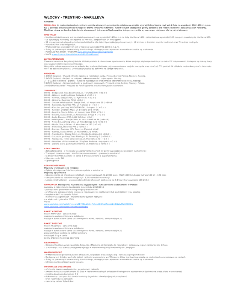 WŁOCHY - TRENTINO - MARILLEVA 1 374,00 PLN MARILLEVA to małe miasteczko i centrum sportów zimowych, przepięknie położone w obrębie słynnej Doliny Słońca czyli Val di Sole na wysokości 900-1400 m n.p.m. tuż u podnóża trzytysięczników Gruppo di Brenta i masywu Adamello. Kurort ten jest szczególnie godny polecenia dla rodzin z dziećmi i początkujących narciarzy. Marilleva cieszy się bardzo dużą ilością słonecznych dni oraz obfitych opadów śniegu, co czyni ją wymarzonym miejscem dla turystyki zimowej. OPIS TRASY - Marilleva zlokalizowana jest na dwóch poziomach- na wysokości 1400m n.p.m. leży Marilleva 1400, natomiast na wysokości 900 m n.p.m. znajduję się Marilleva 900. - Do dyspozycji narciarzy jest łącznie 50 km tras, połączonych 24 wyciągami. - 32 km nartostrad o łagodnych zboczach (idealne dla dzieci i początkujących narciarzy), 11 km tras o średnim stopniu trudności oraz 7 km tras trudnych. - Ponadto 5 km tras biegowych. - Większość tras wytyczonych jest w lesie na wysokości 900-2180 m n.p.m. - Śnieg na północnych stokach leży bardzo długo, dlatego przez cały sezon warunki narciarskie są znakomite. - PODGLĄD NA ŻYWO - WEBCAM www.skirama.it/pl/webcam/pinzolo/ - MAPA www.skirama.it/en/pistes-and-ski-lifts/ski-map/ ZAKWATEROWANIE Zakwaterowanie w Rezydencji Artuik. Obiekt posiada 4, 6-osobowe apartamenty, które znajdują się bezpośrednio przy stoku! W miejscowości dostępne są sklepy, bary oraz wypożyczalnie sprzętu zimowego. Wszystkie pokoje wyposażone są w łazienkę, kuchnię (lodówka, płyta ceramiczna, czajnik, naczynia oraz sztućce), TV, pościel. W obiekcie można korzystać z Internetu Wi-Fi za dodatkową opłatą. Do dyspozycji gości są schowki na sprzęt narciarski. PROGRAM 1 DZIEŃ (piątek) - Wyjazd z Polski zgodnie z rozkładem jazdy. Przejazd przez Polskę, Niemcy, Austrię. 2 DZIEŃ (sobota) - Dojazd na miejsce, zakwaterowanie i odpoczynek. Nocleg. 3 – 8 DZIEŃ (niedziela - piątek) - Czas na wypoczynek oraz zimowe szaleństwa na stoku. Noclegi. 9 DZIEN (sobota) - Wyjazd do Polski w godzinach porannych. Przejazd przez Austrię, Niemcy, Polskę. 10 DZIEŃ (niedziela) - Przyjazd do Polski zgodnie z rozkładem jazdy autokarów. TRANSPORT 00:00 – Bydgoszcz, Hala Łuczniczka, ul. Toruńska 59 ( +80 zł ) 00:00 – Gdansk, parking Opera Bałtycka ( +100 zł ) 00:00 – Gliwice, Stacja Shell, ul. Rybnicka ( +20 zł ) 00:00 – Gniezno, Dworzec PKS ( +80 zł ) 00:00 - Gorzow Wielkopolski, Stacja Shell, ul. Kasprzaka 28 ( +80 zł 00:00 – Katowice, Dworzec PKS, ul. P.Skargi 1 ( +0 zł ) 00:00 – Koscian, parking "U DODZIARZA", Krimpen 1 ( +0 zł ) 00:00 – Krakow, Dworzec MDA, ul. Bosacka 18 ( +0 zł ) 00:00 – Legnica, Stacja Orlen, ul. Jaworzyńska 238 ( +75 zł ) 00:00 – Leszno, Stacja Shell, Al.Konstytucji 3 Maja 4 ( +0 zł ) 00:00 – Lodz, Dworzec PKS, Łódź Kaliska ( +0 zł ) 00:00 – Miedzyrzecz, Stacja Orlen, ul. Waszkiewicza 69 ( +80 zł ) 00:00 - Nowa Sol, parking Enea, ul. Piłsudskiego 73 ( +100 zł ) 00:00 – Opole, Stacja Orlen, ul. Wrocławska 135 ( +0 zł ) 00:00 – Polkowice, Dworzec PKS ( +100 zł ) 00:00 – Poznan, Dworzec MPK Gorczyn, Zgoda ( +0 zł ) 00:00 – Rawicz, Stacja Orlen, ul. Poznańska 2 ( +0 zł ) 00:00 – Swiebodzin, Stacja Orlen, ul. Wojska Polskiego 8 ( +80 zł ) 00:00 – Szczecin, parking Teatr Pleciuga, Pl. Teatralny 1 ( +100 zł ) 00:00 – Warszawa, Metro Wilanowska, ul. Puławska 145 ( +0 zł ) 00:00 – Wroclaw, ul.Petrusiewicza (Wzgórze Andersa – Aquapark; +0 zł ) 00:00 - Zielona Gora, parking Palmiarnia, ul. Piaskowa ( +100 zł ) CENA ZAWIERA - Zakwaterowanie - 7 noclegów w apartamentach Artuik (w pełni wyposażone z aneksem kuchennym) - Transport nowoczesnym i komfortowym autokarem - gwarancja autokaru! - 6-dniowy SKIPASS na stoki (w cenie 3 dni rozszerzone o SuperSkiRama) - Ubezpieczenie SKI - Opiekę pilota CENA NIE OBEJMUJE Dopłaty wymagane na miejscu - Opłata klimatyczna- 10 €/os - płatne u pilota w autokarze Dopłaty opcjonalne - Ubezpieczenie od chorób przewlekłych i nowotworowych KL 20000 euro, NNW 10000 zł, bagaż (utrata 500 zł) - 120 zł/os - Ubezpieczenie od kosztów rezygnacji - 3,5% wartości rezerwacji - Lekcje z instruktorem - w zależności od ilości chętnych osób cena za 3-dniowy kurs wyniesie 150-250 zł GWARANCJA transportu najbardziej wygodnymi i luksusowymi autokarami w Polsce Autokary o najwyższym standardzie z roczników 2015/2016 - powiększona przestrzeń na nogi między siedzeniami - profilowane skórzane fotele lotnicze z regulowanymi zagłówkami lub podnóżkiem typu szezlog - bezpłatne WiFi na terenie Polski - monitory w zagłówkach - multimedialny system rozrywki - w większości gniazdka 230V Video www.youtube.com/watch?v=cqra0E7fi8A&list=PLhcsd4nk5qIZJalq61mBQWyfAp0C6UJEq www.youtube.com/watch?v=D4h5BumqqfU PAKIET KOMFORT Pakiet KOMFORT - cena 50 zł/osgwarancja wyboru miejsca w autokarze napoje w autokarze w cenie (6 x do wyboru- kawa, herbata, zimny napój 0,2l) PAKIET PRESTIGE Pakiet PRESTIGE - cena 100 zł/osgwarancja wyboru miejsca w autokarze napoje w autokarze w cenie (6 x do wyboru- kawa, herbata, zimny napój 0,2l) pierwszeństwo wejścia na pokład autokaru nadbagaż 5 kg w cenie suchy prowiant na drogę powrotną CIEKAWOSTKI - Ośrodek Marilleva wraz z pobliską Folgaridą i Madonną di Campiglio to największy, połączony region narciarski Val di Sole. - Z Marillevy 1400 startują wszystkie wyciągi w kierunku Folgaridy i Madonny di Campiglio WARTO WIEDZIEĆ - W Marillevie nie potrzeba jeździć skibusami, większość tras zaczyna się i kończy za progiem hotelu. - Dostępny jest śnieżny park dla dzieci, najlepiej wyposażony we Włoszech, który jest świetną okazją na naukę jazdy oraz zabawę na nartach. - Śnieg na północnych stokach leży bardzo długo, dlatego przez cały sezon warunki narciarskie są znakomite. - Istnieje możliwość jazdy poza trasami. INFORMACJE DODA