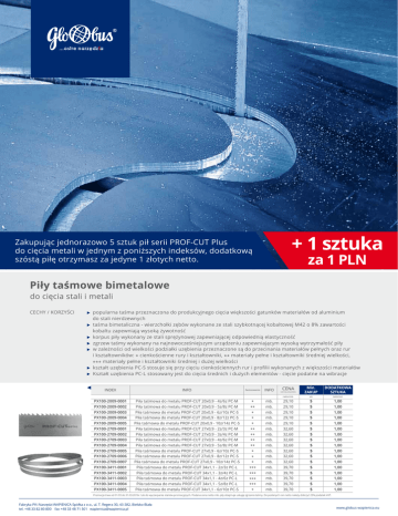 + 1 sztuka Zakupując jednorazowo 5 sztuk pił serii PROF-CUT Plus do cięcia metali w jednym z poniższych indeksów, dodatkową szóstą piłę otrzymasz za jedyne 1 złotych netto. za 1 PLN Piły taśmowe bimetalowe do cięcia stali i metali CECHY / KORZYŚCI popularna taśma przeznaczona do produkcyjnego cięcia większości gatunków materiałów od aluminium do stali nierdzewnych taśma bimetaliczna - wierzchołki zębów wykonane ze stali szybkotnącej kobaltowej M42 o 8% zawartości kobaltu zapewniają wysoką żywotność korpus piły wykonany ze stali sprężynowej zapewniającej odpowiednią elastyczność zgrzew taśmy wykonany na najnowocześniejszym urządzeniu zapewniającym wysoką wytrzymałość piły w zależności od wielkości podziałki uzębienia przeznaczone są do przecinania materiałów pełnych oraz rur i kształtowników: * cienkościenne rury i kształtowniki, ** materiały pełne i kształtowniki średniej wielkości, *** materiały pełne i kształtowniki średniej i dużej wielkości kształt uzębienia PC-S stosuje się przy cięciu cienkościennych rur i profilii wykonanych z większości materiałów Kształt uzębienia PC-L stosowany jest do cięcia średnich i dużych elementów - cięcie podatne na wibracje INDEX INFO Zastosowanie INFO PX100-2009-0001 PX100-2009-0002 PX100-2009-0003 PX100-2009-0004 PX100-2009-0005 PX100-2709-0001 PX100-2709-0002 PX100-2709-0003 PX100-2709-0004 PX100-2709-0005 PX100-2709-0006 PX100-2709-0007 PX100-3411-0001 PX100-3411-0002 PX100-3411-0003 PX100-3411-0004 PX100-3411-0005 Piła taśmowa do metalu PROF-CUT 20x0,9 - 4z/6z PC-M Piła taśmowa do metalu PROF-CUT 20x0,9 - 5z/8z PC-M Piła taśmowa do metalu PROF-CUT 20x0,9 - 6z/10z PC-S Piła taśmowa do metalu PROF-CUT 20x0,9 - 8z/12z PC-S Piła taśmowa do metalu PROF-CUT 20x0,9 - 10z/14z PC-S Piła taśmowa do metalu PROF-CUT 27x0,9 - 2z/3z PC-M Piła taśmowa do metalu PROF-CUT 27x0,9 - 3z/4z PC-M Piła taśmowa do metalu PROF-CUT 27x0,9 - 4z/6z PC-M Piła taśmowa do metalu PROF-CUT 27x0,9 - 5z/8z PC-M Piła taśmowa do metalu PROF-CUT 27x0,9 - 6z/10z PC-S Piła taśmowa do metalu PROF-CUT 27x0,9 - 8z/12z PC-S Piła taśmowa do metalu PROF-CUT 27x0,9 - 10z/14z PC-S Piła taśmowa do metalu PROF-CUT 34x1,1 - 2z/3z PC-L Piła taśmowa do metalu PROF-CUT 34x1,1 - 3z/4z PC-L Piła taśmowa do metalu PROF-CUT 34x1,1 - 4z/6z PC-L Piła taśmowa do metalu PROF-CUT 34x1,1 - 5z/8z PC-L Piła taśmowa do metalu PROF-CUT 34x1,1 - 6z/10z PC-S * ** * * * ** ** ** ** * * * *** *** *** *** * mb. mb. mb. mb. mb. mb. mb. mb. mb. mb. mb. mb. mb. mb. mb. mb. mb. CENA Min. ZAKUP DODATKOWA SZTUKA netto/mb. szt. netto/szt. 29,10 29,10 29,10 29,10 29,10 32,60 32,60 32,60 32,60 32,60 32,60 32,60 39,70 39,70 39,70 39,70 39,70 5 5 5 5 5 5 5 5 5 5 5 5 5 5 5 5 5 1,00 1,00 1,00 1,00 1,00 1,00 1,00 1,00 1,00 1,00 1,00 1,00 1,00 1,00 1,00 1,00 1,00 KATALOGOWA Promocja trwa od 01.03 do 31.03.2016r. lub do wyczerpania stanów promocyjnych. Podana cena netto mb. piły obejmuje usługę zgrzania taśmy. Do podanych cen netto należy doliczyć 23% podatek VAT. Fabryka Pił i Narzędzi WAPIENICA Spółka z o.o., ul. T. Regera 30, 43-382, Bielsko-Biała tel. +48 33 82 80 800 fax +48 33 48 71 501 [email protected] www.globus-wapienica.eu