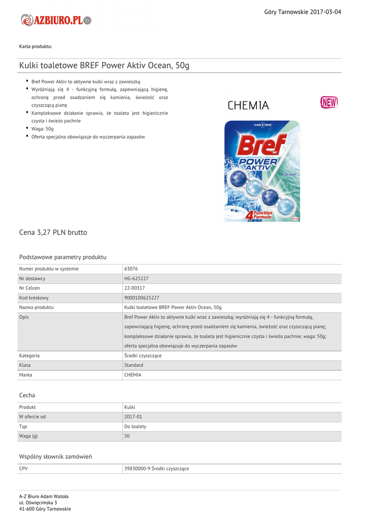 Góry Tarnowskie 2017-03-04 Karta produktu: Kulki toaletowe BREF Power Aktiv Ocean, 50g Bref Power Aktiv to aktywne kulki wraz z zawieszką Wyróżniają się 4 - funkcyjną formułą, zapewniającą higienę, ochronę przed osadzaniem się kamienia, świeżość oraz czyszczącą pianę Kompleksowe działanie sprawia, że toaleta jest higienicznie czysta i świeżo pachnie Waga: 50g Oferta specjalna obowiązuje do wyczerpania zapasów Cena 3,27 PLN brutto Podstawowe parametry produktu Numer produktu w systemie 63076 Nr dostawcy HG-625227 Nr Celcen 22-00317 Kod kreskowy 9000100625227 Nazwa produktu Kulki toaletowe BREF Power Aktiv Ocean, 50g Opis Bref Power Aktiv to aktywne kulki wraz z zawieszką; wyróżniają się 4 - funkcyjną formułą, zapewniającą higienę, ochronę przed osadzaniem się kamienia, świeżość oraz czyszczącą pianę; kompleksowe działanie sprawia, że toaleta jest higienicznie czysta i świeżo pachnie; waga: 50g; oferta specjalna obowiązuje do wyczerpania zapasów Kategoria Środki czyszczące Klasa Standard Marka CHEMIA Cecha Produkt Kulki W ofercie od 2017-01 Typ Do toalety Waga (g) 50 Wspólny słownik zamówień CPV A-Z Biuro Adam Watoła ul. Oświęcimska 3 41-600 Góry Tarnowskie 39830000-9 Środki czyszczące Góry Tarnowskie 2017-03-04 Karta katalogowa produktu cd. Kulki toaletowe BREF Power Aktiv Ocean, 50g Certyfikaty Hit Standard Nowy produkt w ofercie Nowość Serdecznie zapraszamy do współpracy A-Z Biuro Adam Watoła zespół. A-Z Biuro Adam Watoła ul. Oświęcimska 3 41-600 Góry Tarnowskie
