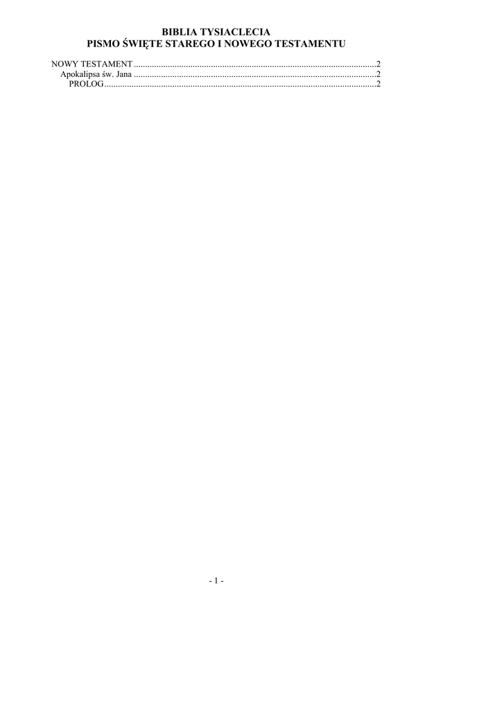 BIBLIA TYSIACLECIA PISMO ŚWIĘTE STAREGO I NOWEGO TESTAMENTU NOWY TESTAMENT ...........................................................................................................2 Apokalipsa św. Jana ...........................................................................................................2 PROLOG........................................................................................................................2 -1- BIBLIA TYSIACLECIA PISMO ŚWIĘTE STAREGO I NOWEGO TESTAMENTU NOWY TESTAMENT Apokalipsa św. Jana PROLOG 1 1 Objawienie Jezusa Chrystusa, które dał Mu Bóg, aby ukazać swym sługom, co musi stać się niebawem1, a On wysławszy swojego anioła oznajmił przez niego za pomocą znaków słudze swojemu Janowi. 2 Ten poświadcza, Ŝe słowem BoŜym i świadectwem Jezusa Chrystusa jest wszystko, co widział. 3 Błogosławiony, który odczytuje, i którzy słuchają słów Proroctwa, a strzegą tego, co w nim napisane, bo chwila jest bliska. Komentarz [THpZ1]: Wyroki BoŜe spełnią się niezawodnie (por. Dn 2,28) i to - z punktu widzenia BoŜego (por. 2 P 3,8) juŜ niebawem. LISTY "DO SIEDMIU KOŚCIOŁÓW, KTÓRE SĄ W AZJI" Adres 4 Jan do siedmiu Kościołów, które są w Azji: Łaska wam i pokój od Tego, Który jest, i Który był i Który przychodzi2, i od Siedmiu Duchów2, które są przed Jego tronem, 5 i od Jezusa Chrystusa, Świadka Wiernego, Pierworodnego umarłych i Władcy królów ziemi3. Temu, który nas miłuje i który przez swą krew uwolnił nas od naszych grzechów, 6 i uczynił nas królestwem - kapłanami4 dla Boga i Ojca swojego, Jemu chwała i moc na wieki wieków! Amen. 7 Oto nadchodzi z obłokami, i ujrzy Go wszelkie oko i wszyscy, którzy Go przebili. I będą Go opłakiwać wszystkie pokolenia ziemi5. Tak: Amen. -2- Komentarz [THpZ2]: "Który... przychodzi" - Bóg objawiony (por. Wj 3,14), zbliŜający się na sąd; "Siedmiu Duchów": siedmioraki w darach Duch Święty. Inni widzą tu siedmiu archaniołów. Komentarz [THpZ3]: - Ps 89[88],38.28; Kol 1,18 Komentarz [THpZ4]: Mowa o powszechnym kapłaństwie wiernych, na wzór Izraela (por. Wj 19,6; 1 P 2,5.9). Komentarz [THpZ5]: Chrystus -Sędzia spełni proroctwo Dn 7,13; Za 12,10.14, wywołując wyrzuty sumienia u winowajców. BIBLIA TYSIACLECIA PISMO ŚWIĘTE STAREGO I NOWEGO TESTAMENTU 8 Jam jest Alfa i Omega6, mówi Pan Bóg, Który jest, Który był i Który przychodzi, Wszechmogący. Widzenie wstępne 9 Ja, Jan, wasz brat i współuczestnik w ucisku i królestwie, i wytrwałości w Jezusie, byłem na wyspie, zwanej Patmos, z powodu słowa BoŜego i świadectwa Jezusa7. 10 Doznałem zachwycenia w dzień Pański8 i posłyszałem za sobą potęŜny głos jak gdyby trąby 11 mówiącej: «Co widzisz, napisz w księdze i poślij siedmiu Kościołom: do Efezu, Smyrny, Pergamonu, Tiatyry, Sardów, Filadelfii i Laodycei»9. 12 I obróciłem się, by widzieć, co za głos do mnie mówił; a obróciwszy się, ujrzałem siedem złotych świeczników, 13 i pośród świeczników kogoś podobnego do Syna Człowieczego10, obleczonego [w szatę] do stóp i przepasanego na piersiach złotym pasem. 14 Głowa Jego i włosy - białe jak biała wełna, jak śnieg, a oczy Jego jak płomień ognia. 15 Stopy Jego podobne do drogocennego metalu, jak gdyby w piecu rozŜarzonego, a głos Jego jak głos wielu wód. 16 W prawej swej ręce miał siedem gwiazd i z Jego ust wychodził miecz obosieczny, ostry. A Jego wygląd - jak słońce, kiedy jaśnieje w swej mocy. 17 Kiedym Go ujrzał, do stóp Jego upadłem jak martwy, a On połoŜył na mnie prawą rękę, mówiąc: Chrystus-Sędzia spełni proroctwo Dn 7,13; Za 12,10.14, wywołując wyrzuty sumienia u winowajców. 8 Ap 1, 8 - Pierwsza i ostatnia litera alfabetu gr. - symbol Boga jako praprzyczyny i celu ostatecznego wszechrzeczy (Ap 21,6; Ap 22,13). 7 9 Ap 1, 9 - Aluzja do karnego zesłania (zob. Wstęp). 10 Ap 1, 10 - Tj. w niedzielę. -3- BIBLIA TYSIACLECIA PISMO ŚWIĘTE STAREGO I NOWEGO TESTAMENTU «Przestań się lękać! Jam jest Pierwszy i Ostatni 18 i Ŝyjący. Byłem umarły, a oto jestem Ŝyjący na wieki wieków i mam klucze śmierci i Otchłani11. 19 Napisz więc to, co widziałeś, i to, co jest, i to, co potem musi się stać12. 20 Co do tajemnicy siedmiu gwiazd, które ujrzałeś w mojej prawej ręce, i co do siedmiu złotych świeczników: siedem gwiazd - to są Aniołowie13 siedmiu Kościołów, a siedem świeczników - to jest siedem Kościołów. 11 Ap 1, 11 - Siedem dobrze Apostołowi znanych Kościołów lokalnych, leŜących na drodze okrąŜającej najludniejsze okolice Azji Mniejszej. W symbolicznej tej siódemce naleŜy widzieć Kościół powszechny wszystkich czasów. 12 Ap 1, 13-16 - Uwielbiony Chrystus, odmalowany rysami zapoŜyczonymi z Dn 7,9.13; Dn 10,5n i Ez 43,2, ukazuje się jako król, arcykapłan, sędzia i władca Kościoła. 13 Ap 1, 18 - Odpowiednik hebr. Szeolu: Chrystus zmartwychwstały panuje i nad zmarłymi. -4-