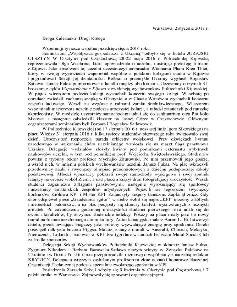 Warszawa, 2 stycznia 2017 r. Droga Koleżanko! Drogi Kolego! Wspomnijmy nasze wspólne przedsięwzięcia 2016 roku. Seminarium „Współpraca gospodarcza z Ukrainą” odbyło się w hotelu JURAJSKI OLSZTYN W Olsztynie pod Częstochową 20-22 maja 2016 r. Politechnikę Kijowską reprezentowała Olga Wachrina, która opowiedziała o uczelni, ilustrując prelekcję filmami z Kijowa. Jako absolwent tej uczelni uczestniczył ambasador Wietnamu Pham Kien Thiet, który w swojej wypowiedzi wspomniał wspólne z polskimi kolegami studia w Kijowie i pogratulował Sekcji jej działalności. Referat o przemyśle Ukrainy wygłosił Bogusław Satława. Janusz Fuksa poinformował o handlu między obu krajami. Uczestnicy otrzymali 31. broszurę z cyklu Wspomnienia z Kijowa z ewidencją wychowanków Politechniki Kijowskiej. W piątek wieczorem podczas kolacji wysłuchali koncertu swojego kolegi. W sobotę po obradach zwiedzili ruchomą szopkę w Olsztynie, a w Chacie Wójtówka wysłuchali koncertu zespołu ludowego. Weszli na wzgórze z ruinami zamku średniowiecznego. Wieczorem wspominali macierzystą uczelnię podczas uroczystej kolacji, a młodsi zatańczyli pod muzykę akordeonisty. W niedzielę uczestnicy samochodami udali się do sanktuarium ojca Pio koło Mstowa, a następnie odwiedzili klasztor na Jasnej Górze w Częstochowie. Głównymi organizatorami seminarium byli Barbara i Bogusław Satławowie. W Politechnice Kijowskiej (od 17 sierpnia 2016 r. noszącej imię Igora Sikorskiego) na placu Wiedzy 31 sierpnia 2016 r. kilka tysięcy studentów pierwszego roku świętowało swój dzień. Uroczystość rozpoczęła parada orkiestry wojskowej. Przy dźwiękach hymnu narodowego w wykonaniu chóru uczelnianego wzniosła się na maszt flaga państwowa Ukrainy. Delegacje wydziałów złożyły kwiaty pod pomnikami czternastu wybitnych naukowców uczelni, w tym pod pomnikiem prof. Wojciecha Świętosławskiego. Studentów powitał z trybuny rektor profesor Mychajło Zhurowski. Po nim przemówili jego goście, a wśród nich, w imieniu polskich wychowanków uczelni, Janusz Fuksa. Na plac wkroczyli przodownicy nauki i zwycięzcy olimpiad przedmiotowych z dziećmi podopiecznej szkoły podstawowej. Młodzi wynalazcy pokazali swoje samochody wyścigowe i swój sputnik latający na orbicie wokół Ziemi, a nad placem krążył dron fotografujący uroczystość. Weszli studenci zagraniczni z flagami państwowymi, następnie wyróżniający się sportowcy i uczestnicy amatorskich zespołów artystycznych. Pojawili się tegoroczni zwycięzcy konkursów Królowa KPI i Mister KPI. Zatańczyły zespoły taneczne. Zapłonął znicz. Gdy chór odśpiewał pieśń „Gaudeamus igitur”, w niebo wzbił się napis „KPI” ułożony z żółtych i niebieskich baloników, a na plac posypały się chmury konfetti wystrzelonych z licznych armatek. Po zakończeniu godzinnej uroczystości studenci pierwszego roku udali się do swoich fakultetów, by otrzymać studenckie indeksy. Pokazy na placu miały jako tło nowy mural na ścianie uczelnianego domu kultury. Autor kanadyjski malarz Aaron Li-Hill stworzył dzieło, przedstawiające biegaczy jako protony wyzwalające energię przy spotkaniu. Dzieło poświęcił odkryciu bozonu Higgsa. Malarz, znany z murali w Australii, Chinach, Meksyku, Niemczech, Tajlandii, pracował w KPI dwa tygodnie w ramach festiwalu Mural Social Club za środki sponsorów. Delegacja Sekcji Wychowanków Politechniki Kijowskiej w składzie Janusz Fuksa, Zygmunt Nikodem i Barbara Borowska-Satława złożyła wizyty w Związku Polaków na Ukrainie i w Domu Polskim oraz przeprowadziła rozmowę o współpracy z naczelną redaktor KRYNICY. Delegacja wręczyła zasłużonym profesorom złote odznaki honorowe Naczelnej Organizacji Technicznej podczas specjalnie zwołanego spotkania w KPI. Posiedzenia Zarządu Sekcji odbyły się 9 kwietnia w Olsztynie pod Częstochową i 7 października w Warszawie. Zajmowały się sprawami organizacyjnymi. Zarząd Sekcji Wychowanków Politechniki Kijowskiej zaprasza w br. do udziału w przedsięwzięciach Sekcji. Prosimy starostów grup, by zachęcili do tego Koleżanki i Kolegów. 1. Seminarium Współpraca gospodarcza z Ukrainą organizujemy 19-21 maja 2017 r. w Iwoniczu-Zdroju koło Krosna, uwzględniając w programie w sobotę zwiedzanie skansenu Muzeum Przemysłu Naftowego w Bóbrce i zabytków Dukli, a w niedzielę zwiedzanie starówki Krosna i muzeum szklarstwa. Koszt pobytu z wyżywieniem w 2-osobowym pokoju pensjonatu dla wpłacających do końca kwietnia wynosi 240 zł od osoby. Konto organizatorów udostępnimy zainteresowanym, którzy do końca marca zgłoszą się poprzez witrynę: http://swpk.republika.pl, elektronicznie na adres: [email protected] albo pocztą na adres: FSNT NOT (SWPK), ul. T. Czackiego 3/5, 00-043 Warszawa (tel. +22-3361270, 3361468, fax 3361481). Opłatę można będzie wnieść także na listę u przewodniczącego lub skarbnika. W wyjątkowych przypadkach możliwe będzie opłacenie (260 zł) na miejscu, po telefonicznym uzgodnieniu z organizatorami. 2. Do Kijowa wyjedzie delegacja Sekcji, by uczestniczyć w uroczystości inauguracji nowego roku nauki w dniu 31 sierpnia br. Przejazd i pobyt – na koszt własny. Prosimy o powiadomienie Zarządu Sekcji o chęci uczestniczenia w delegacji. 3. Jesienią 2017 r. upłynie 60 lat działalności SWPK w ramach NOT. Sądzę, że uczcimy tę rocznicę na październikowym rozszerzonym posiedzeniu Zarządu Sekcji w Warszawie. Dobrowolną składkę roczną (np. 12 zł) można wpłacić podczas seminarium lub przelać na konto jego organizatorów. List ten wysyłamy na posiadane adresy wychowanków Politechniki Kijowskiej, przy czym corocznie rozszerzamy korespondencję mejlową, redukując wysyłkę tradycyjną pocztą o adresy uznane za nieaktualne ze względu na zwroty lub brak odzewu od kilkunastu lat. Zarząd dziękuje za dotychczasową społeczną działalność w Sekcji i zaprzyjaźnionych 
