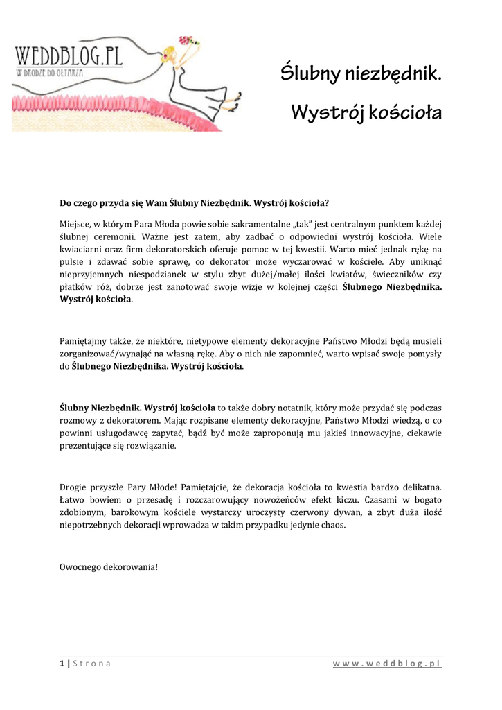 Do czego przyda się Wam Ślubny Niezbędnik. Wystrój kościoła? Miejsce, w którym Para Młoda powie sobie sakramentalne „tak” jest centralnym punktem każdej ślubnej ceremonii. Ważne jest zatem, aby zadbać o odpowiedni wystrój kościoła. Wiele kwiaciarni oraz firm dekoratorskich oferuje pomoc w tej kwestii. Warto mieć jednak rękę na pulsie i zdawać sobie sprawę, co dekorator może wyczarować w kościele. Aby uniknąć nieprzyjemnych niespodzianek w stylu zbyt dużej/małej ilości kwiatów, świeczników czy płatków róż, dobrze jest zanotować swoje wizje w kolejnej części Ślubnego Niezbędnika. Wystrój kościoła. Pamiętajmy także, że niektóre, nietypowe elementy dekoracyjne Państwo Młodzi będą musieli zorganizować/wynająć na własną rękę. Aby o nich nie zapomnieć, warto wpisać swoje pomysły do Ślubnego Niezbędnika. Wystrój kościoła. Ślubny Niezbędnik. Wystrój kościoła to także dobry notatnik, który może przydać się podczas rozmowy z dekoratorem. Mając rozpisane elementy dekoracyjne, Państwo Młodzi wiedzą, o co powinni usługodawcę zapytać, bądź być może zaproponują mu jakieś innowacyjne, ciekawie prezentujące się rozwiązanie. Drogie przyszłe Pary Młode! Pamiętajcie, że dekoracja kościoła to kwestia bardzo delikatna. Łatwo bowiem o przesadę i rozczarowujący nowożeńców efekt kiczu. Czasami w bogato zdobionym, barokowym kościele wystarczy uroczysty czerwony dywan, a zbyt duża ilość niepotrzebnych dekoracji wprowadza w takim przypadku jedynie chaos. Owocnego dekorowania! 1|Strona www.weddblog.pl Wystrój kościoła: Element wystroju Krótki opis Potrzebna ilość Cena Firma Data dekorująca/ zwrotu wynajmująca dekoracji Dekoracje głównej i bocznych naw Poduszeczki na klęczniki Sprzęt audio Świeczniki Świece Miejsce dla Pary Młodej (krzesła i dekoracja klęcznika) Dodatkowe pokrowce na krzesła Szarfy do dekoracji ławek Kwiaty, łuki kwiatowe Poduszeczka na obrączki Notatki: Rodzaj i kolor kwiatów do dekoracji ………………………………………………………………………………………… ………………………………………………………………………………………………………………………………………………... Typy wiązanek do dekoracji ławek …………………………………………………………………………………………... ………………………………………………………………………………………………………………………………………………... Inne pomysły ………………………………………………………………………………………………………………………….. ………………………………………………………………………………………………………………………………………………... 2|Strona www.weddblog.pl