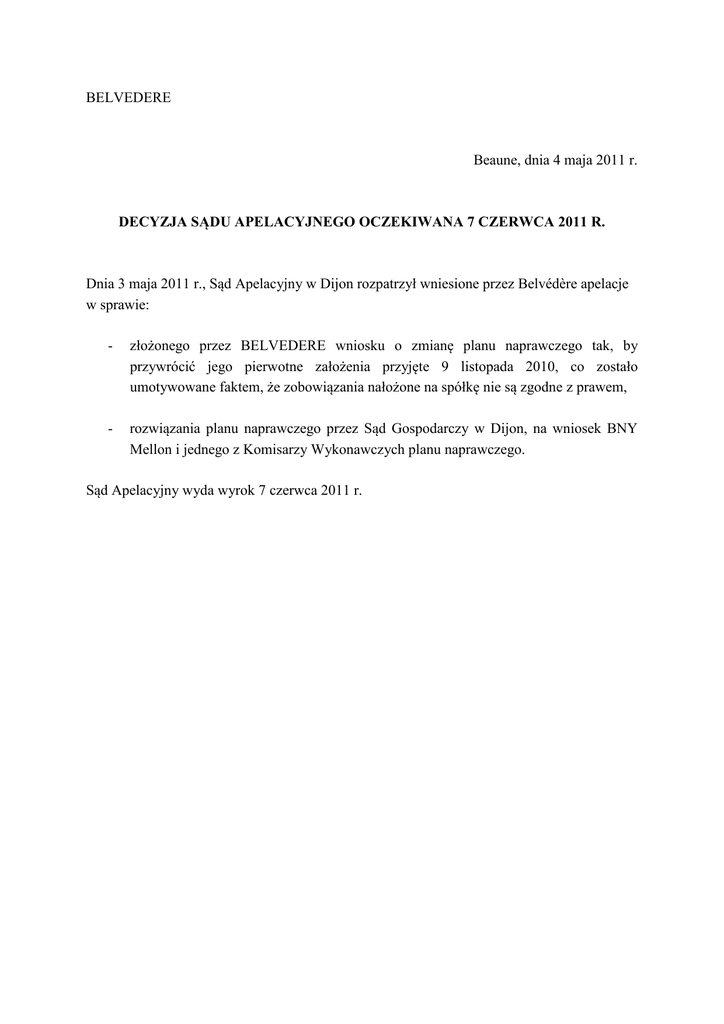 BELVEDERE Beaune, dnia 4 maja 2011 r. DECYZJA SĄDU APELACYJNEGO OCZEKIWANA 7 CZERWCA 2011 R. Dnia 3 maja 2011 r., Sąd Apelacyjny w Dijon rozpatrzył wniesione przez Belvédère apelacje w sprawie: - złożonego przez BELVEDERE wniosku o zmianę planu naprawczego tak, by przywrócić jego pierwotne założenia przyjęte 9 listopada 2010, co zostało umotywowane faktem, że zobowiązania nałożone na spółkę nie są zgodne z prawem, - rozwiązania planu naprawczego przez Sąd Gospodarczy w Dijon, na wniosek BNY Mellon i jednego z Komisarzy Wykonawczych planu naprawczego. Sąd Apelacyjny wyda wyrok 7 czerwca 2011 r.