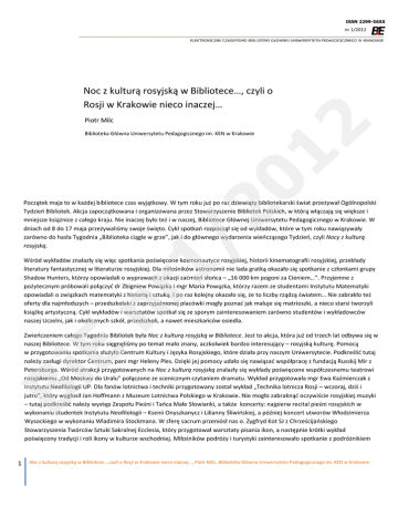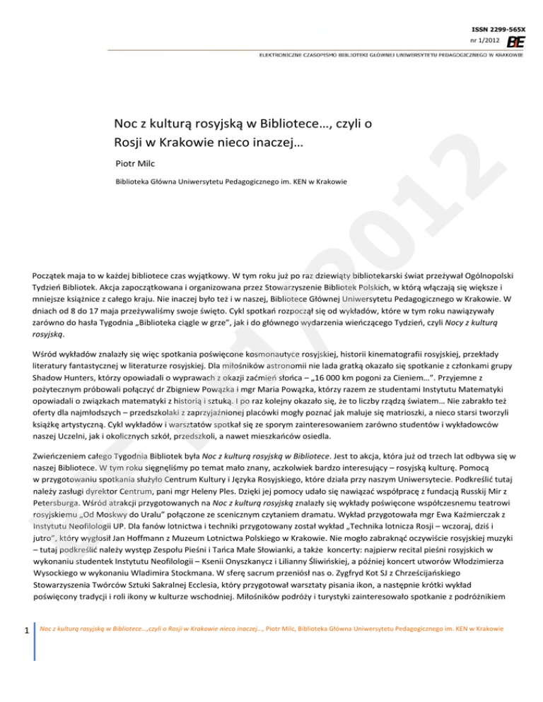 ISSN 2299-565X nr 1/2012 Piotr Milc 01 Biblioteka Główna Uniwersytetu Pedagogicznego im. KEN w Krakowie 2 Noc z kulturą rosyjską w Bibliotece…, czyli o Rosji w Krakowie nieco inaczej… nr 1/ 2 Początek maja to w każdej bibliotece czas wyjątkowy. W tym roku już po raz dziewiąty bibliotekarski świat przeżywał Ogólnopolski Tydzień Bibliotek. Akcja zapoczątkowana i organizowana przez Stowarzyszenie Bibliotek Polskich, w którą włączają się większe i mniejsze książnice z całego kraju. Nie inaczej było też i w naszej, Bibliotece Głównej Uniwersytetu Pedagogicznego w Krakowie. W dniach od 8 do 17 maja przeżywaliśmy swoje święto. Cykl spotkań rozpoczął się od wykładów, które w tym roku nawiązywały zarówno do hasła Tygodnia „Biblioteka ciągle w grze”, jak i do głównego wydarzenia wieńczącego Tydzień, czyli Nocy z kulturą rosyjską. Wśród wykładów znalazły się więc spotkania poświęcone kosmonautyce rosyjskiej, historii kinematografii rosyjskiej, przekłady literatury fantastycznej w literaturze rosyjskiej. Dla miłośników astronomii nie lada gratką okazało się spotkanie z członkami grupy Shadow Hunters, którzy opowiadali o wyprawach z okazji zaćmień słońca – „16 000 km pogoni za Cieniem…”. Przyjemne z pożytecznym próbowali połączyć dr Zbigniew Powązka i mgr Maria Powązka, którzy razem ze studentami Instytutu Matematyki opowiadali o związkach matematyki z historią i sztuką. I po raz kolejny okazało się, że to liczby rządzą światem… Nie zabrakło też oferty dla najmłodszych – przedszkolaki z zaprzyjaźnionej placówki mogły poznać jak maluje się matrioszki, a nieco starsi tworzyli książkę artystyczną. Cykl wykładów i warsztatów spotkał się ze sporym zainteresowaniem zarówno studentów i wykładowców naszej Uczelni, jak i okolicznych szkół, przedszkoli, a nawet mieszkańców osiedla. Bi E Zwieńczeniem całego Tygodnia Bibliotek była Noc z kulturą rosyjską w Bibliotece. Jest to akcja, która już od trzech lat odbywa się w naszej Bibliotece. W tym roku sięgnęliśmy po temat mało znany, aczkolwiek bardzo interesujący – rosyjską kulturę. Pomocą w przygotowaniu spotkania służyło Centrum Kultury i Języka Rosyjskiego, które działa przy naszym Uniwersytecie. Podkreślić tutaj należy zasługi dyrektor Centrum, pani mgr Heleny Ples. Dzięki jej pomocy udało się nawiązać współpracę z fundacją Russkij Mir z Petersburga. Wśród atrakcji przygotowanych na Noc z kulturą rosyjską znalazły się wykłady poświęcone współczesnemu teatrowi rosyjskiemu „Od Moskwy do Uralu” połączone ze scenicznym czytaniem dramatu. Wykład przygotowała mgr Ewa Kaźmierczak z Instytutu Neofilologii UP. Dla fanów lotnictwa i techniki przygotowany został wykład „Technika lotnicza Rosji – wczoraj, dziś i jutro”, który wygłosił Jan Hoffmann z Muzeum Lotnictwa Polskiego w Krakowie. Nie mogło zabraknąć oczywiście rosyjskiej muzyki – tutaj podkreślić należy występ Zespołu Pieśni i Tańca Małe Słowianki, a także koncerty: najpierw recital pieśni rosyjskich w wykonaniu studentek Instytutu Neofilologii – Ksenii Onyszkanycz i Lilianny Śliwińskiej, a później koncert utworów Włodzimierza Wysockiego w wykonaniu Wladimira Stockmana. W sferę sacrum przeniósł nas o. Zygfryd Kot SJ z Chrześcijańskiego Stowarzyszenia Twórców Sztuki Sakralnej Ecclesia, który przygotował warsztaty pisania ikon, a następnie krótki wykład poświęcony tradycji i roli ikony w kulturze wschodniej. Miłośników podróży i turystyki zainteresowało spotkanie z podróżnikiem 1 Noc z kulturą rosyjską w Bibliotece…,czyli o Rosji w Krakowie nieco inaczej…, Piotr Milc, Biblioteka Główna Uniwersytetu Pedagogicznego im. KEN w Krakowie ISSN 2299-565X nr 1 (10)/2012 ISSN 1507‐7188 nr 1 (10)/2012 ISSN nr 1/2012 1507‐7188 Romualdem Koperskim, który przedstawił swoje ciekawe historie z syberyjskich eskapad, dodatkowo ilustrując to ciekawymi zdjęciami, które pozwalały przenieść się w klimat tamtych miejsc. O związkach Polaków z Rosją i Syberią i o swoich wędrówkach opowiadał prof. Mariusz Wołos z Instytutu Historii UP. Wykład „Syberyjskie i uralskie wędrówki uczonego” zgromadził spore audytorium pragnące poznać życie mieszkańców tych dalekich terenów takie, jakim jest ono na co dzień. Dopełnieniem wieczoru były dwa wydarzenia: koncert zespołu Dzikie Pola, a także spektakl „Dworzec dla dwojga” w wykonaniu Teatru Nikoli. Bi E nr 1/ 2 01 2 Rosyjskiej Nocy i atrakcjom z nią związanym towarzyszyły też liczne wystawy, m.in. rosyjskiej techniki lotniczej, zdjęć Romualda Koperskiego z Syberii, rosyjskiej sztuki ludowej, oraz książek ze zbiorów Biblioteki Głównej, Biblioteki Instytutu Neofilologii, a także Centrum Kultury i Języka Rosyjskiego. Kilkumiesięczne przygotowania uwieńczone zostały sukcesem. A świadczyć o tym może zadowolenie naszych gości – rosyjskiego Attache Konsularnego Igora Kowaliowa, władz naszej Uczelni – Rektora ds. Nauki i Współpracy Zagranicznej prof. Tadeusza Budrewicza i Kanclerza UP mgr Jana Kałużnego, pracowników i studentów naszej i innych krakowskich Uczelni, m.in. studentów teatrologii UJ, oraz uczniów okolicznych szkół czy mieszkańców sąsiednich domów. Wszyscy uczestnicy podkreślali, że zorganizowanie takiej Nocy było bardzo dobrym pomysłem i pozwoliło odkryć nieznane dotychczas związki Polski z Rosją. Po ubiegłorocznej japońskiej Nocy…, tegorocznej rosyjskiej kulturze pora sięgnąć po coś z zachodu Europy. Kto wie, może w przyszłym roku wybierzemy się na odkrywanie Hiszpanii… 2 Noc z kulturą rosyjską w Bibliotece…,czyli o Rosji w Krakowie nieco inaczej…, Piotr Milc, Biblioteka Główna Uniwersytetu Pedagogicznego im. KEN w Krakowie