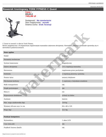 Informacje o produkcie Utworzono 04-03-2017 Rowerek treningowy YORK FITNESS C Quest Cena : 899,00 zł 749,00 zł er m ar k Dostępność : Na zamówienie Stan magazynowy : wysoki Średnia ocena : brak recenzji C Quest to nowość w ofercie York Fitness. Rower magnetyczny z 8-stopniowym regulowanym manualnie zakresem obciążenia. Niewielkie gabaryty doskonale sprawdzą się w niewielkich pomieszczeniach. Dane ogólne Model C Quest Parametry techniczne System hamowania Zakres obciążenia magnetyczny 1-8 z regulacją manualną Kierownica regulowana przez pochylenie Siedzisko z regulacją pionową i poziomą sensory dotykowe at Pomiar tętna 1 częściowy z łożyskiem-wiankiem Rolki transportowe tak Stopki poziomujące tak w Mechanizm korbowy Klasa A nie Wyposażenie dodatkowe uchwyt na bidon Zasilanie baterie Max. waga użytkownika (kg) 120 kg Wymiary (dł.szer.wys.) w cm 84 x 48 x 120 Waga (kg) 22,5 kg Funkcje komputera Wyświetlacz 1 okno LCD Czas (min,sek) tak Prędkość liniowa (km/h) tak Wygenerowano w programie www.oscGold.com tak Dystans (km) tak Wydatek energetyczny (cal) tak Tętno (ud./min.) tak Moc (Wat) nie Temperatura otoczenia w trybie stand-by nie Zegar w trybie stand-by nie Kalendarz w trybie stand-by nie Sygnalizacja przekroczenia tętna max. tak Programowanie danych użytkownika - Automatyczny dobór stref treningowych tętna - Programy treningowe ogółem 4 Program manualny Program celowy er m ar k Prędkość obrotowa (obr./min.) tak zorientowany na czas, dystans, kalorie Program predefiniowany Program sterowany tętnem Program sterowany mocą Program użytkownika Test sprawności - 1 - w at Inne
