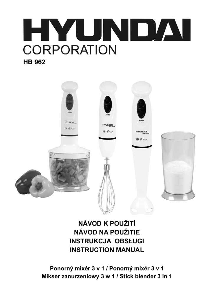 HB 962 NÁVOD K POUŽITÍ NÁVOD NA POUŽITIE INSTRUKCJA OBSŁUGI INSTRUCTION MANUAL Ponorný mixér 3 v 1 / Ponorný mixér 3 v 1 Mikser zanurzeniowy 3 w 1 / Stick blender 3 in 1 Vážený zákazníku, děkujeme Vám za zakoupení našeho produktu. Před uvedením tohoto přístroje do provozu si velmi pozorně přečtěte návod k obsluze a tento návod spolu se záručním listem, pokladním dokladem a podle možností i s obalem a vnitřním obsahem obalu dobře uschovejte. Všeobecné bezpečnostní pokyny • Používejte tento přístroj výlučně pro soukromou potřebu a pro stanovené účely. Tento přístroj není určen pro komerční použití. • Chraňte jej před horkem, přímým slunečním zářením, vlhkostí (v žádném případě jej neponořujte do kapalin) a stykem s ostrými hranami. Nepoužívejte přístroj v případě, že máte vlhké ruce. Jestliže dojde k navlhčení nebo namočení přístroje, okamžitě vytáhněte zástrčku ze zásuvky. Vyvarujte se styku s vodou. • Přístroj vypněte a vždy vytáhněte zástrčku ze zásuvky (tahejte jen za zástrčku, nikdy ne za kabel), jestliže nebudete přístroj používat, chcete-li namontovat příslušenství, přístroj vyčistit nebo v případě poruchy. • Přístroj nesmí zůstat v provozu bez dozoru. Jestliže musíte pracoviště opustit, vždy přístroj vypněte, resp. vytáhněte zástrčku ze zásuvky (vždy tahejte za zástrčku, nikdy ne za kabel). • Abyste ochránili děti před riziky spojenými s elektrickými přístroji, postarejte se o to, aby kabel nevisel dolů a děti na přístroj nedosáhly. • Pravidelně kontrolujte přístroj a přívodní kabel z hlediska poškození. Jestliže přístroj vykazuje nějakou závadu, neuvádějte jej do provozu. • Neopravujte přístroj vlastními silami, vyhledejte autorizovaný servis. • Používejte jen originální příslušenství. • Respektujte, prosím, následující „Speciální bezpečnostní pokyny pro tento přístroj“. Speciální bezpečnostní pokyny pro tento přístroj • Před připojením do zásuvky zkontrolujte, zda napětí vaší elektrické sítě odpovídá napětí uvedenému na štítku přístroje. • Před sestavováním, demontováním a čištěním přístroj vždy vytáhněte ze zásuvky. • Motor, kabel a zástrčku chraňte před vlhkostí. • Nikdy nepoužívejte poškozený přístroj. Je-li poškozen, odneste jej prosím do autorizovaného servisního centra na kontrolu nebo opravu. • Nenechávejte napájecí kabel viset přes hrany desky stolu nebo pracovní plochy nebo dotýkat se horkých ploch. • Přístroj nepřipojujte do zásuvky dokud není úplně sestaven a vždy jej vypojte před demontováním nebo nasazováním příslušenství. • Přístroj je vyroben pro zpracování běžného množství potravin v domácnosti. • Před změnou příslušenství nebo přiblížení se k částem, které se pohybují, přístroj vypněte. • Nedotýkejte se ostří nože. • Nůž je velmi ostrý! Zacházejte s ním opatrně. • Mixér je určen ke krátkodobému provozu. Zařízení nepoužívejte déle než 2 minuty, při práci s tvrdými přísadami ne déle než 15 sekund. • Tento spotřebič není určen pro používání osobami (včetně dětí), jimž fyzická, smyslová, nebo mentální neschopnost či nedostatek zkušeností a znalostí zabraňuje v bezpečném používání spotřebiče, pokud na ně nebude dohlíženo nebo pokud nebyly instruovány ohledně použití spotřebiče osobou zodpovědnou za jejich bezpečnost. • Děti by měli být vždy pod dohledem, aby se zamezilo jejich hraní s tímto přístrojem. CZ - CZ Popis ovládacích prvků P1 P2 P3 P4 P5 P6 Jednotka motoru Spínač I - rychlost 1 Spínač II - Turbo = nejvyšší rychlost Nástavec pro mixování Pracovní nádoba Nástavec pro sekací nůž -víko P7 P8 P9 P10 P11 Sekací nůž Nádoba na sekání Šlehací metla Nástavec pro šlehací metlu Stojánek na zeď pro uskladnění Pokyny k použití Nasazování příslušenství Nástavec vložte do otvoru jednotky motoru tak, aby šipka směřovala na otevřený zámek (obr.1). Potom zašroubujte tento daný nástavec ve směru označeném symbolem uzamčeného zámku (Obr 2). Použijte pouze mírný tlak pro kontrolu, zda je nástavec pevně zajištěn v jednotce motoru. Při demontáži nástavce proveďte opačný postup. Obr.1 CZ - Obr.2 Jak používat ponorný mixér Ponorný mixér je výborný pro přípravu krémů, omáček, polévek, majonéz a dětské výživy, stejně jako pro koktejly a míchané nápoje. 1) Nástavec pro mixování P4 nasaďte na jednotku P1 podle popisu „Nasazování příslušenství“ Pozor, nůž nástavce pro mixování je velmi ostrý. Dejte pozor, abyste se nepořezali během čištění. 2) Vložte nástavec pro mixování do nádoby. Stiskněte spínač I (P2) pro použití rychlosti I nebo spínač II (P3) pro rychlost Turbo. 3) Ponorný mixér můžete používat v odměrné nádobě a také v jakékoliv jiné nádobě. Při šlehání přímo v hrnci během vaření chraňte šlehač před přehřátím. 4) Po použití demontujte nástavec z jednotky motoru pro snadnější uskladnění. Jak používat sekací nůž Sekací nůž je ideální pro tvrdé potraviny, například sýr, cibuli, byliny, česnek, mrkev, oříšky, mandle, sušeně švestky atd. Nesekejte velmi tvrdé potraviny, například muškátový oříšek, kávová zrna a obiloviny. 1) Výstraha: Nůž je velmi ostrý! Držte je vždy za horní plastovou část. 2) Nasaďte sekací nůž P7 na středový kolík nádoby na sekání P8. Nádobu na sekání vždy postavte na neklouzavou podložku. 3) Do nádoby na sekání vložte potraviny. 4) Položením a pootočením připevněte na nádobu na sekání nástavec pro sekací nůž - víko P6. 5) Jednotku motoru P1 nasaďte podle popisu „Nasazování příslušenství