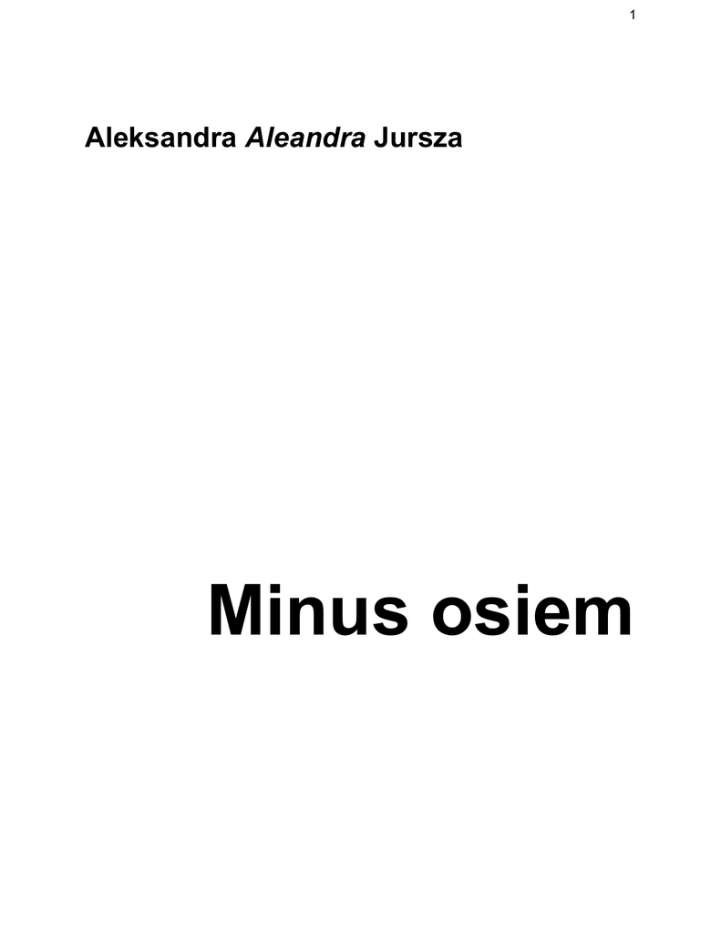 1 Aleksandra Aleandra Jursza Minus osiem 2 I. Psychia(s)tryk *** Przysiadł starzec na murawie Złapał wzrok niepokornej młodości Posnuł opowieść o błędach człowieczych Struny głosowe darmo śpiewały przestrogi Siadła (jeszcze) młodość na murawie Zapłakawszy nad losem rówieśników Owinęła się rozpaczliwym krzykiem Niewidzialnym Przysiadł starzec na murawie Machnąwszy ramionami Usiadł… Uśmiechnął się do wysokich niebios Powziął myśl tylko dla siebie Jaką? Niewiadoma, ale może życzył młodszym piękniejszych lat Ale może może tylko pomyślał Nie daj uciec przeznaczeniu. 16.12.2013 3 WYBÓR Nie mogę ciągnąć dwóch nitek naraz Już przeszło zachłanne krwiste dno. Dzień jasny nieskalany nadszedł kiedy Czy moja czerń skróciła się do jednego? Rzucam rozstrojony cień na wyblakłą kolorową ścianę Dłonie wędrujące po murze obitym czasem Coś winno wskazać kierunek Czyja to droga? Dowiem się o zbyt późnej porze Z wizji młodości zostaną Płatki rozsypanych wspomnień na ulicy albo spleśniałe pudełka Czas błagam beskutecznie (Dusza wiecznie czegoś chce). 4 *** Zagracony czas Biegnie przestrzeń szaleńczo Trwa Pochylona Potrącając nas co dnia 5 BEZPOKORNIE MYŚLĘ (przez tworzenie). Poszłam na spacer. Tąpnęłam w realizm skruszony. Ogarnięta przez chaotyczny obrazek czterech skrawków świata pijana jak na dzień dobry Nowego Roku Zużytek wszystkie prezerwatywy kondomy bela. Szukam resztek bezdomnych marzeń. Ułomnych snów. Ponoć mgłą owinięte leżą na śmietnikach. Dziwnie dziwne łzy mnie nachodzą. Karnie karzą skarać mnie. (Kogo rozkaz nie wiem). Wycieńczona rozszukaniem Przezagraciłam bałagańskie twierdzenie Na przestrzeni rozsadzone wnęki drzew Znalazłam w nich hotelowy długopis. Przeniknięta ostromyślami wszędzie zawsze ogólnie TUTAJ tapetuję las swymi słowy. W końcu wróciłam pod drzwi może kiedyś zrosnę się ze światem. (Czekam). 6 PSYCHIATRYK Depresja mnie przeszywa Trafiam do psychiatryka. Tu nie ma białych zawiązywanych rękawów elektrowstrząsy rdzewieją. Tu samotność maskowana wiecznym towarzystwem nadzieje z kruchego naczynia. Polski psychiatryk Znudzony, wierzący, śniący O niezłomnej pięknej Wieczności. 7 ANKA Brzozowisko szumem nęcące Stopy pijacko spacerują Szare oczy zakrywane nocnymi włosami Ostre paznokcie przecierają/zarysowywują/oznakowyją własne szlaki życia Marzenia spuszczone w wodę Dziura w szyi przypomina o najważniejszym Dobrem bieda łatana Podam Ci aniu ciężkostrawne dania Zdecydowały nieujarzmione losy Ani Długosz 15.12.2013 8 HALINKA Imię IZA wylewa się w przestrzeni Jak piłka wiecznie (s)kopana na zużytym boisku W bladozielonym porannym miejscu Krucha sylwetka idzie zawsze krzycząc IZA IZA GDZIE POSZŁA IZA A ona Ona trwa w głębokim niebie głębokiej ziemii Dawno Teraz matka zaklęta przeklętą tęsknotą Kołysząc się na szpitalnym krześle Wegetuje w nijakiej rzeczywistości Nie ma przerwy w pragnieniu Wtulenia się w IZĘ Matczyne szaleństwo Halinki 9 II. Ukruszenie Kiedyś ogarnę świat Wiesz co opowiem Ci o sobie Usłyszysz o zabijaniu starego człowieka Zobaczysz nocne chlanie Wiesz co wyżalę Ci się Nie pokażę Tobie szklanicy łez Lecz pozwolę dotknąć mej krwi . Wiesz co to niebo o białych morskich falach Dzisiaj jest piękne z podmuchem nadziei Wiatry rozwijające moje kruczoczarne włosy Wiesz co to dotyk wnętrzności czerwonych Wydaje mi się że inni śnią o lepszej rzeczywistości Podobno pozostali nie potykają się o złamane nogi . Co jest dla Ciebie jedynym pocieszeniem Dla mnie czytanie książki Dla mnie tworzenie stronic pełnych słów Co jest dla Ciebie jednym z pocieszeń Czy stoisz na głowie w trakcie ćwiczeń Czy malujesz nowe obrazy realności . Piękno jest we mnie chcę wierzyć piękno jest we mnie Nie dowierzam sobie nie dowierzam Tobie 10 Nie dowierzam już niczemu Piękno jest wszędzie chcę wierzyć w piękny świat Nie potrafię biorąc witaminy złudzenia dobra wokół mnie Nie potrafię się popisać przed osobnikami . Trzykropek zawsze ma rację. Nie wiem co mówić a jak się dowiem to Boję się własnego cienia Przegrywam już na starcie marnując własną budowę obudowę Dlaczego dlaczego dlaczego Nie chcę zadawać głupich pytań ale może to jedno powinnam . Dlaczego Pozwalam się poniżać ? 11 Przyjaźń Ma Emi Śpieszmy się kochać dzień Tak szybko odchodzi Wyblakły promień słońca Wspomina wieczorna herbata Znalazłam w fusach magii czas Utonęłam w niej wesoło Opadłe liście zachęcają smucenie Człowiekowi doskwiera tęsknota Zbyt szybko ją wypijałam W głowie huczą pragnienia Kolejnych teraz i na zawsze Przyjaźń 12 *** Zgasła człowiecza chwila Wyciągam spod gruzów pierścionek W innych czasach wręczałeś go przyszłej matce Nieważna zapomniana dawność Nie chcę słyszeć słów przepraszam To co mi jest towarzyszem Realnie liczę się najbardziej Grają smutno liście wiatrem Tak naprawdę patrzę w teraz Zgasła ludzka chwila 13 Byt Spożyłam poranny rosyjski chleb Przyprawiłam go wodą mineralną z kranu Ciało obmyte szarościami Prześwit wspomina brudy świata to tylko jestsię żyj szepcze słowo słowo gra na strunach głosu żywa gra tak tylko Ludowa Republika Doniecka Europy wschodniośrodkowej kleptokracja Afrykańscy pomazańcy Boga chrześcijan jest nakaz Sądu Najwyższego brnąć (nie)jasnym korytarzem życia wybić z siebie przeciwieństwa to tylko Lepkosłony smak rzeczywistości Upokorzone piękno żalu tylko się aż to ale to jest jest to to tylko aż Aż czy tylko Jestem? 14 DANUSIA Bez słów bez ceregieli Na noszach wynieśli duszę A ciało celą było. Nawet pogoda marzeniami obrasta niewinnie Podaj mi papieża powiedziała Znając kolory śmierci. Wegetacja to też życie Twierdzą autorzy reklamy o hospicjach Czy oni? Oni nie dostrzegli krzywego grymasu Na słowo nieistnienia Udawał piękny uśmiech. Zwykły 