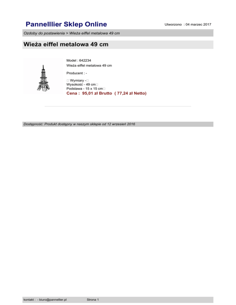 Pannelllier Sklep Online Ozdoby do postawienia > Wieża eiffel metalowa 49 cm Wieża eiffel metalowa 49 cm Model : 642234 Wieża eiffel metalowa 49 cm Producent : �Wymiary -� Wysokość - 49 cm� Podstawa - 15 x 15 cm� Cena : 95,01 zł Brutto ( 77,24 zł Netto) Dostępność: Produkt dostępny w naszym sklepie od 12 wrzesień 2016 kontakt : - [email protected] Strona 1 Utworzono : 04 marzec 2017