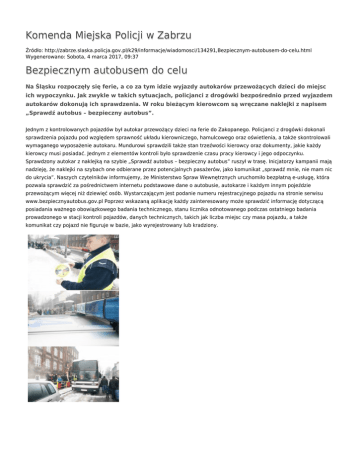 Komenda Miejska Policji w Zabrzu Źródło: http://zabrze.slaska.policja.gov.pl/k29/informacje/wiadomosci/134291,Bezpiecznym-autobusem-do-celu.html Wygenerowano: Sobota, 4 marca 2017, 09:37 Bezpiecznym autobusem do celu Na Śląsku rozpoczęły się ferie, a co za tym idzie wyjazdy autokarów przewożących dzieci do miejsc ich wypoczynku. Jak zwykle w takich sytuacjach, policjanci z drogówki bezpośrednio przed wyjazdem autokarów dokonują ich sprawdzenia. W roku bieżącym kierowcom są wręczane naklejki z napisem „Sprawdź autobus – bezpieczny autobus”. Jednym z kontrolowanych pojazdów był autokar przewożący dzieci na ferie do Zakopanego. Policjanci z drogówki dokonali sprawdzenia pojazdu pod względem sprawność układu kierowniczego, hamulcowego oraz oświetlenia, a także skontrolowali wymaganego wyposażenie autokaru. Mundurowi sprawdzili także stan trzeźwości kierowcy oraz dokumenty, jakie każdy kierowcy musi posiadać. Jednym z elementów kontroli było sprawdzenie czasu pracy kierowcy i jego odpoczynku. Sprawdzony autokar z naklejką na szybie „Sprawdź autobus – bezpieczny autobus” ruszył w trasę. Inicjatorzy kampanii mają nadzieję, że naklejki na szybach one odbierane przez potencjalnych pasażerów, jako komunikat „sprawdź mnie, nie mam nic do ukrycia”. Naszych czytelników informujemy, że Ministerstwo Spraw Wewnętrznych uruchomiło bezpłatną e-usługę, która pozwala sprawdzić za pośrednictwem internetu podstawowe dane o autobusie, autokarze i każdym innym pojeździe przewożącym więcej niż dziewięć osób. Wystarczającym jest podanie numeru rejestracyjnego pojazdu na stronie serwisu www.bezpiecznyautobus.gov.pl Poprzez wskazaną aplikację każdy zainteresowany może sprawdzić informację dotyczącą posiadania ważnego obowiązkowego badania technicznego, stanu licznika odnotowanego podczas ostatniego badania prowadzonego w stacji kontroli pojazdów, danych technicznych, takich jak liczba miejsc czy masa pojazdu, a także komunikat czy pojazd nie figuruje w bazie, jako wyrejestrowany lub kradziony. Ocena: 0/5 (0) Tweetnij
