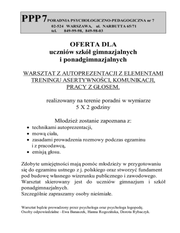 PPP7 PORADNIA PSYCHOLOGICZNO-PEDAGOGICZNA nr 7 02-524 WARSZAWA, ul. NARBUTTA 65/71 tel. 849-99-98, 849-98-03 OFERTA DLA uczniów szkół gimnazjalnych i ponadgimnazjalnych WARSZTAT Z AUTOPREZENTACJI Z ELEMENTAMI TRENINGU ASERTYWNOŚCI, KOMUNIKACJI, PRACY Z GŁOSEM. realizowany na terenie poradni w wymiarze 5 X 2 godziny Młodzież zostanie zapoznana z: · technikami autoprezentacji, · mową ciała, · zasadami prowadzenia rozmowy podczas egzaminu i z pracodawcą, · emisją głosu. Zdobyte umiejętności mają pomóc młodzieży w przygotowaniu się do egzaminu ustnego z j. polskiego oraz stworzyć fundament pod budowę własnego wizerunku publicznego i zawodowego. Warsztat skierowany jest do uczniów gimnazjum i szkół ponadgimnazjalnych. Szczególnie zapraszamy osoby nieśmiałe. Warsztat będzie prowadzony przez psychologa oraz psychologa logopedę. Osoby odpowiedzialne –Ewa Banaszek, Hanna Rogozińska, Dorota Rybaczyk.