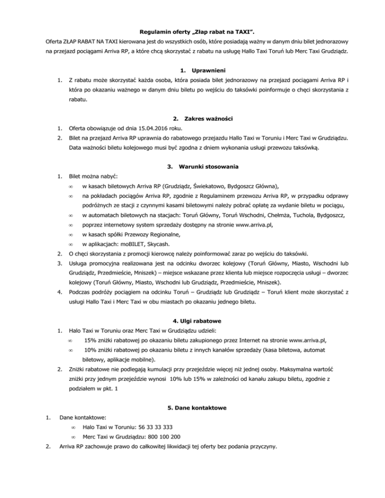 Regulamin oferty „Złap rabat na TAXI”. Oferta ZŁAP RABAT NA TAXI kierowana jest do wszystkich osób, które posiadają ważny w danym dniu bilet jednorazowy na przejazd pociągami Arriva RP, a które chcą skorzystać z rabatu na usługę Hallo Taxi Toruń lub Merc Taxi Grudziądz. 1. 1. Uprawnieni Z rabatu może skorzystać każda osoba, która posiada bilet jednorazowy na przejazd pociągami Arriva RP i która po okazaniu ważnego w danym dniu biletu po wejściu do taksówki poinformuje o chęci skorzystania z rabatu. 2. Zakres ważności 1. Oferta obowiązuje od dnia 15.04.2016 roku. 2. Bilet na przejazd Arriva RP uprawnia do rabatowego przejazdu Hallo Taxi w Toruniu i Merc Taxi w Grudziądzu. Data ważności biletu kolejowego musi być zgodna z dniem wykonania usługi przewozu taksówką. 3. 1. Warunki stosowania Bilet można nabyć: • w kasach biletowych Arriva RP (Grudziądz, Świekatowo, Bydgoszcz Główna), • na pokładach pociągów Arriva RP, zgodnie z Regulaminem przewozu Arriva RP, w przypadku odprawy podróżnych ze stacji z czynnymi kasami biletowymi należy pobrać opłatę za wydanie biletu w pociągu, • w automatach biletowych na stacjach: Toruń Główny, Toruń Wschodni, Chełmża, Tuchola, Bydgoszcz, • poprzez internetowy system sprzedaży dostępny na stronie www.arriva.pl, • w kasach spółki Przewozy Regionalne, • w aplikacjach: moBILET, Skycash. 2. O chęci skorzystania z promocji kierowcę należy poinformować zaraz po wejściu do taksówki. 3. Usługa promocyjna realizowana jest na odcinku dworzec kolejowy (Toruń Główny, Miasto, Wschodni lub Grudziądz, Przedmieście, Mniszek) – miejsce wskazane przez klienta lub miejsce rozpoczęcia usługi – dworzec kolejowy (Toruń Główny, Miasto, Wschodni lub Grudziądz, Przedmieście, Mniszek). 4. Podczas podróży pociągiem na odcinku Toruń – Grudziądz lub Grudziądz – Toruń klient może skorzystać z usługi Hallo Taxi i Merc Taxi w obu miastach po okazaniu jednego biletu. 4. Ulgi rabatowe 1. Halo Taxi w Toruniu oraz Merc Taxi w Grudziądzu udzieli: • 15% zniżki rabatowej po okazaniu biletu zakupionego przez Internet na stronie www.arriva.pl, • 10% zniżki rabatowej po okazaniu biletu z innych kanałów sprzedaży (kasa biletowa, automat biletowy, aplikacje mobilne). 2. Zniżki rabatowe nie podlegają kumulacji przy przejeździe więcej niż jednej osoby. Maksymalna wartość zniżki przy jednym przejeździe wynosi 10% lub 15% w zależności od kanału zakupu biletu, zgodnie z podziałem w pkt. 1 5. Dane kontaktowe 1. 2. Dane kontaktowe: • Halo Taxi w Toruniu: 56 33 33 333 • Merc Taxi w Grudziądzu: 800 100 200 Arriva RP zachowuje prawo do całkowitej likwidacji tej oferty bez podania przyczyny.
