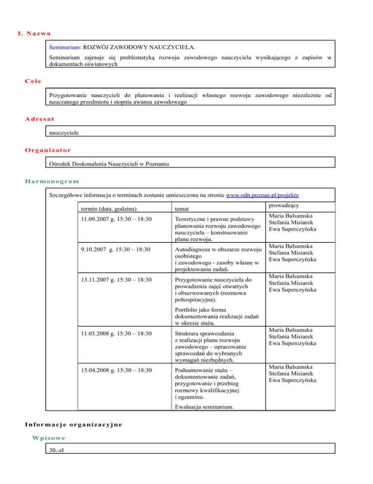 I. Nazwa Seminarium: ROZWÓJ ZAWODOWY NAUCZYCIELA