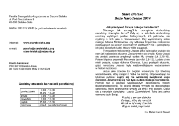 Parafia Ewangelicko-Augsburska w Starym Bielsku ul. Pod Grodziskiem 9 43-300 Bielsko-Biała telefon: 033 812 23 86 (w godzinach otwarcia kancelarii) internet: www.starebielsko.org e-mail: [email protected] [email protected] Konto bankowe: PKO BP O/Bielsko-Biała 98 1020 1390 0000 6502 0142 5024 Godziny otwarcia kancelarii parafialnej poniedziałek środa czwartek piątek niedziela 9.00 - 12.00 15.00 - 18.00 9.00 - 12.00 9.00 - 12.00 15.00 - 18.00 przed i po nabożeństwie Stare Bielsko Boże Narodzenie 2014 Jak przeżywać Święta Bożego Narodzenia? Dlaczego tak szczególnie uroczyście obchodzimy narodziny dzieciątka Jezus? Gdy np. w szkołach obchodzimy urodziny wybitnych postaci historycznych, ich patronów, nie myślimy o nich jako o niemowlakach. Czy wyobrażamy sobie małego Adama Mickiewicza, czy Mikołaja Kopernika rozkosznie raczkujących po swoich drewnianych chatkach? Nie – pamiętamy ich jako dorosłych ludzi, którzy wiele osiągnęli. Tymczasem traktowanie Jezusa jako dzieciątka wydaje się nam jak najbardziej słuszne. Zastanówmy się chwilę. Kiedy Jezus się urodził, pasterze przybiegli oddać Mu chwałę (Łk 2,15-16). Potem Mędrcy przynieśli Mu swoje dary (Mt 2,8-12). Ludzie ci nie mieli pojęcia, czego dokona Chrystus. Lecz postąpili słusznie, gdyż narodziny Jezusa były najdonioślejszym wydarzeniem w historii ludzkości. Jezus jako dziecko był Bogiem wcielonym. Był Stwórcą wszechświata, który zstąpił z nieba na ziemię. Odpowiadając na tytułowe pytanie: nigdy się nie wzbraniaj świętować Jego narodzin. Zdumiewaj się nad tym cudem Bożego Narodzenia. Pomyśl też o jeszcze wspanialszym zakończeniu historii Bożonarodzeniowej. To boskie dziecię wyrosło na doskonałego człowieka, które dobrowolnie umarło za twój i mój grzech. Ciesz się z narodzin dzieciątka i zaufaj Zbawicielowi. Taka jest pełna wymowa tych Świąt. Przyjdź z sercem dziecka Do tego, który się narodził. Wszak w tej małej dziecinie Bóg na świat przychodzi. Ks. Rafał Kamil Dawid Święta Bożego Narodzenia - nabożeństwa Adwent - nabożeństwa i gwiazdki Niech się rozweseli pustynia i spieczona ziemia; niech się rozraduje i zakwitnie step! Iz 35,1 data godzina 30.11.2014 Nd 09.30 St.B. MK 05.12.2014 Pt 07.12.2014 Nd 12.12.2014 Pt 14.12.2014 Nd 17.12.2014 Śr 19.12.2014 Pt 20.12.2014 So 21.12.2014 Nd opis I Niedziela w Adwencie I tygodniowe 17.00 St.B. nabożeństwo Adwentowe 09.30 St.B. WK II Niedziela w Adwencie Spotkanie z ks. R. Pieronem po nabożeństwie ★ Gwiazdka Rady D.S. Parafialnej II tygodniowe 17.00 St.B. WK nabożeństwo Adwentowe 08.00 Kam. WK III Niedziela w Adwencie 09.30 St.B. MK ★ Gwiazdka dzieci 15.00 St.B. 17.00 S.P. Spotkanie biblijne III tygodniowe 17.00 St.B. WK nabożeństwo Adwentowe 12.00 St.B WK Nabożeństwo dla Seniorów 13.00 D.S. ★ Gwiazdka Seniorów 17.00 D.S. ★ Gwiazdka Chóru 09.30 St.B. WK IV Niedziela w Adwencie Ujrzeli dziecię z Marią, matką jego, i upadłszy, oddali mu pokłon, potem otworzywszy swoje skarby, złożyli mu w darze złoto, kadzidło i mirrę. Mt 2,11 data 24.12.2014 Śr 25.12.2014 Cz 26.12.2014 Pt godzina 16.00 St.B. 05.00 Biała 09.30 St.B. 08.00 Kam. 09.30 St.B. opis Wigilia Jutrznia student teol. Z. Obracaj I Święto Bożego Narodzenia II Święto Bożego Narodzenia I Niedziela po Narodzeniu Pańskim 31.12.2014 Śr 16.00 St.B. WK Zakończenie Roku Święto nadania Zbawicielowi 01.01.2015 Cz 09.30 St.B imienia Jezus Nowy Rok II Niedziela po Narodzeniu 04.01.2015 Nd 09.30 St.B. Pańskim 06.01.2015 Wt 09.30 St.B. Święto Epifanii 28.12.2014 Nd 09.30 St.B. Objaśnienia skrótów: St.B. - Kościół w Starym Bielsku Kam. - Kościół w Kamienicy S.P. - Sala parafialna D.S. - Duża sala parafialna WK - Nabożeństwo ze Spowiedzią i Wieczerzą Pańską ze Wspólnego Kielicha MK - Nabożeństwo ze Spowiedzią i Wieczerzą Pańską z Małych Kielichów