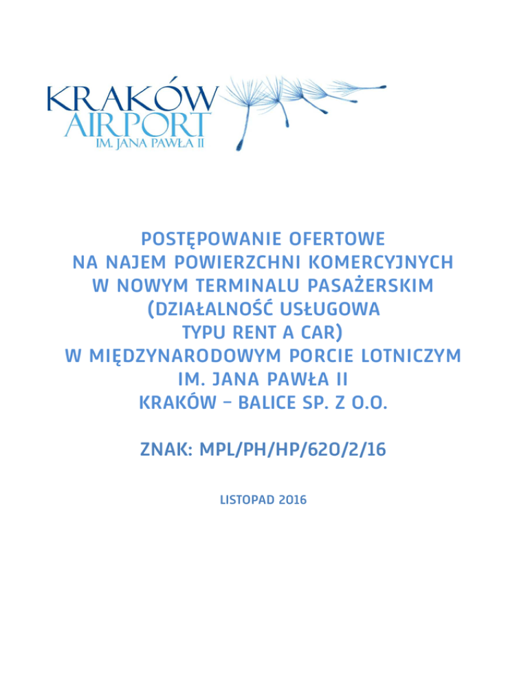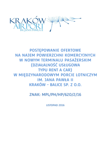 POSTĘPOWANIE OFERTOWE NA NAJEM POWIERZCHNI KOMERCYJNYCH W NOWYM TERMINALU PASAŻERSKIM (DZIAŁALNOŚĆ USŁUGOWA TYPU RENT A CAR) W MIĘDZYNARODOWYM PORCIE LOTNICZYM IM. JANA PAWŁA II KRAKÓW – BALICE SP. Z O.O. ZNAK: MPL/PH/HP/620/2/16 LISTOPAD 2016 Międzynarodowy Port Lotniczy im. Jana Pawła II Kraków - Balice sp. z o.o. z siedzibą w Balicach (dalej: MPL lub Organizator) zaprasza do składania ofert w ramach postępowania ofertowego (dalej: Postępowanie), którego celem jest wybór najemców powierzchni przeznaczonych na prowadzenie działalności usługowej, położonych w Terminalu Międzynarodowym, zgodnie z poniższymi założeniami i wymaganiami: I. NAZWA ORAZ ADRES ORGANIZATORA Międzynarodowy Port Lotniczy im. Jana Pawła II Kraków – Balice sp. z o. o. Adres ul. kpt. M. Medweckiego 1, 32-083 Balice Numery telefonów (0-12) 639 32 13 Numer telefaksu oraz adres email do korespondencji w (0-12) 411 79 77 sprawie Postępowania Email: [email protected] REGON 351117055 NIP 676-13-36-952 KRS 0000008522 Konto bankowe PEKAO SA oddział w Balicach Numer rachunku Bankowego 79 1240 4748 1111 0000 4878 9972 Znak Postępowania Nazwa Organizatora Uwaga: w korespondencji kierowanej do Organizatora MPL/PH/HP/620/2/16 należy posługiwać się tym znakiem z dodatkowym podaniem nazwy: powierzchnia znak „…” 00 Godziny pracy Adres strony internetowej II. 1. 2. 3. 4. 5. 6. 7. 8. 00 od 8 do 16 od poniedziałku do piątku za wyjątkiem dni ustawowo uznanych za dni wolne od pracy www.krakowairport.pl OKREŚLENIE PRZEDMIOTU POSTĘPOWANIA OFERTOWEGO Postępowanie dotyczy najmu powierzchni (pomieszczeń) komercyjnych przeznaczonych na prowadzenie działalności usługowej, zlokalizowanych w nowym, rozbudowanym terminalu międzynarodowym Kraków Airport. Postępowanie jest prowadzone w języku polskim. Schemat lokalizacji poszczególnych powierzchni określony został w Załączniku nr 1 do Postępowania. Szczegółowy wykaz powierzchni objętych niniejszym Postępowaniem przeznaczonych do wynajmu, zamieszczony został w tabeli, stanowiącej Załącznik nr 2 do Postępowania. MPL planuje we wskazanej lokalizacji uruchomienie działalności typu "rent a car". Ogólny opis "Wytycznych projektowych dotyczących wykonywania robót budowlanych, instalacyjnych i aranżacji wnętrz powierzchni komercyjnych w terminalu pasażerskim T4" stanowi Załącznik nr 3 do Postępowania. Przedmiotowe powierzchnie (pomieszczenia) zostaną przekazane najemcy (tj. Oferentowi, z którym zostanie zawarta umowa najmu) w stanie opisanym w niżej wskazanym dokumencie. Najemca zobowiązany będzie do wykonania wszystkich projektów branżowych, instalacji w obrębie danej powierzchni, do przeprowadzenia prac budowlanych, aranżacji wnętrza, umeblowania i wszystkich innych czynności niezbędnych w obrębie danej powierzchni, na własny koszt i ryzyko zgodnie z "Wytycznymi projektowymi dotyczących wykonywania robót budowlanych, instalacyjnych i aranżacji wnętrz powierzchni komercyjnych w terminalu pasażerskim T4" dotyczących poszczególnych powierzchni, które będą udostępnione na warunkach określonych w punkcie VII ust. 2, 3 i 4 Postępowania. Organizator oświadcza, że: 1 a) Poszczególne pomieszczenia będą wynajmowane na warunkach podpisanej umowy najmu, której wzór stanowi Załącznik nr 4 do niniejszego Postępowania, który będzie udostępniony na warunkach określonych punkcie VII ust. 2, 3 i 4. b) Zainteresowany Oferent jest zobowiązany złożyć jedną Ofertę na jedno pomieszczenie przeznaczone na działalność rent a car zlokalizowane w kompleksie pomieszczeń określonych w Załączniku nr 2, przy czym kolejność przyznawania pomieszczeń będzie zależała od oceny danej oferty, tzn. Oferent, który uzyska największą liczbę punktów za ofertę będzie miał pierwszeństwo wyboru pomieszczenia c) W ramach wniosku o udostępnienie dokumentów, o którym mowa w punkcie VII ust. 2, 3 i 4 Postępowania, Oferent otrzyma komplet materiałów związanych z Postępowaniem oraz Wytyczne projektowe dla tych powierzchni. Opłata za udostępnienie dokumentów określona jest w punkcie VII ust. 3 Postępowania, d) Nie dopuszcza się składania Ofert częściowych, wstępnych, warunkowych lub wariantowych. 9. Przeprowadza się jedno Postępowanie w stosunku do wszystkich powierzchni (pomieszczeń). III. PRZEBIEG POSTĘPOWANIA Postępowanie składa się z następujących etapów: 1. Przekazanie dokumentów Oferentowi na podstawie złożonego wniosku do MPL. 2. Udzielanie odpowiedzi na pytania Oferentów. Oferenci zobowiązani są przesyłać pytania na adres [email protected] w nieprzekraczalnym terminie do dnia 07.11.2016 roku. 3. Wniesienie wadium przez Oferenta na warunkach określonych w punkcie V Postępowania. 4. Złożenie Ofert w terminie wskazanym w punkcie IV Postępowania.. 5. Wybór Oferentów. 6. Ogłoszenie o wyborze Oferentów. 7. Podpisanie umów najmu z wybranymi Oferentami. IV. TERMIN I MIEJSCE ZŁOŻENIA OFERTY 1. Oferenci powinni złożyć Oferty na adres siedziby MPL: Międzynarodowy Port Lotniczy im. Jana Pawła II Kraków - Balice sp. z o.o. ul. kpt. M. Medweckiego 1 32-083 Balice, 2. 3. 4. 5. V. lub osobiście na Dzienniku Podawczym Biura Spółki do dnia 16.11.2016 roku do godziny 12.00. Decydujące znaczenie dla zachowania terminu wskazanego w ust. 1 ma data i godzina wpływu Oferty do MPL, a nie data jej wysłania przesyłką pocztową czy kurierską. Każdej złożonej Ofercie zostanie nadany numer identyfikacyjny. Oferty złożone po terminie wskazanym w ust. 1 zostaną zwrócone bez otwierania. MPL nie ponosi odpowiedzialności za złożenie Oferty w miejscu innym niż wyznaczone. Po upływie terminu składania Ofert, Oferent nie może Oferty wycofać. WADIUM Warunki wniesienia wadium są następujące: 1. Kwota wadium wynosi 30.000,00 zł (słownie złotych: trzydzieści tysięcy). 2. Oferent jest zobowiązany ustanowić wadium w pieniądzu, przed złożeniem Oferty.