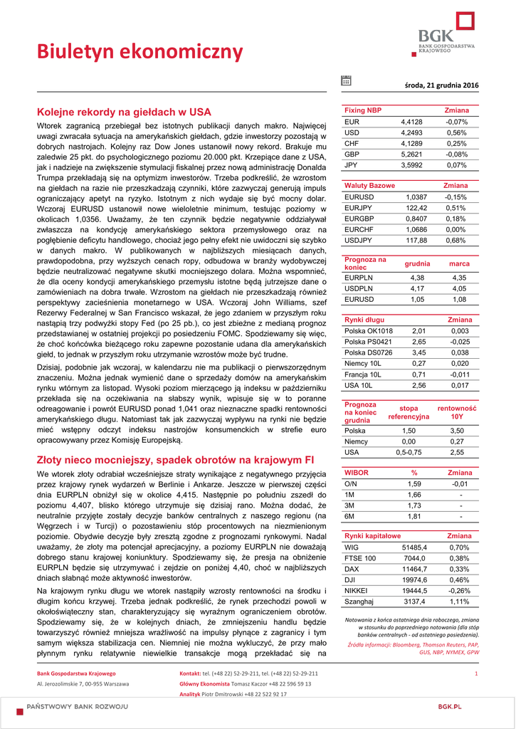 Biuletyn ekonomiczny środa, 21 grudnia 2016 Kolejne rekordy na giełdach w USA Fixing NBP Wtorek zagranicą przebiegał bez istotnych publikacji danych makro. Najwięcej uwagi zwracała sytuacja na amerykańskich giełdach, gdzie inwestorzy pozostają w dobrych nastrojach. Kolejny raz Dow Jones ustanowił nowy rekord. Brakuje mu zaledwie 25 pkt. do psychologicznego poziomu 20.000 pkt. Krzepiące dane z USA, jak i nadzieje na zwiększenie stymulacji fiskalnej przez nową administrację Donalda Trumpa przekładają się na optymizm inwestorów. Trzeba podkreślić, że wzrostom na giełdach na razie nie przeszkadzają czynniki, które zazwyczaj generują impuls ograniczający apetyt na ryzyko. Istotnym z nich wydaje się być mocny dolar. Wczoraj EURUSD ustanowił nowe wieloletnie minimum, testując poziomy w okolicach 1,0356. Uważamy, że ten czynnik będzie negatywnie oddziaływał zwłaszcza na kondycję amerykańskiego sektora przemysłowego oraz na pogłębienie deficytu handlowego, chociaż jego pełny efekt nie uwidoczni się szybko w danych makro. W publikowanych w najbliższych miesiącach danych, prawdopodobna, przy wyższych cenach ropy, odbudowa w branży wydobywczej będzie neutralizować negatywne skutki mocniejszego dolara. Można wspomnieć, że dla oceny kondycji amerykańskiego przemysłu istotne będą jutrzejsze dane o zamówieniach na dobra trwałe. Wzrostom na giełdach nie przeszkadzają również perspektywy zacieśnienia monetarnego w USA. Wczoraj John Williams, szef Rezerwy Federalnej w San Francisco wskazał, że jego zdaniem w przyszłym roku nastąpią trzy podwyżki stopy Fed (po 25 pb.), co jest zbieżne z medianą prognoz przedstawianej w ostatniej projekcji po posiedzeniu FOMC. Spodziewamy się więc, że choć końcówka bieżącego roku zapewne pozostanie udana dla amerykańskich giełd, to jednak w przyszłym roku utrzymanie wzrostów może być trudne. EUR 4,4128 -0,07% USD 4,2493 0,56% CHF 4,1289 0,25% GBP 5,2621 -0,08% JPY 3,5992 0,07% Dzisiaj, podobnie jak wczoraj, w kalendarzu nie ma publikacji o pierwszorzędnym znaczeniu. Można jednak wymienić dane o sprzedaży domów na amerykańskim rynku wtórnym za listopad. Wysoki poziom mierzącego ją indeksu w październiku przekłada się na oczekiwania na słabszy wynik, wpisuje się w to poranne odreagowanie i powrót EURUSD ponad 1,041 oraz nieznaczne spadki rentowności amerykańskiego długu. Natomiast tak jak zazwyczaj wypływu na rynki nie będzie mieć wstępny odczyt indeksu nastrojów konsumenckich w strefie euro opracowywany przez Komisję Europejską. Złoty nieco mocniejszy, spadek obrotów na krajowym FI Waluty Bazowe 1,0387 -0,15% EURJPY 122,42 0,51% EURGBP 0,8407 0,18% EURCHF 1,0686 0,00% USDJPY 117,88 0,68% Prognoza na koniec EURPLN grudnia marca 4,38 4,35 USDPLN 4,17 4,05 EURUSD 1,05 1,08 Rynki długu 2,01 0,003 Polska PS0421 2,65 -0,025 Polska DS0726 3,45 0,038 Niemcy 10L 0,27 0,020 Francja 10L 0,71 -0,011 USA 10L 2,56 0,017 Prognoza na koniec grudnia Polska Główny Ekonomista Tomasz Kaczor +48 22 596 59 13 Analityk Piotr Dmitrowski +48 22 522 92 17 stopa referencyjna rentowność 10Y 1,50 3,50 0,00 0,27 0,5-0,75 2,55 Niemcy USA Na krajowym rynku długu we wtorek nastąpiły wzrosty rentowności na środku i długim końcu krzywej. Trzeba jednak podkreślić, że rynek przechodzi powoli w okołoświąteczny stan, charakteryzujący się wyraźnym ograniczeniem obrotów. Spodziewamy się, że w kolejnych dniach, że zmniejszeniu handlu będzie towarzyszyć również mniejsza wrażliwość na impulsy płynące z zagranicy i tym samym większa stabilizacja cen. Niemniej nie można wykluczyć, że przy mało płynnym rynku relatywnie niewielkie transakcje mogą przekładać się na Kontakt: tel. (+48 22) 52-29-211, tel. (+48 22) 52-29-211 Zmiana Polska OK1018 WIBOR Al. Jerozolimskie 7, 00-955 Warszawa Zmiana EURUSD We wtorek złoty odrabiał wcześniejsze straty wynikające z negatywnego przyjęcia przez krajowy rynek wydarzeń w Berlinie i Ankarze. Jeszcze w pierwszej części dnia EURPLN obniżył się w okolice 4,415. Następnie po południu zszedł do poziomu 4,407, blisko którego utrzymuje się dzisiaj rano. Można dodać, że neutralnie przyjęte zostały decyzje banków centralnych z naszego regionu (na Węgrzech i w Turcji) o pozostawieniu stóp procentowych na niezmienionym poziomie. Obydwie decyzje były zresztą zgodne z prognozami rynkowymi. Nadal uważamy, że złoty ma potencjał aprecjacyjny, a poziomy EURPLN nie doważają dobrego stanu krajowej koniunktury. Spodziewamy się, że presja na obniżenie EURPLN będzie się utrzymywać i zejdzie on poniżej 4,40, choć w najbliższych dniach słabnąć może aktywność inwestorów. Bank Gospodarstwa Krajowego Zmiana % Zmiana O/N 1,59 -0,01 1M 1,66 - 3M 1,73 - 6M 1,81 - Rynki kapitałowe Zmiana WIG 51485,4 0,70% FTSE 100 7044,0 0,38% DAX 11464,7 0,33% DJI 19974,6 0,46% NIKKEI 19444,5 -0,26% Szanghaj 3137,4 1,11% Notowania z końca ostatniego dnia roboczego, zmiana w stosunku do poprzedniego notowania (dla stóp banków centralnych - od ostatniego posiedzenia). Źródła informacji: Bloomberg, Thomson Reuters, PAP, GUS, NBP, NYMEX, GPW 1 Biuletyn ekonomiczny środa, 21 grudnia 2016 nieoczekiwane ruchy cen. Kalendarz publikacji danych makroekonomicznych Data Godz Kraj Okres Jednostka Prognoza Konsensus Poprzednio lis mln - 5,5 5,6 US Publikacja Sprzedaż domów na rynku wtórnym Zamówienia na dobra trwałe 21 gru 16:00 US 22 gru 14:30 22 gru 14:30 lis % - -4,7 4,6 US Nowi bezrobotni poprz. tydz. tys. - 256 254 22 gru 16:00 22 gru 16:00 US Spożycie prywatne, realne lis % - - US Wydatki prywatne, spożycie lis % - 0,3 22 gru 16:00 US Dochody osobiste lis % - 0,3 0,6 22 gru 16:00 US Indeks cen PCE bazowych m/m lis % - 0,1 0,1 22 gru 17:00 US Aktywność w przemyśle, FED KC gru - - - 9 Fixing NBP 0,1 0,3 Bazowe pary walutowe 4,60 4,60 4,50 4,40 4,30 4,20 4,10 4,00 3,90 3,80 3,70 3,60 3,50 3,40 3,30 4,50 4,40 4,30 4,20 4,10 4,0