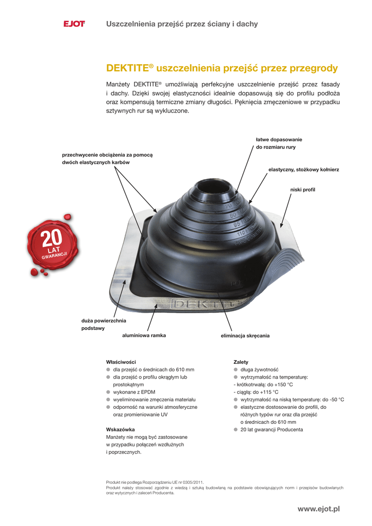 Uszczelnienia przejść przez ściany i dachy DEKTITE® uszczelnienia przejść przez przegrody Manżety DEKTITE® umożliwiają perfekcyjne uszczelnienie przejść przez fasady i dachy. Dzięki swojej elastyczności idealnie dopasowują się do profilu podłoża oraz kompensują termiczne zmiany długości. Pęknięcia zmęczeniowe w przypadku sztywnych rur są wykluczone. łatwe dopasowanie do rozmiaru rury przechwycenie obciążenia za pomocą dwóch elastycznych karbów elastyczny, stożkowy kołnierz niski profil duża powierzchnia podstawy aluminiowa ramka Właściwości ll dla przejść o średnicach do 610 mm ll dla przejść o profilu okrągłym lub prostokątnym ll wykonane z EPDM ll wyeliminowanie zmęczenia materiału ll odporność na warunki atmosferyczne oraz promieniowanie UV Wskazówka Manżety nie mogą być zastosowane w przypadku połączeń wzdłużnych i poprzecznych. eliminacja skręcania Zalety ll długa żywotność ll wytrzymałość na temperaturę: - krótkotrwałą: do +150 °C - ciągłą: do +115 °C ll wytrzymałość na niską temperaturę: do 50 °C ll elastyczne dostosowanie do profili, do różnych typów rur oraz dla przejść o średnicach do 610 mm ll 20 lat gwarancji Producenta Produkt nie podlega Rozporządzeniu UE nr 0305/2011. Produkt należy stosować zgodnie z wiedzą i sztuką budowlaną na podstawie obowiązujących norm i przepisów budowlanych oraz wytycznych i zaleceń Producenta. www.ejot.pl Uszczelnienia przejść przez ściany i dachy Dektite® Soaker pakiet montażowy średnica rury Ø [mm] Pakiet zawiera 1 manżeta uszczelniająca 1 masa uszczelniająca EJOPLAST 1 zestaw wkrętów wiercących EJOT® typ JT3-2H-Plus-5,5x25-E16 wymiar nachylenie podstawy dachu [mm] [°] EJOPLAST [ml] zestaw wkrętów [szt.] opakowanie opis produktu [szt.] numer artykułu 75 - 155 114 - 254 254 - 406 410 x 360 485 x 460 708 x 635 0 - 60 0 - 60 0 - 60 80 80 310 30 36 52 1 DF 602 1 DF 603 1 DF 605 8 206 024 700 8 206 034 700 8 206 054 700 380 - 610 1006 x 905 0 - 60 310 96 1 DF 606 8 206 064 700 Zastosowanie ll do uszczelniania rur o dużych powierzchniach montażowych ll możliwość wykorzystania jako rozwiązanie awaryjne dla błędnie wykonanych otworów montażowych Właściwości ll duża powierzchnia podstawy umożliwia optymalne dopasowanie do podłoża ll łatwy i pewny montaż ll uszczelnienie rury i dachu w jednym cyklu roboczym 1. Dopasować manżetę Dektite® do rozmiaru rury. 2. Nasunać manżetę Dektite® na rurę używając przy tym wody jako smaru. 4. Wyciąć zakres w środku zaznaczonego pola. Zaokrąglić ostre krawędzie. Dla stabilizacji wycięcia w dachu, jeżeli jest taka potrzeba, wykonać wzmocnienie otworu. 6. Mocowanie zacząć od strony górnej fali, od środka listwy mocującej do jej zewnętrznych końców. Pozostałe strony mocowanych listew manżety w identycznej kolejności. 7. W celu uszczelnienia zachodzących na siebie końcówek użyć dołączone paski metalowe. Odciąć ewentualnie wystające części manżety. 3. Zaznaczyć brzeg manżety Dektite®. Usunąć manżetę i zaznaczyć 30 mm zakres nachodzenia. 5. Nanieść masę uszczelniającą EJOPLAST i dopasować Dektite® do profilu blachy. www.ejot.pl Uszczelnienia przejść przez ściany i dachy akcesoria EJOPLAST masa uszczelniająca pojemność [ml] kolor opakowanie opis produktu [szt.] 80 bezbarwny 310 bezbarwny numer artykułu 1 EJOPLAST 80 ml 1 EJOPLAST 310 ml Zastosowanie ll do uszczelniania manżet Dektite® ll stanowi element zestawu Właściwości ll jednoskładnikowa masa uszczelniająca na bazie kwasu poliwęglanowego i kopolimeru ll przywiera do materiałów, takich jak: stal, aluminium, mosiądz, miedź, szkło, drewno, ceramika, bitumit, beton, tynk, pleksi, po- liester, dachówka, papa dachowa, płytka itp. ll gładkie, nieporowate powierzchnie mogą być mokre, podczas gdy powierzchnie porowate powinny być suche ll można czyścić typowymi środkami czystości ll nie można czyścić środkami zawierającymi rozpuszczalniki ll powierzchnia po ok. 20-30 minutach nie jest klejąca (zależnie od temperatury otoczenia) ll masa po kontakcie z wodą (np. poprzez wygładzanie) nie jest klejąca 8 200 003 000 8 200 001 000 Wskazówki do obróbki Tubki składować w temperaturze pokojowej. Uszczelniane powierzchnie powinny być odtłuszczone. Do późniejszego wygładzania używać wody. Odpowiedni przekrój dysz oraz użycie pistoletu, pozwala ekonomicznie dozować masę podczas nakładania. Zbyt duża ilość nałożonej masy może być trudna do usunięcia ze względu na bardzo dobre właściwości przylegające. Czyszczenie narzędzi może odbywać się za pomocą odpowiedniego środka czyszczącego, acetonu lub benzyny. Rozpoczęte tuby możliwie szybko zużyć. EJOPLAST zawiera palne rozpuszczalniki, dlatego podczas pracy należy zapewnić prawidłową wentylację i unikać pracy w pobliżu otwartego ognia lub innych źródeł zapalnych. Temperatura pracy: +5°C do +30°C. Karta charakterystyki do pobrania na www.ejot.pl www.ejot.pl