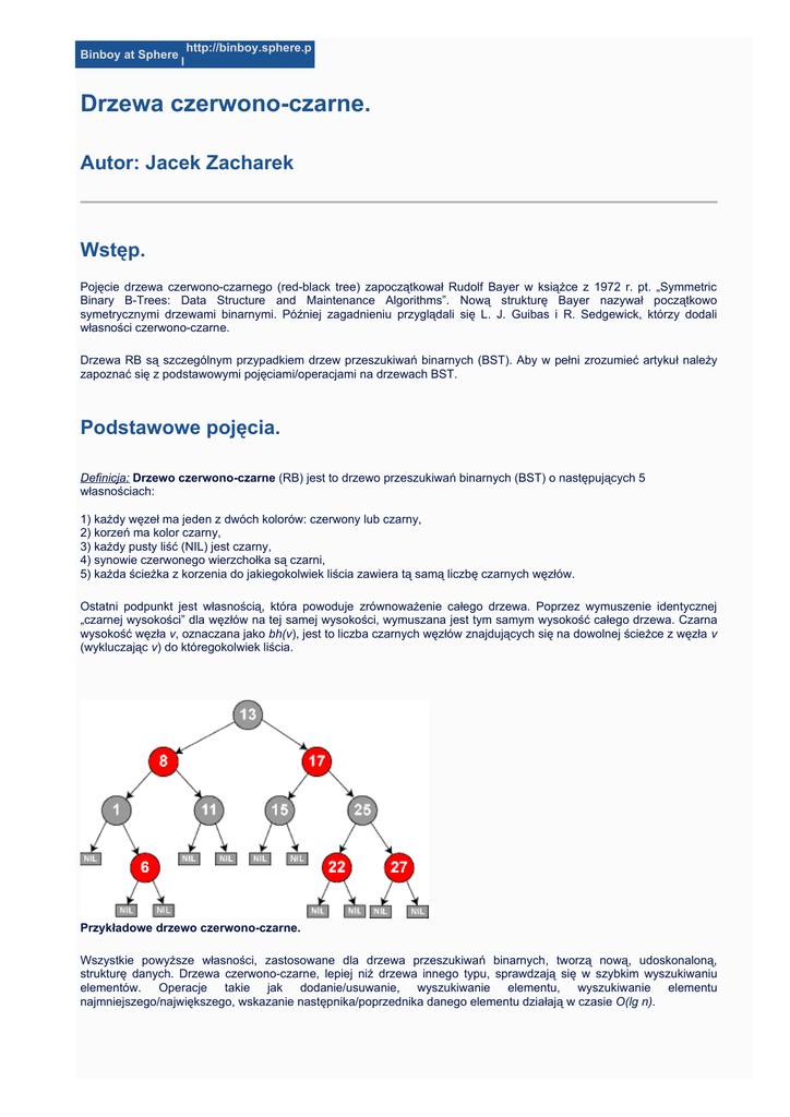 Binboy at Sphere http://binboy.sphere.p l Drzewa czerwono-czarne. Autor: Jacek Zacharek Wstęp. Pojęcie drzewa czerwono-czarnego (red-black tree) zapoczątkował Rudolf Bayer w książce z 1972 r. pt. „Symmetric Binary B-Trees: Data Structure and Maintenance Algorithms”. Nową strukturę Bayer nazywał początkowo symetrycznymi drzewami binarnymi. Później zagadnieniu przyglądali się L. J. Guibas i R. Sedgewick, którzy dodali własności czerwono-czarne. Drzewa RB są szczególnym przypadkiem drzew przeszukiwań binarnych (BST). Aby w pełni zrozumieć artykuł należy zapoznać się z podstawowymi pojęciami/operacjami na drzewach BST. Podstawowe pojęcia. Definicja: Drzewo czerwono-czarne (RB) jest to drzewo przeszukiwań binarnych (BST) o następujących 5 własnościach: 1) każdy węzeł ma jeden z dwóch kolorów: czerwony lub czarny, 2) korzeń ma kolor czarny, 3) każdy pusty liść (NIL) jest czarny, 4) synowie czerwonego wierzchołka są czarni, 5) każda ścieżka z korzenia do jakiegokolwiek liścia zawiera tą samą liczbę czarnych węzłów. Ostatni podpunkt jest własnością, która powoduje zrównoważenie całego drzewa. Poprzez wymuszenie identycznej „czarnej wysokości” dla węzłów na tej samej wysokości, wymuszana jest tym samym wysokość całego drzewa. Czarna wysokość węzła v, oznaczana jako bh(v), jest to liczba czarnych węzłów znajdujących się na dowolnej ścieżce z węzła v (wykluczając v) do któregokolwiek liścia. Przykładowe drzewo czerwono-czarne. Wszystkie powyższe własności, zastosowane dla drzewa przeszukiwań binarnych, tworzą nową, udoskonaloną, strukturę danych. Drzewa czerwono-czarne, lepiej niż drzewa innego typu, sprawdzają się w szybkim wyszukiwaniu elementów. Operacje takie jak dodanie/usuwanie, wyszukiwanie elementu, wyszukiwanie elementu najmniejszego/największego, wskazanie następnika/poprzednika danego elementu działają w czasie O(lg n). Wyszukiwanie. Jako że, drzewo czerwono-czarne jest drzewem przeszukiwań binarnych, wyszukiwanie elementu o kluczu k odbywa się tak samo jak wyszukiwanie w standardowym drzewie BST. Rekurencyjna funkcja Search(v, k) jako parametry przyjmuje wskaźnik do korzenia v oraz wartość klucza k do znalezienia. Funkcja zwraca wskaźnik do elementu o wartości klucza k lub wartość NIL, jeżeli taki klucz nie został znaleziony: Search(v, k) if (v jest liściem) lub (key[v] = k) then return v if k < key[v] then return Search(left[v], k) else return Search(right[v], k) Rotacja. Rotacja jest kluczową procedurą wykorzystywaną w procesie wstawiania i usuwania. Schemat przedstawia działanie 2 odmian: lewej i prawej rotacji. Rotacja zachowuje porządek inorder kluczy. Lewa rotacja może być wykonana tylko, gdy prawy syn x jest niepusty. Lewa rotacja polega na „obrocie” wokół krawędzi między węzłami x i y. W wyniku rotacji y staje się nowym korzeniem poddrzewa, x staje się jego lewym synem, a lewy syn y zostaje prawym synem węzła x. Ogólny schemat rotacji. Wstawianie. Operacja wstawiania nowych elementów jest operacją dość skomplikowaną. W odróżnieniu od drzew BST, wstawiając element musimy pamiętać, aby zachować zrównoważenie drzewa. Wstawienie elementu w dowolnym miejscu może powodować zaburzenie struktury drzewa RB. Aby uniknąć pomyłek należy zapamiętać następujące własności: - Początkowo wstawiamy element tak, jak do standardowego drzewa BST. - Kolor każdego nowo dodanego elementu jest czerwony. - Jeżeli rodzic wstawionego węzła jest czarny to własność drzewa została zachowana. - Jeżeli rodzic wstawionego węzła jest czerwony to własność 4 została zaburzona (rodzic i syn mają kolor czerwony). Aby przywrócić własność należy przekolorować niektóre węzły i zmienić relację (wartości wskaźników) między niektórymi węzłami. Insert(T, v) if T = NIL //T jest pustym drzewem then v jest korzeniem i jest czarny przerwij if Search(T, key[v]) = NIL //sprawdzenie, czy elementu v nie ma już w drzewie then wstaw v do drzewa T tak jak w drzewie BST pokoloruj v na czerwono if rodzic v jest czerwony then przywróć własność drzewa RB wg 3 przypadków poniżej else przerwij //element v jest już w drzewie Przywracanie własności drzewa RB następuje tylko w sytuacji, gdy rodzic dodanego węzła jest czerwony. Oto 3 możliwe przypadki takiego zdarzenia: Przypadek 1. CZERWONY WUJEK Pierwsza możliwa sytuacja w przypadku czerwonego wujka. Druga możliwa sytuacja w przypadku czerwonego wujka. Opis: Nowo dodany węzeł jest zaznaczony niebieską obwódką. Aby pozbyć się ustawienia dwóch czerwonych węzłów (ojciec-syn) zmieniamy kolor ojca, dziadka oraz pradziadka dodanego węzła. W tym przypadku pradziadek powinien zmienić kolor na czerwony, jednak mając na uwadze drugą własność drzew RB pradziadek zmienia kolor z powrotem na czarny, gdyż jest korzeniem. Przypadek 2. CZARNY WUJEK, PRAWY SYN kolejność: a - b - c - d Opis: Nowo dodany węzeł jest zaznaczony niebieską obwódką. W pierwszej kolejności poddrzewo przechodzi proces rotacji (b-c) tak, że nowy wierzchołek i ojciec zmieniają poziom w drzewie. Po rotacji kolorujemy nowy węzeł na czarno, a stary korzeń na czerwono (d). Jak widać na rysunku przed rotacją wysokość drzewa wynosiła 2, po rotacji zmniejszyła się do 1. Przypadek 3. CZARNY WUJEK, LEWY SYN kolejność: a - b - c Opis: Przypadek 3 jest bardzo zbliżony do przypadku 2. Faktycznie został wykonany podobny zabieg, tylko dla innego węzła. Ponownie dokonano zabiegu rotacji, ale tym razem ojciec został umieszczony na szczycie poddrzewa, a nie nowo dodany wierzchołek. Podobnie jak poprzednio zmieniono kolory odpowiednich węzłów. Wysokość poddrzewa zmniejszyła się o jeden. PRZYKŁAD WSTAWIANIA NOWEGO WĘZŁA DO DRZEWA CZERWONO-CZARNEGO: Oryginalne drzewo. W następnych rysunkach czarne puste liście zostały pominięte ze względu na czytelność schematu. Wstawiamy 