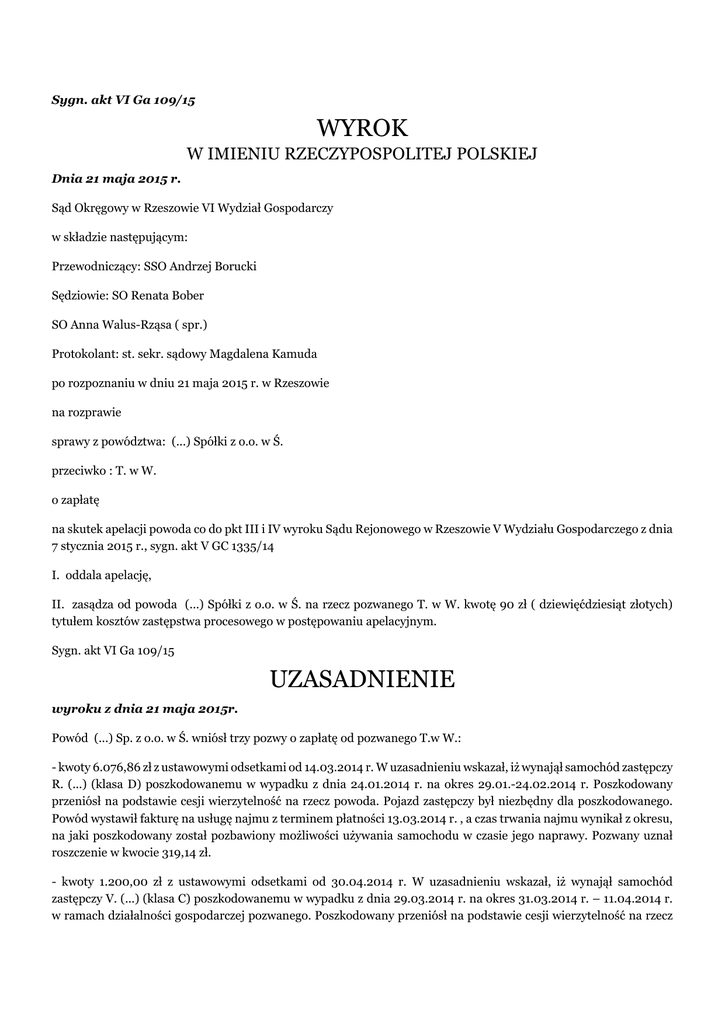 Sygn. akt VI Ga 109/15 WYROK W IMIENIU RZECZYPOSPOLITEJ POLSKIEJ Dnia 21 maja 2015 r. Sąd Okręgowy w Rzeszowie VI Wydział Gospodarczy w składzie następującym: Przewodniczący: SSO Andrzej Borucki Sędziowie: SO Renata Bober SO Anna Walus-Rząsa ( spr.) Protokolant: st. sekr. sądowy Magdalena Kamuda po rozpoznaniu w dniu 21 maja 2015 r. w Rzeszowie na rozprawie sprawy z powództwa: (...) Spółki z o.o. w Ś. przeciwko : T. w W. o zapłatę na skutek apelacji powoda co do pkt III i IV wyroku Sądu Rejonowego w Rzeszowie V Wydziału Gospodarczego z dnia 7 stycznia 2015 r., sygn. akt V GC 1335/14 I. oddala apelację, II. zasądza od powoda (...) Spółki z o.o. w Ś. na rzecz pozwanego T. w W. kwotę 90 zł ( dziewięćdziesiąt złotych) tytułem kosztów zastępstwa procesowego w postępowaniu apelacyjnym. Sygn. akt VI Ga 109/15 UZASADNIENIE wyroku z dnia 21 maja 2015r. Powód (...) Sp. z o.o. w Ś. wniósł trzy pozwy o zapłatę od pozwanego T.w W.: - kwoty 6.076,86 zł z ustawowymi odsetkami od 14.03.2014 r. W uzasadnieniu wskazał, iż wynajął samochód zastępczy R. (...) (klasa D) poszkodowanemu w wypadku z dnia 24.01.2014 r. na okres 29.01.-24.02.2014 r. Poszkodowany przeniósł na podstawie cesji wierzytelność na rzecz powoda. Pojazd zastępczy był niezbędny dla poszkodowanego. Powód wystawił fakturę na usługę najmu z terminem płatności 13.03.2014 r. , a czas trwania najmu wynikał z okresu, na jaki poszkodowany został pozbawiony możliwości używania samochodu w czasie jego naprawy. Pozwany uznał roszczenie w kwocie 319,14 zł. - kwoty 1.200,00 zł z ustawowymi odsetkami od 30.04.2014 r. W uzasadnieniu wskazał, iż wynajął samochód zastępczy V. (...) (klasa C) poszkodowanemu w wypadku z dnia 29.03.2014 r. na okres 31.03.2014 r. – 11.04.2014 r. w ramach działalności gospodarczej pozwanego. Poszkodowany przeniósł na podstawie cesji wierzytelność na rzecz powoda. Pojazd zastępczy był niezbędny dla poszkodowanego. Powód wystawił fakturę na usługę najmu z terminem płatności 29.04.2014 r., a czas trwania najmu wynikał z okresu, na jaki poszkodowany został pozbawiony możliwości używania samochodu w czasie jego naprawy. Pozwany uznał za zasadny najem na okres 3 dni , w tym 2 dni na czas naprawy. - kwoty 1.293,60 zł z ustawowymi odsetkami od 29.05.2014 r. W uzasadnieniu wskazał, iż wynajął samochód zastępczy P. (...) (klasa C) poszkodowanemu w wypadku z dnia 23.04.2014 r. na okres 29.04.2014 r. – 13.05.2014 r. Poszkodowany przeniósł na podstawie cesji wierzytelność na rzecz powoda. Pojazd zastępczy był niezbędny dla poszkodowanego. Powód wystawił fakturę na usługę najmu z terminem płatności 28.05.2014 r., a czas trwania najmu wynikał z okresu, na jaki poszkodowany został pozbawiony możliwości używania samochodu w czasie jego naprawy. W sprzeciwach od nakazu zapłaty pozwany podniósł kolejno: - co do kwoty 6.076,86 zł , że wypłacił odszkodowanie do wysokości 1346 zł i zweryfikował jako zasadny najem na okres 2 dni, gdyż samochód nadawał się do jazdy. Ponadto poszkodowany przyczynił się do zwiększenia rozmiarów szkody bowiem mimo wskazania przez pozwanego możliwości wynajmu w firmie (...) za cenę 159,57 zł brutto poszkodowany wynajął samochód u powoda za wyższą stawkę, zatem pozwany zweryfikował stawkę do kwoty 159,57 zł brutto; - co do kwoty 1.200 zł , że wypłacił odszkodowanie do wysokości 3.228,25 zł i zweryfikował jako zasadny najem na okres 3 dni, w tym 2 dni naprawy, bo samochód nadawał się do jazdy; - co do kwoty 1.293,60 zł , że wypłacił odszkodowanie do wysokości 3680 zł i zweryfikował jako zasadny najem na okres 2 dni, gdyż samochód nadawał się do jazdy. Ponadto poszkodowany przyczynił się do zwiększenia rozmiarów szkody bowiem mimo wskazania przez pozwanego możliwości wynajmu w firmie (...) za cenę 129 zł brutto poszkodowany wynajął samochód u powoda za wyższą stawkę, zatem pozwany zweryfikował stawkę do kwoty 129 zł netto. W odpowiedziach na sprzeciwy powód podtrzymał swe stanowisko, przy czym w sprawie o zapłatę 1.200 zł wskazał, że pojazd nie nadawał się do jazdy, został odholowany do warsztatu w niedzielę, a poruszanie się nim stanowiło zagrożenie dla ruchu. Sąd Rejonowy ustalił, iż poza sporem było, że w dniu 18.10.2013 r. pozwany zapłacił na rzecz powoda kwotę 3.228,75 zł na poczet odszkodowania dochodzonego w 1. sprawie V GNc 4812/13. W sprawie V GNc 4819/13 pozwany decyzją dnia 19.09.2013 r. zapłacił powodowi kwotę 1.217,70 zł tytułem części należności z tytułu kosztów najmu. W sprawie V GNc 4822/13 pozwany zapłacił powodowi kwotę 836,40 zł tytułem części należności z tytułu kosztów najmu. Poza sporem była potrzeba korzystania przez poszkodowanych z pojazdów zastępczych na okres objęty umowami najmu. Wyrokiem z dnia 7 stycznia 2015r. Sąd Rejonowy w Rzeszowie V Wydział Gospodarczy w sprawie o zapłatę 6.076,86 zł oddalił powództwo i zasądził od powoda na rzecz pozwanego kwotę 1.217 zł tytułem kosztów procesu. W sprawie o zapłatę kwoty 1.200 zł Sąd Rejonowy w Rzeszowie oddalił powództwo i zasądził od powoda na rzecz pozwanego kwotę 197 zł tytułem kosztów procesu. W sprawie o zapłatę kwoty 1.293,60 zł Sąd Rejonowy w Rzeszowie zasądził od pozwanego na rzecz powoda kwotę 1.293,60 zł z ustawowymi odsetkami i kosztami postępowania. Z ustaleń Sąd Rejonowego wynika, że w sprawie o zapłatę kwoty 6.076,86 zł , iż kolizja miała miejsce 24.01.2014r., zaś wynajem pojazdu nastąpił w okresie 29.01.- 24.02.2014r. ( 26 dób ).Wg wyceny szkody usunięcie uszkodzeń w pojeździe winno wynosić 39 j.c. , tj. 3,9 rbh. Powód wystawił fakturę na kwotę 6.396 zł brutto, tj. zastosował stawkę 246 zł brutto na 1 dobę wynajmu, z czego pozwany zapłacił kwotę 319.14 zł. Pozostałą kwotę dochodził powód w pozwie (okoliczność bezsporna). W dniu 3.0