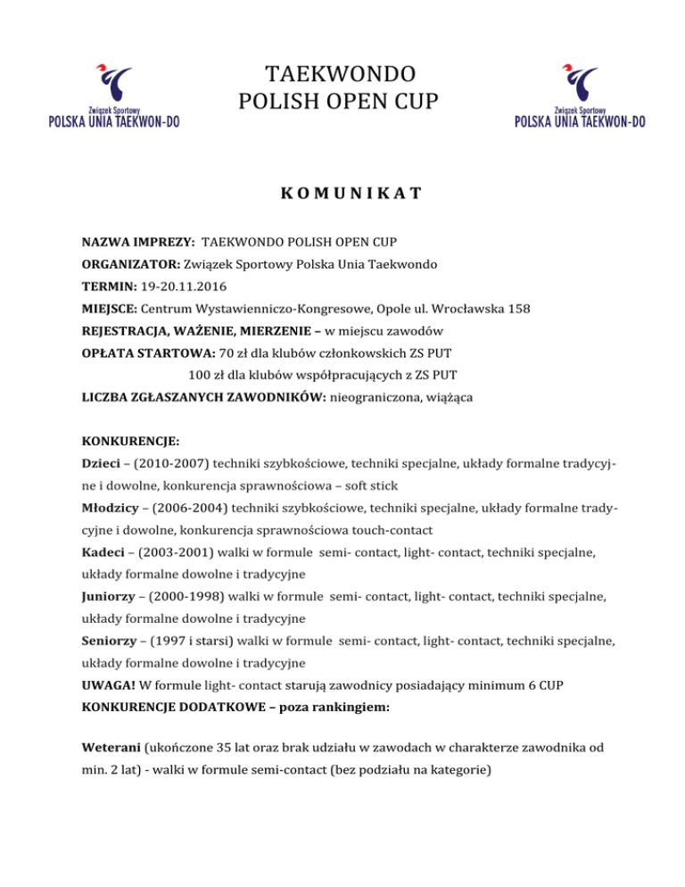 TAEKWONDO POLISH OPEN CUP KOMUNIKAT NAZWA IMPREZY: TAEKWONDO POLISH OPEN CUP ORGANIZATOR: Związek Sportowy Polska Unia Taekwondo TERMIN: 19-20.11.2016 MIEJSCE: Centrum Wystawienniczo-Kongresowe, Opole ul. Wrocławska 158 REJESTRACJA, WAŻENIE, MIERZENIE – w miejscu zawodów OPŁATA STARTOWA: 70 zł dla klubów członkowskich ZS PUT 100 zł dla klubów współpracujących z ZS PUT LICZBA ZGŁASZANYCH ZAWODNIKÓW: nieograniczona, wiążąca KONKURENCJE: Dzieci – (2010-2007) techniki szybkościowe, techniki specjalne, układy formalne tradycyjne i dowolne, konkurencja sprawnościowa – soft stick Młodzicy – (2006-2004) techniki szybkościowe, techniki specjalne, układy formalne tradycyjne i dowolne, konkurencja sprawnościowa touch-contact Kadeci – (2003-2001) walki w formule semi- contact, light- contact, techniki specjalne, układy formalne dowolne i tradycyjne Juniorzy – (2000-1998) walki w formule semi- contact, light- contact, techniki specjalne, układy formalne dowolne i tradycyjne Seniorzy – (1997 i starsi) walki w formule semi- contact, light- contact, techniki specjalne, układy formalne dowolne i tradycyjne UWAGA! W formule light- contact starują zawodnicy posiadający minimum 6 CUP KONKURENCJE DODATKOWE – poza rankingiem: Weterani (ukończone 35 lat oraz brak udziału w zawodach w charakterze zawodnika od min. 2 lat) - walki w formule semi-contact (bez podziału na kategorie) TAEKWONDO POLISH OPEN CUP Układy drużynowe – konkurencja układów drużynowych synchronicznych dla drużyn junior/senior (dopuszczane są zarówno drużyny tylko juniorskie/tylko seniorskie jak i drużyny mieszane, juniorsko-seniorskie). Konkurencja rozegrana będzie bez podziału na stopnie. Soft stick – dla młodzików, którzy nie biorą udziału w walkach. Podział na grupy uzależniony od zgłoszeń. NAGRODY: medale tłoczone oraz dyplomy. UBEZPIECZENIE: ubezpieczenie NNW dla zawodników – zapewniają kluby we własnym zakresie. Organizator nie ponosi odpowiedzialności za ewentualne wypadki na zawodach. OPIEKA MEDYCZNA ZAWODÓW: zapewnia organizator WYŻYWIENIE i NOCLEGI: we własnym zakresie SĘDZIOWIE: 1 sędzia na każdą rozpoczętą ósemkę zawodników. Zgłoszenia za pomocą PRL (programu rejestrująco-losującego). Możliwość wypożyczenia sędziego z innego klubu – kontakt z Prezesem ZS PUT Zbigniewem Pawlakiem tel. 505 074 423. REGULAMIN ZAWODÓW, obsada sędziowska, ubiory sędziów i zawodników, kategorie zawodów, sprzęt ochronny: zgodnie z przepisami obowiązującymi w zawodach ZS PUT. WAŻENIE I REJESTRACJA: PIĄTEK 18.11.2016r. 18:00-21:00 waga i rejestracja drużyn (dzieci, młodzik, kadet, junior, senior) SOBOTA 19.11.2016r. 7:30 - kategoria dzieci –(rejestrują trenerzy przy stoliku sędziego głównego) 8:00 - kategoria młodzik (obowiązkowa rejestracja) 19:00 - kategoria kadet, junior, senior TAEKWONDO POLISH OPEN CUP NIEDZIELA 20.11.2016r. 7:30- kategoria kadet, junior i senior Uwaga – godziny rejestracji będą ściśle przestrzegane. Warunkiem startu w zawodach jest wcześniejsza rejestracja. Rejestracja zawodników poza wyznaczonymi godzinami możliwa tylko w czasie pracy komisji sędziowskiej i przy zwiększeniu opłaty startowej o 10zł. W innym wypadku zawodnik nie zostanie zarejestrowany co oznacza brak możliwości udziału w zawodach. Plan zawodów: SOBOTA 19.11.2016r. 8.30 – odprawa sędziów 9:00- 13:00 Wszystkie konkurencje dzieci 13:30- 14:00 Oficjalne rozpoczęcie zawodów 14:00- 19:00 Wszystkie konkurencje młodzików NIEDZIELA 20.11.2016r. 8.30 – odprawa sędziowska 9:00 - 11:30 Rozpoczęcie konkurencji kadetów, juniorów i seniorów (układy formalne indywidualne i drużynowe, techniki specjalne) 11:30 – 20:00 Konkurencjie walk kadetów, juniorów i seniorów 20:00 - Zakończenie zawodów ZGŁOSZENIA ZAWODNIKÓW: Za pomocą programu http://www.put.org.pl/prl/ rejestrującego dostępnego pod adresem Zgłoszenia do konkurencji dodatkowych również przez PRL (pole „dodatkowe informacje”). Termin nadsyłania zgłoszeń: do dnia 16.11.2016 do godziny 18.00 DOSTĘP DO PROGRAMU REJESTRACYJNEGO (LOGIN, HASŁO)- Marta Brylińska tel. 535-174-423 (kontakt jedynie w godzinach 8:00-16:00). e-mail: [email protected] TAEKWONDO POLISH OPEN CUP WARUNKI UCZESTNICTWA: - zgłoszenie w terminie; - opłacenie startowego; - opłacenie licencji PUT na rok 2016 – 30 PLN; - ważne badania lekarskie od lekarza sportowego w książeczce sportowca [Badania waż- ne są 6 miesięcy]- dotyczy: kadetów, juniorów, seniorów- do 23. roku życia; - oświadczenie o stanie zdrowia dla osób powyżej 23 roku życia; - oświadczenie rodziców/prawnych opiekunów dla dzieci i młodzików - zezwolenie rodziców na udział w zawodach dla osób niepełnoletnich; - posiadanie polisy NNW dla zawodników na dzień zawodów oraz dojazd.