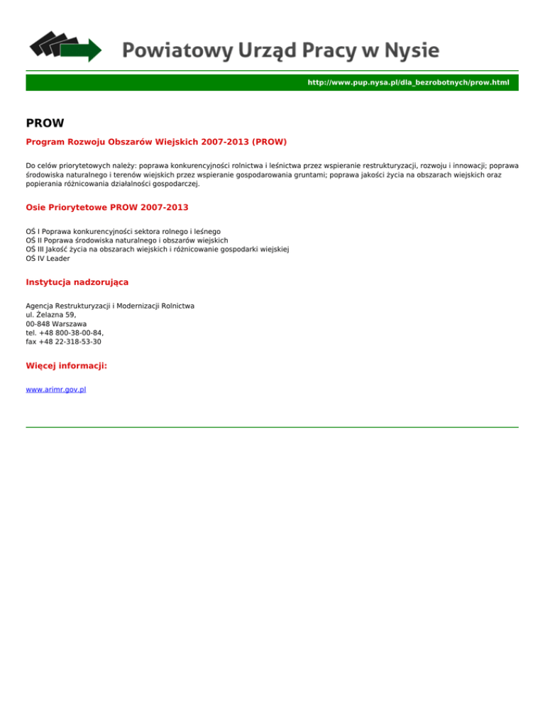 http://www.pup.nysa.pl/dla_bezrobotnych/prow.html PROW Program Rozwoju Obszarów Wiejskich 2007-2013 (PROW) Do celów priorytetowych należy: poprawa konkurencyjności rolnictwa i leśnictwa przez wspieranie restrukturyzacji, rozwoju i innowacji; poprawa środowiska naturalnego i terenów wiejskich przez wspieranie gospodarowania gruntami; poprawa jakości życia na obszarach wiejskich oraz popierania różnicowania działalności gospodarczej. Osie Priorytetowe PROW 2007-2013 OŚ I Poprawa konkurencyjności sektora rolnego i leśnego OŚ II Poprawa środowiska naturalnego i obszarów wiejskich OŚ III Jakość życia na obszarach wiejskich i różnicowanie gospodarki wiejskiej OŚ IV Leader Instytucja nadzorująca Agencja Restrukturyzacji i Modernizacji Rolnictwa ul. Żelazna 59, 00-848 Warszawa tel. +48 800-38-00-84, fax +48 22-318-53-30 Więcej informacji: www.arimr.gov.pl