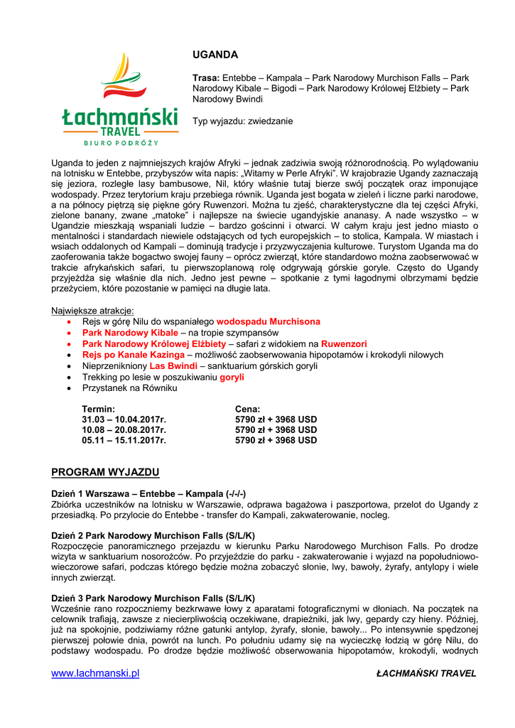 UGANDA Trasa: Entebbe – Kampala – Park Narodowy Murchison Falls – Park Narodowy Kibale – Bigodi – Park Narodowy Królowej Elżbiety – Park Narodowy Bwindi Typ wyjazdu: zwiedzanie Uganda to jeden z najmniejszych krajów Afryki – jednak zadziwia swoją różnorodnością. Po wylądowaniu na lotnisku w Entebbe, przybyszów wita napis: „Witamy w Perle Afryki”. W krajobrazie Ugandy zaznaczają się jeziora, rozległe lasy bambusowe, Nil, który właśnie tutaj bierze swój początek oraz imponujące wodospady. Przez terytorium kraju przebiega równik. Uganda jest bogata w zieleń i liczne parki narodowe, a na północy piętrzą się piękne góry Ruwenzori. Można tu zjeść, charakterystyczne dla tej części Afryki, zielone banany, zwane „matoke” i najlepsze na świecie ugandyjskie ananasy. A nade wszystko – w Ugandzie mieszkają wspaniali ludzie – bardzo gościnni i otwarci. W całym kraju jest jedno miasto o mentalności i standardach niewiele odstających od tych europejskich – to stolica, Kampala. W miastach i wsiach oddalonych od Kampali – dominują tradycje i przyzwyczajenia kulturowe. Turystom Uganda ma do zaoferowania także bogactwo swojej fauny – oprócz zwierząt, które standardowo można zaobserwować w trakcie afrykańskich safari, tu pierwszoplanową rolę odgrywają górskie goryle. Często do Ugandy przyjeżdża się właśnie dla nich. Jedno jest pewne – spotkanie z tymi łagodnymi olbrzymami będzie przeżyciem, które pozostanie w pamięci na długie lata. Największe atrakcje: Rejs w górę Nilu do wspaniałego wodospadu Murchisona Park Narodowy Kibale – na tropie szympansów Park Narodowy Królowej Elżbiety – safari z widokiem na Ruwenzori Rejs po Kanale Kazinga – możliwość zaobserwowania hipopotamów i krokodyli nilowych Nieprzenikniony Las Bwindi – sanktuarium górskich goryli Trekking po lesie w poszukiwaniu goryli Przystanek na Równiku Termin: 31.03 – 10.04.2017r. 10.08 – 20.08.2017r. 05.11 – 15.11.2017r. Cena: 5790 zł + 3968 USD 5790 zł + 3968 USD 5790 zł + 3968 USD PROGRAM WYJAZDU Dzień 1 Warszawa – Entebbe – Kampala (-/-/-) Zbiórka uczestników na lotnisku w Warszawie, odprawa bagażowa i paszportowa, przelot do Ugandy z przesiadką. Po przylocie do Entebbe - transfer do Kampali, zakwaterowanie, nocleg. Dzień 2 Park Narodowy Murchison Falls (S/L/K) Rozpoczęcie panoramicznego przejazdu w kierunku Parku Narodowego Murchison Falls. Po drodze wizyta w sanktuarium nosorożców. Po przyjeździe do parku - zakwaterowanie i wyjazd na popołudniowowieczorowe safari, podczas którego będzie można zobaczyć słonie, lwy, bawoły, żyrafy, antylopy i wiele innych zwierząt. Dzień 3 Park Narodowy Murchison Falls (S/L/K) Wcześnie rano rozpoczniemy bezkrwawe łowy z aparatami fotograficznymi w dłoniach. Na początek na celownik trafiają, zawsze z niecierpliwością oczekiwane, drapieżniki, jak lwy, gepardy czy hieny. Później, już na spokojnie, podziwiamy różne gatunki antylop, żyrafy, słonie, bawoły... Po intensywnie spędzonej pierwszej połowie dnia, powrót na lunch. Po południu udamy się na wycieczkę łodzią w górę Nilu, do podstawy wodospadu. Po drodze będzie możliwość obserwowania hipopotamów, krokodyli, wodnych www.lachmanski.pl ŁACHMAŃSKI TRAVEL antylop, a także dużej różnorodności ptaków, w tym - rzadkiego trzewikodzioba. Łódź zatrzyma się zaledwie 10 m od "Diabelskiego Kotła". Będzie okazja by zrobić zdjęcia majestatycznego wodospadu Murchisona, który jest istnym cudem na Nilu; jego wody opadają z hukiem w dół, tworząc piękną tęczę. Po opuszczeniu łodzi wspinaczka na szczyt wodospadu, skąd będzie można podziwiać wspaniałą panoramę Nilu. Dzień 4 Park Narodowy Kibale (S/L/K) Wyjazd w kierunku P.N. Kibale. Czeka nas dosyć długi przejazd wzdłuż Ryftu Albertine. Po drodze będziemy podziwiać wzgórza, doliny, mijać lokalne wioski. Dzień 5 Park Narodowy Kibale – Bigodi (S/L/K) Wczesne śniadanie i przejazd do Centrum Kanyanchu na briefing przed wyprawą szlakiem szympansów. Będziemy oczarowani oglądając szympansy i inne naczelne, zamieszkujące ten las. W trakcie trekkingu, naprawdę z bliska, przyjrzymy się tym zabawnym naczelnym, z ich zachowaniami tak łudząco podobnymi do naszych. Warto pamiętać, że różnica w genach pomiędzy szympansem, a człowiekiem to jedynie 1,3%. Po południu spacer po bagnach Bigodi. Jest to inicjatywa miejscowej ludności, służąca ochronie okolicznych obszarów. Podczas spaceru będzie okazja zobaczenia różnych gatunków ptaków i motyli, a także naczelnych (m. in. gerezy). Występuje tutaj także różnorodność wielu interesujących gatunków roślin. Dzień 6 Park Narodowy Królowej Elżbiety (S/L/K) Wyruszymy w malowniczą, 3-godzinną drogę do Parku Narodowego Królowej Elżbiety - poprzez region Kasese, słynący z Gór Ruwenzori i kraterowych jezior. Lunch i chwila relaksu w lodge. Na zakończenie dnia - safari przy zachodzie słońca. Dzień 7 Park Narodowy Królowej Elżbiety (S/L/K) O świcie safari przy wschodzie słońca. Park Narodowy Królowej Elżbiety to zróżnicowany ekosystem sawanny, lasów tropikalnych, rzek, bagien, jezior i wulkanicznych kraterów. Safari w parku, z widokiem na Rwenzori, stwarza doskonałe warunki zobaczenia lwów, lampartów, guźców, bawołów, słoni, antylop, kobów i topi. Po południu - rejs po słynnym kanale Kazinga. Rejs ten będzie doskonałą okazją do fotografowania i podziwiania przyrody, w szczególności - kolorowego i różnorodnego ptactwa. Przy odrobinie szczęścia istnieje możliwość zobaczenia hipopotamów i krokodyli nilowych, wylegujących się na słońcu z szeroko otwartymi paszczami. Dzień 8 Park Narodowy Bwindi (S/L/K) Safari przy wschodzie słońca. Po śniadaniu pożegnanie z Parkiem Narodowym Królowej Elżbiety i następnie przejazd do Parku Narodowego Bwindi, będącego domem górskich goryli. Dzień 9 Park Narodowy Bw