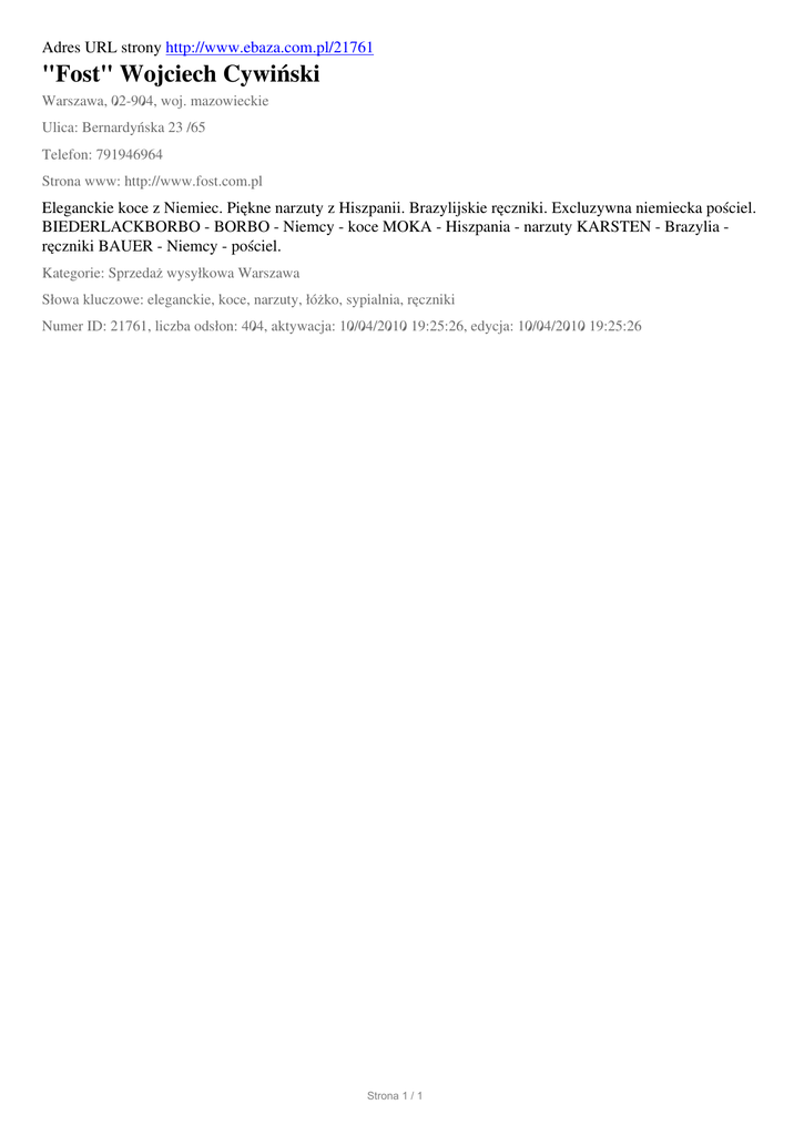 Adres URL strony http://www.ebaza.com.pl/21761 "Fost" Wojciech Cywiński Warszawa, 02-904, woj. mazowieckie Ulica: Bernardyńska 23 /65 Telefon: 791946964 Strona www: http://www.fost.com.pl Eleganckie koce z Niemiec. Piękne narzuty z Hiszpanii. Brazylijskie ręczniki. Excluzywna niemiecka pościel. BIEDERLACKBORBO - BORBO - Niemcy - koce MOKA - Hiszpania - narzuty KARSTEN - Brazylia ręczniki BAUER - Niemcy - pościel. Kategorie: Sprzedaż wysyłkowa Warszawa Słowa kluczowe: eleganckie, koce, narzuty, łóżko, sypialnia, ręczniki Numer ID: 21761, liczba odsłon: 404, aktywacja: 10/04/2010 19:25:26, edycja: 10/04/2010 19:25:26 Strona 1 / 1