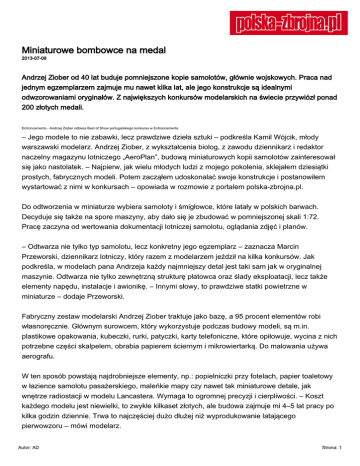 Miniaturowe bombowce na medal 2013-07-08 Andrzej Ziober od 40 lat buduje pomniejszone kopie samolotów, głównie wojskowych. Praca nad jednym egzemplarzem zajmuje mu nawet kilka lat, ale jego konstrukcje są idealnymi odwzorowaniami oryginałów. Z największych konkursów modelarskich na świecie przywiózł ponad 200 złotych medali. Entroncamento - Andrzej Ziober odbiera Best of Show portugalskiego konkursu w Entroncamento. – Jego modele to nie zabawki, lecz prawdziwe dzieła sztuki – podkreśla Kamil Wójcik, młody warszawski modelarz. Andrzej Ziober, z wykształcenia biolog, z zawodu dziennikarz i redaktor naczelny magazynu lotniczego „AeroPlan”, budową miniaturowych kopii samolotów zainteresował się jako nastolatek. – Najpierw, jak wielu młodych ludzi z mojego pokolenia, sklejałem dziesiątki prostych, fabrycznych modeli. Potem zacząłem udoskonalać swoje konstrukcje i postanowiłem wystartować z nimi w konkursach – opowiada w rozmowie z portalem polska-zbrojna.pl. Do odtworzenia w miniaturze wybiera samoloty i śmigłowce, które latały w polskich barwach. Decyduje się także na spore maszyny, aby dało się je zbudować w pomniejszonej skali 1:72. Pracę zaczyna od wertowania dokumentacji lotniczej samolotu, oglądania zdjęć i planów. – Odtwarza nie tylko typ samolotu, lecz konkretny jego egzemplarz – zaznacza Marcin Przeworski, dziennikarz lotniczy, który razem z modelarzem jeździł na kilka konkursów. Jak podkreśla, w modelach pana Andrzeja każdy najmniejszy detal jest taki sam jak w oryginalnej maszynie. Odtwarza nie tylko zewnętrzną strukturę płatowca oraz ślady eksploatacji, lecz także elementy napędu, instalacje i awionikę. – Innymi słowy, to prawdziwe statki powietrzne w miniaturze – dodaje Przeworski. Fabryczny zestaw modelarski Andrzej Ziober traktuje jako bazę, a 95 procent elementów robi własnoręcznie. Głównym surowcem, który wykorzystuje podczas budowy modeli, są m.in. plastikowe opakowania, kubeczki, rurki, patyczki, karty telefoniczne, które opiłowuje, wycina z nich potrzebne części skalpelem, obrabia papierem ściernym i mikrowiertarką. Do malowania używa aerografu. W ten sposób powstają najdrobniejsze elementy, np.: popielniczki przy fotelach, papier toaletowy w łazience samolotu pasażerskiego, maleńkie mapy czy nawet tak miniaturowe detale, jak wnętrze radiostacji w modelu Lancastera. Wymaga to ogromnej precyzji i cierpliwości. – Koszt każdego modelu jest niewielki, to zwykle kilkaset złotych, ale budowa zajmuje mi 4–5 lat pracy po kilka godzin dziennie. Trwa to najczęściej dużo dłużej niż wyprodukowanie latającego pierwowzoru – mówi modelarz. Autor: AD Strona: 1 Hoboken - puchary zdobyte za model Lancastera w największym belgijskim konkursie w Hoboken. Trud się opłaca, bo jego modele od lat zdobywają nagrody na konkursach. Z rywalizacji w 27 krajach przywiózł już ponad 200 złotych medali oraz dziesiątki pucharów i innych wyróżnień. – Od wielu lat pan Andrzej nie przegrał żadnego konkursu, a jeśli zajął drugie miejsce, to tylko dlatego, że wystawił dwa modele w jednej kategorii i zgarnął 1. i 2. nagrodę – podkreśla Kamil Wójcik. Pięciokrotnie był mistrzem Polski w modelarstwie redukcyjnym. Otrzymał też najwyższe polskie sportowe odznaczenie w tej dziedzinie – Złotą Odznakę Modelarską z Trzema Diamentami. Ma także na swoim koncie zwycięstwa w najbardziej prestiżowych konkursach organizowanych na pięciu kontynentach. Pierwszy sukces odniósł w brytyjskim Telford, potem po licznych startach w Unii Europejskiej zajął pierwsze miejsce w zawodach w Ankarze i zwyciężył w USA w jednym z największych konkursów modeli redukcyjnych na świecie. W 2011 roku zdobył cztery główne nagrody w australijskim konkursie w Melbourne, a w czerwcu tego roku wygrał główną nagrodę w Rio de Janeiro. Konstrukcje modelarza nie tylko wygrywają rywalizację w swojej klasie, lecz zdobywają także najcenniejsze tytuły „Best of Show” przyznawane najlepszemu modelowi całego konkursu. Były też wystawiane w muzeach lotniczych, m.in. w Pradze, Budapeszcie, Brukseli oraz w słynnym włoskim muzeum modelarstwa w Voghenza. Dziś, informuje pan Andrzej, ma pięć modeli wykonanych na poziomie konkursowym. Jednym z nich jest Liberator B-24, którym podczas II wojny latał kpt. pil. Zbigniew Szostak z polskiej 1586 Eskadry Specjalnego Przeznaczenia. Samolot dostarczał w 1944 roku broń i zaopatrzenie dla walczącej w powstaniu Warszawy. W czasie jednej z misji został zestrzelony przez Niemców w okolicy Bochni. Część samolotu została wykorzystana do rekonstrukcji Liberatora stojącego w Muzeum Powstania Warszawskiego. W kolekcji pana Andrzeja jest również bombowiec Avro Lancaster, którym latały polskie załogi z 300 Dywizjonu z zadaniem bombardowania terenu Niemiec, oraz używany po wojnie przez polskie lotnictwo radziecki wojskowy samolot transportowy Li-2. Zbudował również model pasażerskiego niemieckiego hydroplanu Junkers G-23. Jego pierwowzór w okresie międzywojennym przez jakiś czas obsługiwał linię lotniczą poznańskiej spółki Aerolot. Od sześciu lat pasjonat pracuje nad modelem ciężkiego radzieckiego śmigłowca transportowego Mi-6. – Chcę przełamać opinię, że sędziowie światowych konkursów niezbyt chętnie nagradzają głównymi trofeami modele śmigłowców – mówi z przekorą. Trzy Mi-6 służyły w 37 Pułku Autor: AD Strona: 2 Śmigłowców Transportowych w Leźnicy Wielkiej. Po wycofaniu w 1990 roku ze służby dwa sprzedano na Ukrainę, a jeden stoi w prywatnej kolekcji lotniczej w Łodzi. Właśnie ten odtwarza pan Andrzej. Za promowanie polskiego lotnictwa modelarz był kilkakrotnie laureatem Nagrody Specjalnej Dowództwa Wojsk Lotniczych, a dziewięć lat temu został jako jedyny modelarz redukcyjny odznaczony najwyższym honorowym polskim wyróżnieniem lotniczym – Dyplomem Błękitnych Skrzyde
