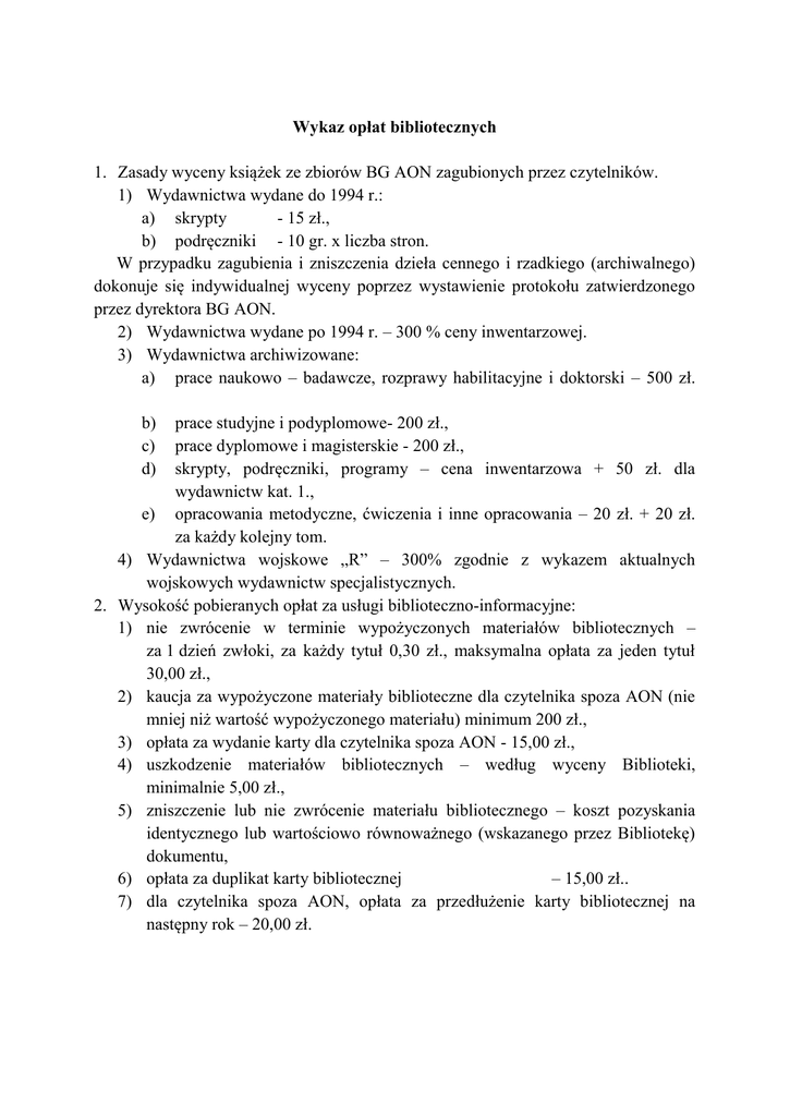Wykaz opłat bibliotecznych 1. Zasady wyceny książek ze zbiorów BG AON zagubionych przez czytelników. 1) Wydawnictwa wydane do 1994 r.: a) skrypty - 15 zł., b) podręczniki - 10 gr. x liczba stron. W przypadku zagubienia i zniszczenia dzieła cennego i rzadkiego (archiwalnego) dokonuje się indywidualnej wyceny poprzez wystawienie protokołu zatwierdzonego przez dyrektora BG AON. 2) Wydawnictwa wydane po 1994 r. – 300 % ceny inwentarzowej. 3) Wydawnictwa archiwizowane: a) prace naukowo – badawcze, rozprawy habilitacyjne i doktorski – 500 zł. prace studyjne i podyplomowe- 200 zł., prace dyplomowe i magisterskie - 200 zł., skrypty, podręczniki, programy – cena inwentarzowa + 50 zł. dla wydawnictw kat. 1., e) opracowania metodyczne, ćwiczenia i inne opracowania – 20 zł. + 20 zł. za każdy kolejny tom. 4) Wydawnictwa wojskowe „R” – 300% zgodnie z wykazem aktualnych wojskowych wydawnictw specjalistycznych. 2. Wysokość pobieranych opłat za usługi biblioteczno-informacyjne: 1) nie zwrócenie w terminie wypożyczonych materiałów bibliotecznych – za 1 dzień zwłoki, za każdy tytuł 0,30 zł., maksymalna opłata za jeden tytuł 30,00 zł., 2) kaucja za wypożyczone materiały biblioteczne dla czytelnika spoza AON (nie mniej niż wartość wypożyczonego materiału) minimum 200 zł., 3) opłata za wydanie karty dla czytelnika spoza AON - 15,00 zł., 4) uszkodzenie materiałów bibliotecznych – według wyceny Biblioteki, minimalnie 5,00 zł., 5) zniszczenie lub nie zwrócenie materiału bibliotecznego – koszt pozyskania identycznego lub wartościowo równoważnego (wskazanego przez Bibliotekę) dokumentu, 6) opłata za duplikat karty bibliotecznej – 15,00 zł.. 7) dla czytelnika spoza AON, opłata za przedłużenie karty bibliotecznej na następny rok – 20,00 zł. b) c) d)