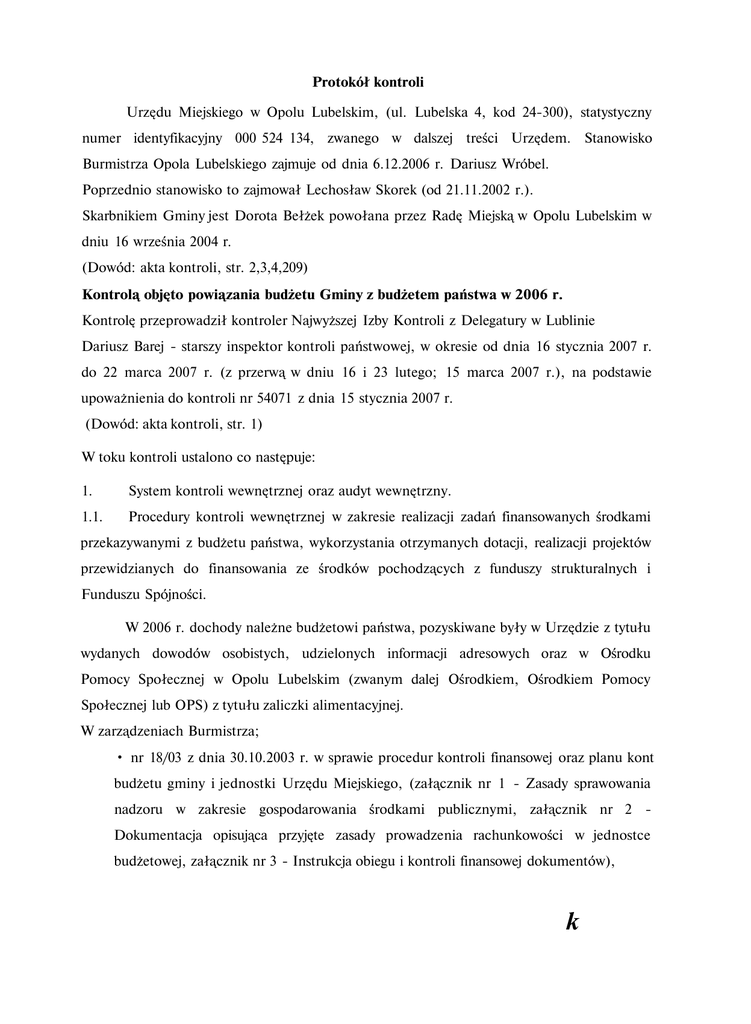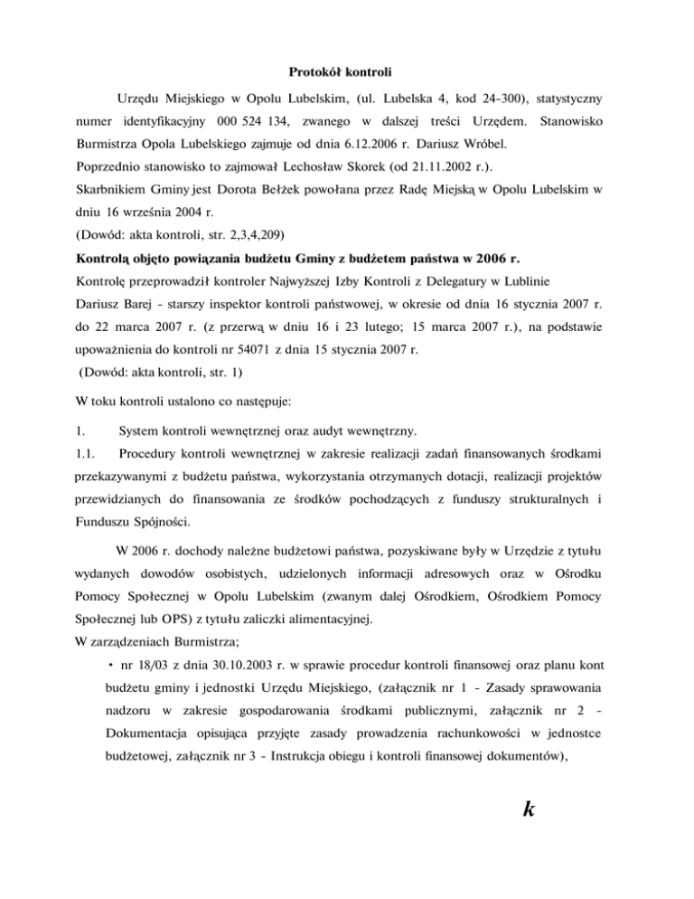 Protokół kontroli Urzędu Miejskiego w Opolu Lubelskim, (ul. Lubelska 4, kod 24-300), statystyczny numer identyfikacyjny 000 524 134, zwanego w dalszej treści Urzędem. Stanowisko Burmistrza Opola Lubelskiego zajmuje od dnia 6.12.2006 r. Dariusz Wróbel. Poprzednio stanowisko to zajmował Lechosław Skorek (od 21.11.2002 r.). Skarbnikiem Gminy jest Dorota Bełżek powołana przez Radę Miejską w Opolu Lubelskim w dniu 16 września 2004 r. (Dowód: akta kontroli, str. 2,3,4,209) Kontrolą objęto powiązania budżetu Gminy z budżetem państwa w 2006 r. Kontrolę przeprowadził kontroler Najwyższej Izby Kontroli z Delegatury w Lublinie Dariusz Barej - starszy inspektor kontroli państwowej, w okresie od dnia 16 stycznia 2007 r. do 22 marca 2007 r. (z przerwą w dniu 16 i 23 lutego; 15 marca 2007 r.), na podstawie upoważnienia do kontroli nr 54071 z dnia 15 stycznia 2007 r. (Dowód: akta kontroli, str. 1) W toku kontroli ustalono co następuje: 1. System kontroli wewnętrznej oraz audyt wewnętrzny. 1.1. Procedury kontroli wewnętrznej w zakresie realizacji zadań finansowanych środkami przekazywanymi z budżetu państwa, wykorzystania otrzymanych dotacji, realizacji projektów przewidzianych do finansowania ze środków pochodzących z funduszy strukturalnych i Funduszu Spójności. W 2006 r. dochody należne budżetowi państwa, pozyskiwane były w Urzędzie z tytułu wydanych dowodów osobistych, udzielonych informacji adresowych oraz w Ośrodku Pomocy Społecznej w Opolu Lubelskim (zwanym dalej Ośrodkiem, Ośrodkiem Pomocy Społecznej lub OPS) z tytułu zaliczki alimentacyjnej. W zarządzeniach Burmistrza; • nr 18/03 z dnia 30.10.2003 r. w sprawie procedur kontroli finansowej oraz planu kont budżetu gminy i jednostki Urzędu Miejskiego, (załącznik nr 1 - Zasady sprawowania nadzoru w zakresie gospodarowania środkami publicznymi, załącznik nr 2 Dokumentacja opisująca przyjęte zasady prowadzenia rachunkowości w jednostce budżetowej, załącznik nr 3 - Instrukcja obiegu i kontroli finansowej dokumentów), k -2- • nr 19/03 z dnia 5.11.2003 r. w sprawie przestrzegania przez jednostki podległe i nadzorowane procedur kontroli oraz zasad wstępnej oceny celowości ponoszenia wydatków i sposobu wykorzystania wyników kontroli, • nr l/PKF/2006 w sprawie procedury kontroli finansowej w Urzędzie Miejskim w Opolu Lubelskim w związku z realizacją projektu „Budowa boiska wiejskiego z wyposażeniem w Pusznie Godowskim" współfinansowanego ze środków Europejskiego Funduszu Orientacji i Gwarancji Rolnej, • nr 2/PKF/2006 w sprawie procedury kontroli finansowej w Urzędzie Miejskim w Opolu Lubelskim w związku z realizacją projektu „Przebudowa oczyszczalni ścieków i rozbudowa sieci kanalizacji sanitarnej w Opolu Lubelskim" współfinansowanego ze środków Europejskiego Funduszu Rozwoju Regionalnego w ramach ZPORR, • nr 3/PKF/2003 w sprawie procedury kontroli finansowej w Urzędzie Miejskim w Opolu Lubelskim w związku z realizacją projektu „Rozbudowa infrastruktury informatycznej Gminy Opole Lubelskie", współfinansowanego ze środków Europejskiego Funduszu Rozwoju Regionalnego w ramach ZPORR, określono zasady i procedury, dotyczące postępowania w zakresie pozyskiwania dochodów i wydatków budżetowych oraz kontroli w tym zakresie, bez uwzględnienia procedur, dotyczących dochodów należnych budżetowi państwa. (Dowód: akta kontroli, str. 6-7) 1.2. Audyt wewnętrzny. Urząd nie był zobowiązany do powołania audytora wewnętrznego i nie powołał go. (Dowód: akta kontroli, str. 6-7) 2. Dochody związane z realizacją zadań z zakresu administracji rządowej oraz innych zadań zleconych ustawami. Tabela nr 1. Dochody planowane i wykonane związane z realizacją zadań z zakresu administracji rządowej oraz innych zadań zleconych. [zł] Należności pozostałe do zapłaty w tym Należności (saldo pocz. +przypisy odpisy) 1 OGÓŁEM, z tego: dział 750 3 106 000 4 741 291,26 5 76 439,18 potrącone przez jednostkę samorządu terytorialne go 6 4 816,62 106 000 74 228,80 74 228,80 3 711,44 70 061,36 - - - rozdział 75011 106 000 74 228,80 74 228,80 3 711,44 70 061,36 - - - 5 V Wyszczególnienie Plan Dochody wykonane ogółem Dochody przekazane 7 71 166,5 ogółem 8 664 852,08 w tym zaległości 9 664 852,08 fc«?~1/ Nadpłaty 10 - §0690 106 000 dział 852 rozdział 85212 §0970 - 74 228,80 667 062,46 667 062,46 667 062,46 74 228,80 2 210,38 2 210,38 2 210,38 3 711,44 1 105,18 1 105,18 1 105,18 70 061,36 1 105,20 1 105,20 1 105,20 - - 664 852,08 664 852,08 664 852,08 664 852,08 664 852,08 664 852,08 Dochody zrealizowane w dziale 750 - Administracja publiczna, rozdział 75011 Urzędy wojewódzkie, § 0690 - Wpływy z różnych opłat, pochodziły z wpłat za wydane dowody osobiste oraz opłat za udostępnienie danych ze zbiorów meldunkowych i wyniosły 74 228,80 zł. Z kwoty tej, 70 061,36 zł (94,39%) przekazano na konto Lubelskiego Urzędu Wojewódzkiego w Lublinie (LUW), natomiast 3 711,44 zł (5%) stanowiło dochód własny. Dochody zrealizowane w dziale 850 - Pomoc społeczna, rozdział 85212 - Świadczenia rodzinne, zaliczka alimentacyjna (...), § 0970 - Wpływy z różnych opłat, pochodziły z wpłat z tytułu zwrotu zaliczki alimentacyjnej i wyniosły 2 210,38 zł. Z kwoty tej, 1 105,20 zł (50 %) przekazano na konto LUW, natomiast 1 105,18 zł (50 %) stanowiło dochód własny Gminy. (Dowód: akta kontroli, str. 8, 9-10,12) 2.1. Planowanie dochodów związanych z realizacją zadań z zakresu administracji rządowej oraz innych zadań zleconych ustawami. 2.1.1. Przekazanie Urzędowi informacji o planowanych kwotach dochodów związanych z realizacją zadań z zakresu administracji rządowej oraz innych zadań zleconych ustawami, które podlegają przekazaniu do budżetu państwa. Henryk Kaproń dyrektor Wydziału Finansów i Budżetu LUW, z upoważnienia Wojewody Lubelskiego, przekazał Burmistrzowi pismo nr ' FB.1.3010/11/05 z dnia 21.10.200