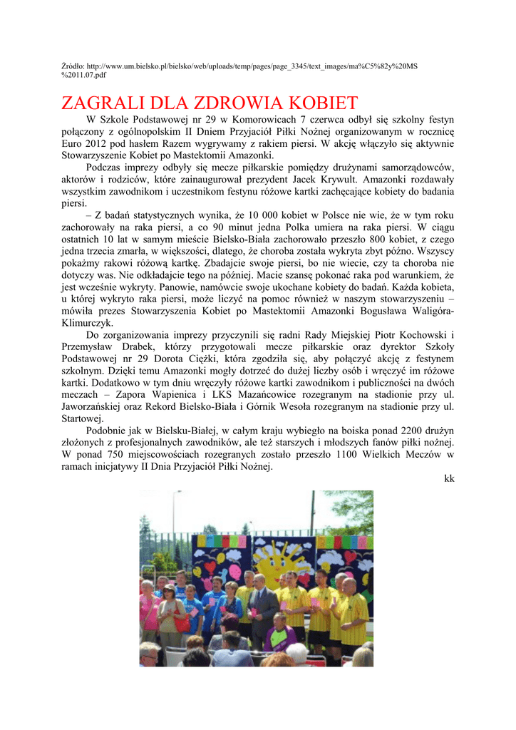 Żródło: http://www.um.bielsko.pl/bielsko/web/uploads/temp/pages/page_3345/text_images/ma%C5%82y%20MS %2011.07.pdf ZAGRALI DLA ZDROWIA KOBIET W Szkole Podstawowej nr 29 w Komorowicach 7 czerwca odbył się szkolny festyn połączony z ogólnopolskim II Dniem Przyjaciół Piłki Nożnej organizowanym w rocznicę Euro 2012 pod hasłem Razem wygrywamy z rakiem piersi. W akcję włączyło się aktywnie Stowarzyszenie Kobiet po Mastektomii Amazonki. Podczas imprezy odbyły się mecze piłkarskie pomiędzy drużynami samorządowców, aktorów i rodziców, które zainaugurował prezydent Jacek Krywult. Amazonki rozdawały wszystkim zawodnikom i uczestnikom festynu różowe kartki zachęcające kobiety do badania piersi. – Z badań statystycznych wynika, że 10 000 kobiet w Polsce nie wie, że w tym roku zachorowały na raka piersi, a co 90 minut jedna Polka umiera na raka piersi. W ciągu ostatnich 10 lat w samym mieście Bielsko-Biała zachorowało przeszło 800 kobiet, z czego jedna trzecia zmarła, w większości, dlatego, że choroba została wykryta zbyt późno. Wszyscy pokażmy rakowi różową kartkę. Zbadajcie swoje piersi, bo nie wiecie, czy ta choroba nie dotyczy was. Nie odkładajcie tego na później. Macie szansę pokonać raka pod warunkiem, że jest wcześnie wykryty. Panowie, namówcie swoje ukochane kobiety do badań. Każda kobieta, u której wykryto raka piersi, może liczyć na pomoc również w naszym stowarzyszeniu – mówiła prezes Stowarzyszenia Kobiet po Mastektomii Amazonki Bogusława WaligóraKlimurczyk. Do zorganizowania imprezy przyczynili się radni Rady Miejskiej Piotr Kochowski i Przemysław Drabek, którzy przygotowali mecze piłkarskie oraz dyrektor Szkoły Podstawowej nr 29 Dorota Ciężki, która zgodziła się, aby połączyć akcję z festynem szkolnym. Dzięki temu Amazonki mogły dotrzeć do dużej liczby osób i wręczyć im różowe kartki. Dodatkowo w tym dniu wręczyły różowe kartki zawodnikom i publiczności na dwóch meczach – Zapora Wapienica i LKS Mazańcowice rozegranym na stadionie przy ul. Jaworzańskiej oraz Rekord Bielsko-Biała i Górnik Wesoła rozegranym na stadionie przy ul. Startowej. Podobnie jak w Bielsku-Białej, w całym kraju wybiegło na boiska ponad 2200 drużyn złożonych z profesjonalnych zawodników, ale też starszych i młodszych fanów piłki nożnej. W ponad 750 miejscowościach rozegranych zostało przeszło 1100 Wielkich Meczów w ramach inicjatywy II Dnia Przyjaciół Piłki Nożnej. kk