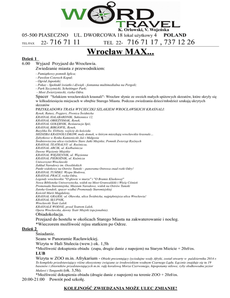 05-500 PIASECZNO TEL/FAX 22- 716 K. Orłowski, V. Wojeńska UL. DWORCOWA 18 lokal użytkowy 4 POLAND 71 11 TEL 22- 716 71 17 , 737 12 26 Wrocław MAX... Dzień 1 6.00 Wyjazd Przyjazd do Wrocławia. Zwiedzanie miasta z przewodnikiem: - Pamiątkowy pomnik Iglica; - Pawilon Czterech Kopuł; - Ogród Japoński; - Pokaz - Spektakl światło i dźwięk - fontanna multimedialna na Pergoli; - Park Szczytnicki, Scheitinger Park; - Most Zwierzyniecki, rzeka Odra. Spacer "Szlakiem wrocławskich krasnali"- Wrocław słynie ze swoich małych spiżowych skrzatów, które skryły się w kilkudziesięciu miejscach w obrębie Starego Miasta. Podczas zwiedzania dzieci/młodzież szukają ukrytych skrzatów PRZYKŁADOWA TRASA WYCIECZKI SZLAKIEM WROCŁAWSKICH KRASNALI: Rynek, Ratusz, Pręgierz, Piwnica Świdnicka KRASNAL HALABARDNIK, Sukiennice 12, KRASNAL OBIEŻYSMAK, Rynek, KRASNAL GOŁĘBNIK, Restauracja Spiż, KRASNAL BIBLIOFIL, Rynek, Bazylika Św. Elżbiety, wejście do kościoła SIEDZIBA KRASNOLUDKÓW, mały domek, w którym mieszkają wrocławskie krasnale… Zabytkowe w Rynku Kamieniczki Jaś i Małgosia Średniowieczna ulica rzeźników Stare Jatki Miejskie, Pomnik Zwierząt Rzeźnych KRASNAL TEATRALNY: ul. Rzeźnicza, KRASNAL ARCIK, ul. Kiełbaśnicza Dawne Więzienie Miejskie KRASNAL WIĘZIENNIK, ul. Więzienna KRASNAL PIEROŻNIK, ul. Kużnicza Uniwersytet Wrocławski Zakład Narodowy im. Ossolińskich Punkt widokowy na Ostrów Tumski – panorama Ostrowa znad rzeki Odry! KRASNAL TUMSKI: Wyspa Słodowa, KRASNAL PRACZ, rzeka Odra, Legendy wrocławskie "O głowie w murze" i "O Bramie Kluskowej" Nowa Biblioteka Uniwersytecka, widok na Most Grunwaldzki i Wieżę Ciśnień Promenada Staromiejska, Muzeum Narodowe, widok na Ostrów Tumski Zatoka Gondoli, spacer wzdłuż Promenady Staromiejskiej Kościół Marii Magdaleny, KRASNAL GRAJEK: ul. Oławska, ulica Świdnicka, najpiękniejsza ulica Wrocławia! KRASNAL SŁUPNIK, Wrocławski Teatr Lalek KRASNALE WODNE, przed Teatrem Lalek, Opera Wrocławska, dawny Teatr Miejski (opcjonalnie). Obiadokolacja. Przejazd do hostelu w okolicach Starego Miasta na zakwaterowanie i nocleg. *Wieczorem możliwość rejsu statkiem po Odrze. Dzień 2 Śniadanie. Seans w Panoramie Racławickiej. Wizyta w Hali Stulecia (wew.) ok. 1,5h *Możliwość dokupienia obiadu (zupa, drugie danie z napojem) na Starym Mieście + 20zł/os. LUB Wizyta w ZOO m.in. Afrykarium - Obiekt prezentujący życiodajne wody Afryki, został otwarty w październiku 2014 r. To kompleks przedstawiający różne ekosystemy związane ze środowiskiem wodnym Czarnego Lądu. Łącznie znajduje się tu 19 basenów i zbiorników przedstawiających m.in. rafę koralową Morza Czerwonego, hipopotamy nilowe, ryby słodkowodne jezior Malawi i Tanganiki.(ok. 3,5h). *Możliwość dokupienia obiadu (drugie danie z napojem) na terenie ZOO + 20zł/os. 20:00-21:00 Powrót pod szkołę. KOLEJNOŚĆ ZWIEDZANIA MOŻE ULEC ZMIANIE! Świadczenia: - transport lux autokarem marki, np. Mercedes, Volvo, Scania, MAN, Neoplan z WC, DVD, barkiem, uchylnymi siedzeniami - zakwaterowanie w hostelu w okolicach Starego Miasta, pokoje wieloosobowe z łazienkami, - wyżywienie zgodnie z programem - realizacja programu turystycznego - opieka pilota - ubezpieczenie NW 5000 zł - VAT - grupy 30 os. - 2 miejsca gratis dla nauczycieli, od 30 do 45 os. – 3 miejsca gratis dla nauczycieli Cena: 200 zł/min. 40 os. - max. 45 os. płacących Cena: 220 zł/min. 35 os. - max. 39 os. płacących Cena: 240 zł/min. 30 os. - max. 34 os. płacących +dodatkowo bilety wstępu od 50 do 70 zł/os. (kwota ta jest uzależniona od opcji w programie i konkretnych wejść, którymi jesteście Państwo zainteresowani) *Możliwość dokupienia obiadu w ostatnim dniu wycieczki: 1. na Starym Mieście ( zupa, drugie danie, napój) + 20zł/os. LUB 2. na terenie Zoo (drugie danie, napój) + 20zł/os. Standardowy rozmiar naszych autokarów to 49 miejsc (do dyspozycji grupy wraz z opiekunami). Na Państwa życzenie możemy zarezerwować autokary 57-70 miejsc (w tym przypadku prosimy o kontakt z biurem w celu sprawdzenia kalkulacji na ponadstandardowy pojazd i jego dostępności w wybranym przez Państwa terminie). W celu podpisania umowy i rezerwacji konkretnego terminu prosimy o telefon do biura 022 716 71 11 lub 022 716 71 17 lub mail [email protected] Zaliczka konieczna do podpisania umowy: 100 zł/os. Ze względu na szczyt sezonu wycieczek szkolnych w miesiącach maj-czerwiec sugerujemy dokonanie rez. wstępnej. Termin, który Państwa interesuje, potwierdzamy po sprawdzeniu dostępności wolnych miejsc w hotelu. Dokonujemy rezerwacji wstępnej na czas zebrania zaliczek przez nauczyciela (najczęściej nie dłużej niż 4 tyg.). KWOTĘ NA BILETY WSTĘPU POTWIERDZAMY PRZED DOPŁATĄ ZGODNIE Z OBOWIĄZUJĄCYMI CENNIKAMI Wyciąg z warunków uczestnictwa imprez turystycznych organizowanych przez B.P. Word Travel (pełna wersja warunków uczestnictwa dostępna jest u nauczyciela organizującego wycieczkę): 13. W przypadku rezygnacji lub nie uczestniczenia Uczestnika w wykupionej imprezie Organizator uprawniony jest do potrącenia RZECZYWIŚCIE PONIESIONYCH KOSZTÓW. 14. Zmiana uczestnika nie pociąga za sobą kosztów finansowych. 18. Uczestnik odpowiada za wszelkie szkody materialne wyrządzone w trakcie trwania imprezy (zniszczenia w hotelu, autokarze). 15. Jeżeli w programie jest wyjazd poza granicę Polski - uczestnik winien posiadać na miejscu zbiórki aktualnie obowiązujące dokumenty uprawniające do przekroczenia granic krajów objętych programem imprezy (wyłącznie dowód osobisty lub paszport ważny min. 6 m-cy od daty powrotu). 9 B. W przypadku chorób uznawanych za przewlekłe uczestnik winien na własny koszt wykupić dodatkowe ubezpieczenie ! (dotyczy wycieczek zagranicznych). Klient przez dokonanie wpłaty (całkowitej lub częściowej) akceptuje program wycieczki i warunki uczestnictwa.