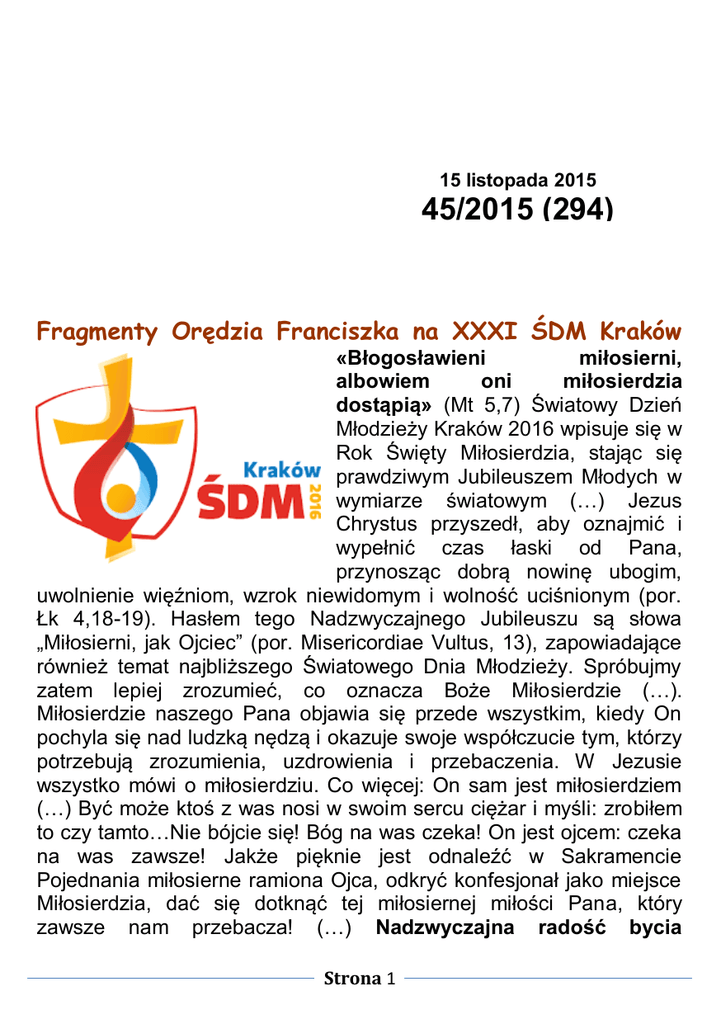 15 listopada 2015 45/2015 (294) Fragmenty Orędzia Franciszka na XXXI ŚDM Kraków «Błogosławieni miłosierni, albowiem oni miłosierdzia dostąpią» (Mt 5,7) Światowy Dzień Młodzieży Kraków 2016 wpisuje się w Rok Święty Miłosierdzia, stając się prawdziwym Jubileuszem Młodych w wymiarze światowym (…) Jezus Chrystus przyszedł, aby oznajmić i wypełnić czas łaski od Pana, przynosząc dobrą nowinę ubogim, uwolnienie więźniom, wzrok niewidomym i wolność uciśnionym (por. Łk 4,18-19). Hasłem tego Nadzwyczajnego Jubileuszu są słowa „Miłosierni, jak Ojciec” (por. Misericordiae Vultus, 13), zapowiadające również temat najbliższego Światowego Dnia Młodzieży. Spróbujmy zatem lepiej zrozumieć, co oznacza Boże Miłosierdzie (…). Miłosierdzie naszego Pana objawia się przede wszystkim, kiedy On pochyla się nad ludzką nędzą i okazuje swoje współczucie tym, którzy potrzebują zrozumienia, uzdrowienia i przebaczenia. W Jezusie wszystko mówi o miłosierdziu. Co więcej: On sam jest miłosierdziem (…) Być może ktoś z was nosi w swoim sercu ciężar i myśli: zrobiłem to czy tamto…Nie bójcie się! Bóg na was czeka! On jest ojcem: czeka na was zawsze! Jakże pięknie jest odnaleźć w Sakramencie Pojednania miłosierne ramiona Ojca, odkryć konfesjonał jako miejsce Miłosierdzia, dać się dotknąć tej miłosiernej miłości Pana, który zawsze nam przebacza! (…) Nadzwyczajna radość bycia Strona 1 Tabor narzędziem Bożego Miłosierdzia. Słowo Boże uczy nas, że „więcej szczęścia jest w dawaniu aniżeli w braniu” (Dz 20,35). Właśnie z tego powodu piąte błogosławieństwo nazywa szczęśliwymi tych, którzy są miłosierni. (…) Zawsze lubię łączyć ewangeliczne błogosławieństwa z 25. rozdziałem Ewangelii wg św. Mateusza, gdzie Jezus wymienia uczynki miłosierdzia i mówi, że to z nich zostaniemy osądzeni. Zapraszam was zatem do ponownego odkrycia uczynków miłosierdzia względem ciała: głodnych nakarmić, spragnionych napoić, nagich przyodziać, podróżnych w dom przyjąć, więźniów pocieszać, chorych nawiedzać, umarłych grzebać. Nie zapominajmy również o uczynkach miłosiernych względem duszy: grzesznych upominać, nieumiejętnych pouczać, wątpiącym dobrze radzić, strapionych pocieszać, krzywdy cierpliwie znosić, urazy chętnie darować, modlić się za żywych i umarłych. Wam, młodym, którzy jesteście bardzo praktyczni, chciałbym zaproponować, abyście przez pierwszych siedem miesięcy 2016 roku, wybierali co miesiąc jeden uczynek miłosierny względem ciała i jeden względem duszy, i realizowali je. Zainspirujcie się modlitwą św. Faustyny, pokornej apostołki Bożego Miłosierdzia w naszych czasach: Dopomóż mi do tego, o Panie, (…) aby oczy moje były miłosierne, bym nigdy nie podejrzewała i nie sądziła według zewnętrznych pozorów, ale upatrywała to, co piękne w duszach bliźnich, i przychodziła im z pomocą. (…) aby słuch mój był miłosierny, bym skłaniała się do potrzeb bliźnich, by uszy moje nie były obojętne na bóle i jęki bliźnich. (…) aby język mój był miłosierny, bym nigdy nie mówiła ujemnie o bliźnich, ale dla każdego miała słowo pociechy i przebaczenia. (…) aby ręce moje były miłosierne i pełne dobrych uczynków, (…) aby nogi moje były miłosierne, bym zawsze śpieszyła z pomocą bliźnim, opanowując swoje własne znużenie i zmęczenie. (…) aby serce moje było miłosierne, bym czuła ze wszystkimi cierpieniami bliźnich (Dzienniczek, 163). Spotykam wielu młodych, którzy mówią, że są zmęczeni życiem w tak bardzo podzielonym świecie, w którym ścierają się zwolennicy różnych poglądów, jest wiele wojen, a niektórzy używają nawet swojej religii do usprawiedliwienia przemocy. Musimy błagać Pana, by obdarzył nas łaską bycia miłosiernymi wobec tych, którzy wyrządzają nam zło. Tak, jak Jezus modlił się za tych, którzy go ukrzyżowali:„Ojcze, przebacz im, bo nie wiedzą, co czynią” (Łk 23,34). Jedyną drogą do przezwyciężenia zła jest miłosierdzie. Strona 2 Tak bardzo chciałbym, byśmy zjednoczyli się w chóralnej modlitwie płynącej z głębi naszych serc, błagając Boga o miłosierdzie dla nas i całego świata! Kraków na nas czeka! Zostało kilka miesięcy do naszego spotkania w Polsce. Kraków, miasto św. Jana Pawła II i św. Faustyny Kowalskiej, czeka na nas z otwartymi ramionami i otwartym sercem. Wierzę, że Boża Opatrzność prowadziła nas do świętowania Jubileuszu Młodych właśnie tam, gdzie żyło tych dwoje wielkich Apostołów Miłosierdzia naszych czasów. Jan Paweł II w 2002 roku osobiście konsekrował w Krakowie sanktuarium Jezusa Miłosiernego, zawierzając świat Bożemu Miłosierdziu i wyrażając pragnienie, by to orędzie dotarło do wszystkich mieszkańców ziemi i wypełniło ich serca nadzieją: „Trzeba tę iskrę Bożej łaski rozniecać. Trzeba przekazywać światu ogień miłosierdzia. W miłosierdziu Boga świat znajdzie pokój, a człowiek szczęście!” (Homilia w Krakowie, 17.08.2002). Drodzy młodzi, Jezus Miłosierny, przedstawiony w wizerunku, czczonym przez lud Boży w Jemu poświęconym sanktuarium w Krakowie, czeka na was. On wam ufa i na was liczy! Ma tak wiele do powiedzenia każdemu i każdej z was… Nie bójcie się spojrzeć Mu w oczy pełne nieskończonej miłości i pozwólcie, aby On ogarnął was swoim miłosiernym spojrzeniem gotowym przebaczyć każdy wasz grzech. Spojrzeniem, które może przemienić wasze życie i uleczyć rany waszych dusz. Spojrzeniem, które zaspokaja najgłębsze pragnienia waszych młodych serc: pragnienie miłości, pokoju, radości i prawdziwego szczęścia. Przyjdźcie do Niego i nie bójcie się! Przyjdźcie, by powiedzieć Mu z głębi waszych serc: „Jezu ufam Tobie!”. Pozwólcie, by dotknęło was Jego bezgraniczne Miłosierdzie, abyście wy z kolei, poprzez uczynki, słowa i modl