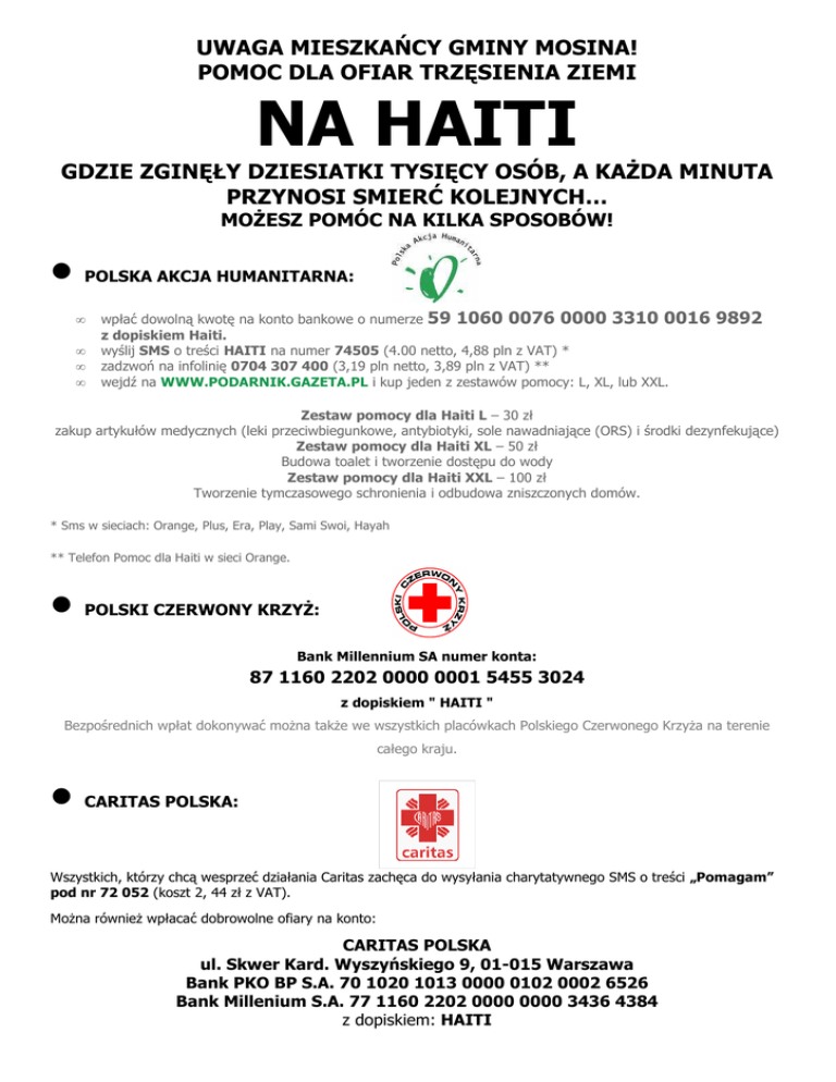 UWAGA MIESZKAŃCY GMINY MOSINA! POMOC DLA OFIAR TRZĘSIENIA ZIEMI NA HAITI GDZIE ZGINĘŁY DZIESIATKI TYSIĘCY OSÓB, A KAśDA MINUTA PRZYNOSI SMIERĆ KOLEJNYCH… MOśESZ POMÓC NA KILKA SPOSOBÓW! • POLSKA AKCJA HUMANITARNA: • • • • wpłać dowolną kwotę na konto bankowe o numerze 59 1060 0076 0000 3310 0016 z dopiskiem Haiti. wyślij SMS o treści HAITI na numer 74505 (4.00 netto, 4,88 pln z VAT) * zadzwoń na infolinię 0704 307 400 (3,19 pln netto, 3,89 pln z VAT) ** wejdź na WWW.PODARNIK.GAZETA.PL i kup jeden z zestawów pomocy: L, XL, lub XXL. 9892 Zestaw pomocy dla Haiti L – 30 zł zakup artykułów medycznych (leki przeciwbiegunkowe, antybiotyki, sole nawadniające (ORS) i środki dezynfekujące) Zestaw pomocy dla Haiti XL – 50 zł Budowa toalet i tworzenie dostępu do wody Zestaw pomocy dla Haiti XXL – 100 zł Tworzenie tymczasowego schronienia i odbudowa zniszczonych domów. * Sms w sieciach: Orange, Plus, Era, Play, Sami Swoi, Hayah ** Telefon Pomoc dla Haiti w sieci Orange. • POLSKI CZERWONY KRZYś: Bank Millennium SA numer konta: 87 1160 2202 0000 0001 5455 3024 z dopiskiem " HAITI " Bezpośrednich wpłat dokonywać moŜna takŜe we wszystkich placówkach Polskiego Czerwonego KrzyŜa na terenie całego kraju. • CARITAS POLSKA: Wszystkich, którzy chcą wesprzeć działania Caritas zachęca do wysyłania charytatywnego SMS o treści „Pomagam” pod nr 72 052 (koszt 2, 44 zł z VAT). MoŜna równieŜ wpłacać dobrowolne ofiary na konto: CARITAS POLSKA ul. Skwer Kard. Wyszyńskiego 9, 01-015 Warszawa Bank PKO BP S.A. 70 1020 1013 0000 0102 0002 6526 Bank Millenium S.A. 77 1160 2202 0000 0000 3436 4384 z dopiskiem: HAITI