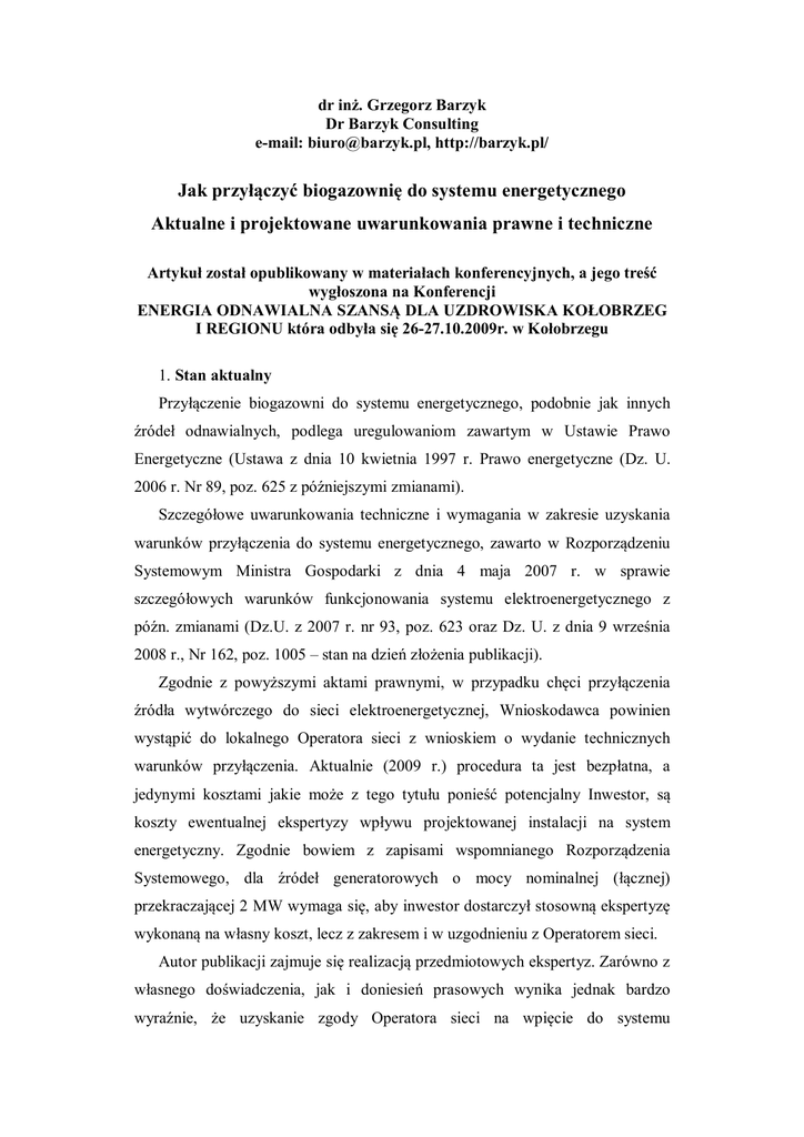 dr inż. Grzegorz Barzyk Dr Barzyk Consulting e-mail: [email protected], http://barzyk.pl/ Jak przyłączyć biogazownię do systemu energetycznego Aktualne i projektowane uwarunkowania prawne i techniczne Artykuł został opublikowany w materiałach konferencyjnych, a jego treść wygłoszona na Konferencji ENERGIA ODNAWIALNA SZANSĄ DLA UZDROWISKA KOŁOBRZEG I REGIONU która odbyła się 26-27.10.2009r. w Kołobrzegu 1. Stan aktualny Przyłączenie biogazowni do systemu energetycznego, podobnie jak innych źródeł odnawialnych, podlega uregulowaniom zawartym w Ustawie Prawo Energetyczne (Ustawa z dnia 10 kwietnia 1997 r. Prawo energetyczne (Dz. U. 2006 r. Nr 89, poz. 625 z późniejszymi zmianami). Szczegółowe uwarunkowania techniczne i wymagania w zakresie uzyskania warunków przyłączenia do systemu energetycznego, zawarto w Rozporządzeniu Systemowym Ministra Gospodarki z dnia 4 maja 2007 r. w sprawie szczegółowych warunków funkcjonowania systemu elektroenergetycznego z późn. zmianami (Dz.U. z 2007 r. nr 93, poz. 623 oraz Dz. U. z dnia 9 września 2008 r., Nr 162, poz. 1005 – stan na dzień złożenia publikacji). Zgodnie z powyższymi aktami prawnymi, w przypadku chęci przyłączenia źródła wytwórczego do sieci elektroenergetycznej, Wnioskodawca powinien wystąpić do lokalnego Operatora sieci z wnioskiem o wydanie technicznych warunków przyłączenia. Aktualnie (2009 r.) procedura ta jest bezpłatna, a jedynymi kosztami jakie może z tego tytułu ponieść potencjalny Inwestor, są koszty ewentualnej ekspertyzy wpływu projektowanej instalacji na system energetyczny. Zgodnie bowiem z zapisami wspomnianego Rozporządzenia Systemowego, dla źródeł generatorowych o mocy nominalnej (łącznej) przekraczającej 2 MW wymaga się, aby inwestor dostarczył stosowną ekspertyzę wykonaną na własny koszt, lecz z zakresem i w uzgodnieniu z Operatorem sieci. Autor publikacji zajmuje się realizacją przedmiotowych ekspertyz. Zarówno z własnego doświadczenia, jak i doniesień prasowych wynika jednak bardzo wyraźnie, że uzyskanie zgody Operatora sieci na wpięcie do systemu energetycznego jest obecnie niezwykle trudne nawet przy pozytywnym wyniku ekspertyzy. Spowodowane jest głównie lawinowo przyrastającym zainteresowaniem zarówno inwestorów, jak i zwykłych „handlarzy”, którzy poprzez rezerwację (i późniejsze zbycie) miejsca w sieci, upatrują sporych korzyści finansowych. Dość przekazać, że wg stanu na dzień 1 października 2009 roku, Operatorzy krajowych systemów dystrybucyjnych oraz przesyłowego, wydali warunki techniczne przyłączenia dla źródeł generatorowych OZE na łączną moc ponad 11000 MW. W tej liczbie znajduje się ok. 2800 MW mocy zainstalowanej źrodeł OZE, planowanych do przyłączenia do sieci średniego napięcia. Jak wynika ze szczegółowych zestawień, aż 99% tych zamierzeń związana jest z realizacją projektów energetyki wiatrowej, które jednak poprzez współdzielenie dostępu do systemu energetycznego istotnie wpływają na możliwość przyłączenia także biogazowni. Według przeprowadzonych analiz, w tym przede wszystkim „Studium wpływu rozwoju energetyki wiatrowej na pracę i rozwój Krajowego Systemu Elektroenergetycznego” opracowanym przez PSE S.A. już w 2003 r., realizacja zgłoszonych planów inwestorskich wymaga istotnych zmian i modernizacji systemu energetycznego. W tabeli 1 przedstawiono wycinek zakresu modernizacji sieci energetycznych Polski północnej, jaki określono w wyżej wymienionym opracowaniu PSE. Nr etapu 1. Wyszczególnienie inwestycji     2.  3.   4.  Modernizacja osprzętu na linii 110 kV Kąty Rybackie – Nowy Dwór Budowa linii 110 kV Resko – Łobez i od stacji Żarnowiec do miejsca wprowadzenie 138 MW z generacji wiatrowej pomiędzy Opalinem, a Wickiem Zmiana przekroju przewodów ze 120 mm2 na 240 mm2 na 9 ciągach linii 110 kV na terenie Enei O/Szczecin i Gorzów oraz Energi O/Koszalin i Słupsk Budowa stacji 220 kV Recław (zmiana napięcia pracy istniejącej linii Morzyczyn – Recław na 220 kV i dodanie transformatora o mocy 250 MW w stacji Recław) Zwiększenie przepustowości połączenia 220 kV Krajnik – Vierraden o 81% Dostawienie nowego transformatora 400/110 kV o mocy 330 MVA w stacji Dunowo Dostawienie nowego transformatora 400/110 kV o mocy 330 MVA w stacji Słupsk Dostawienie nowego transformatora 400/220 kV o mocy 250 MVA w stacji Krajnik Moc źródeł [MW] 3224 3654 3927 4094 5.  6. 5902 Zmiana napięcia połączenia Krajnik – Vierraden z 220 na 400 kV 2  2 Zmiana przekroju przewodów ze 120 mm na 240 mm na 5 ciągach linii 110 kV na terenie Energi O/ Kalisz, PGE ZEB oraz Enei O/Poznań  Budowa linii 400 kV Dunowo-Żydowo-Piła Krzewina-Plewiska (zastępującej ciąg 220 kV), budowa nowych stacji Żydowo i Piła Krzewina 6805 z transformatorami 330 MVA-400/110 kV 7  Wymiana przekładników prądowych na ciągach 400 kV Krajnik – Dunowo 7731 – Żarnowiec, Gdańsk Błonie – Grudziądz, i Gdańsk Błonie–Olsztyn Mątki 8.  Budowa drugiego ciągu linii 400 kV Krajnik Dunowo – Słupsk – Żarnowiec oraz linii 400 kV Piła Kzewina – Bydgoszcz  Zwiększeniem obciążalności linii 400 kV Piła Krzewina – Plewiska do 1200 9482 MVA Tab. 1 Wyszczególnienie etapów inwestycji w system energetyczny odniesione do wartości mocy zainstalowanej w krajowych źródłach wiatrowych Szczegółowy zakres inwestycji i modernizacji systemu energetycznego wymagany ze względu na realizację konkretnego przedsięwzięcia zawsze określany jest we wcześniej wspomnianej ekspertyzie, dla każdego z zamierzeń z osobna. Faktyczny zatem zakres modernizacji sieci dla danego projektu może dotyczyć zupełnie innych zaleceń i obostrzeń. Abstrahując jednak od wybranych projektów można jednoznacznie stwierdzić, że wydane już warunki przyłączenia dla źródeł OZE w sposób diametralny ograniczają zdolności przyłączeniowe istniejącego systemu energetyczneg