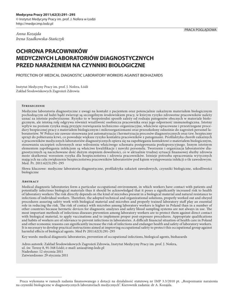 Medycyna Pracy 2011;62(3):291–295 © Instytut Medycyny Pracy im. prof. J. Nofera w Łodzi http://medpr.imp.lodz.pl Anna Kozajda Irena Szadkowska-Stańczyk PRACA POGLĄDOWA OCHRONA PRACOWNIKÓW MEDYCZNYCH LABORATORIÓW DIAGNOSTYCZNYCH PRZED NARAŻENIEM NA CZYNNIKI BIOLOGICZNE PROTECTION OF MEDICAL DIAGNOSTIC LABORATORY WORKERS AGAINST BIOHAZARDS Instytut Medycyny Pracy im. prof. J. Nofera, Łódź Zakład Środowiskowych Zagrożeń Zdrowia Streszczenie Medyczne laboratoria diagnostyczne z uwagi na kontakt z pacjentem oraz potencjalnie zakaźnym materiałem biologicznym pochodzącym od ludzi bądź zwierząt są szczególnym środowiskiem pracy, w którym ryzyko zdrowotne pracowników należy uznać za istotnie podwyższone. Ryzyko to w bezpośredni sposób zależy od rodzaju patogenów obecnych w materiale biologicznym, ale istotną rolę odgrywa również wrażliwość osobnicza pracownika oraz jego odporność immunologiczna. Istotny wpływ na poziom ryzyka mają przyjęte rozwiązania techniczno-organizacyjne, właściwie opracowane i przestrzegane procedury bezpiecznej pracy z materiałem biologicznym i mikroorganizmami oraz przeszkolony odnośnie do zagrożeń personel laboratoriów. W Polsce nie zawsze stosowana jest automatyzacja i hermetyzacja procesów diagnostycznych oraz tzw. bezpieczny sprzęt do pobierania krwi, co powoduje większe ryzyko kontaktu pracowników z patogenami. Profilaktyka chorób zakaźnych u pracowników medycznych laboratoriów diagnostycznych opiera się na zapobieganiu kontaktowi z materiałem biologicznym, stosowaniu szczepień ochronnych oraz wdrożeniu właściwego schematu postępowania poekspozycyjnego. Innym istotnym elementem zapobiegania infekcjom są właściwe kwalifikacje i nawyki personelu. Tworzenie i organizacja laboratoriów diagnostycznych są nacechowane dość dużym stopniem dowolności, co w aktualnie trudnej sytuacji finansowej służby zdrowia może skutkować wzrostem ryzyka dla bezpieczeństwa i zdrowia pracowników. Istnieje potrzeba opracowania wytycznych mających na celu zwiększenie bezpieczeństwa pracowników laboratoriów pod kątem występowania infekcji o tle zawodowym. Med. Pr. 2011:62(3):291–295 Słowa kluczowe: medyczne laboratoria diagnostyczne, profilaktyka zakażeń zawodowych, czynniki biologiczne, szkodliwości biologiczne Abstract Medical diagnostic laboratories form a particular occupational environment, in which workers have contact with patients and potentially infectious biological materials thus it should be acknowledged that it poses a significantly increased risk to health of laboratory workers The risk directly depends on the kind of microbes present in a biological material and natural resistance to infections of individual workers. Therefore, the adopted technical and organizational solutions, properly worked out and obeyed procedures assuring safety work with biological material and microbes and properly trained laboratory staff play an essential role in reducing the risk. The risk of contact with microbes among laboratory workers is higher in Poland than in a number of other countries because hermetic devices for diagnostic analyzes and safety blood sampling systems are not always in use. The most important methods of infectious diseases prevention among laboratory workers are to protect them against direct contact with biological material, to apply vaccinations and to implement proper post-exposure procedures. Appropriate qualifications and habits of workers are of relevance to prevent infections in laboratories. A difficult financial situation of health care in Poland and other economic reasons can significantly increase the risk of infections and endanger health and safety of laboratory workers. It is necessary to develop practical instructions aimed at improving occupational safety to protect this occupational group against harmful effects of biological agents. Med Pr 2011:62(3):291–295 Key words: medical diagnostic laboratories, prevention of occupational infections, biological agents, biohazards Adres autorek: Zakład Środowiskowych Zagrożeń Zdrowia, Instytut Medycyny Pracy im. prof. J. Nofera, ul. św. Teresy 8, 91-348 Łódź; e-mail: [email protected] Nadesłano: 12 stycznia 2011 Zatwierdzono: 29 stycznia 2011 Praca wykonana w ramach zadania finansowanego z dotacji na działalność statutową nr IMP 3.3/2010 pt. „Rozpoznanie narażenia na czynniki biologiczne w diagnostycznych laboratoriach medycznych”. Kierownik zadania: dr A. Kozajda. 292 A. Kozajda, I. Szadkowska-Stańczyk Medyczne laboratoria diagnostyczne z uwagi na kontakt z pacjentem oraz potencjalnie zakaźnym materiałem biologicznym pochodzącym od ludzi bądź zwierząt są szczególnym środowiskiem pracy, w którym ryzyko zdrowotne pracowników należy uznać za istotnie podwyższone. Ryzyko to w bezpośredni sposób zależy od rodzaju patogenów obecnych w materiale biologicznym, ale istotną rolę odgrywa również wrażliwość osobnicza pracownika oraz jego odporność immunologiczna (1). Patogeny obecne w środowisku laboratorium mogą wniknąć do organizmu pracownika drogą: nkrwiopochodną — po przerwaniu ciągłości tkanek wskutek zakłucia igłą bądź skaleczenia czy zadrapania innym zanieczyszczonym ostrym narzędziem, noddechową — wskutek inhalacji bioaerozolu, nbezpośrednią — poprzez kontakt skóry (np. rąk), błon śluzowych bądź spojówek ze skażonym materiałem, npokarmową — np. wskutek ustnego pipetowania czy spożywania posiłków na stanowiskach pracy. Istotny wpływ na poziom ryzyka mają przyjęte rozwiązania techniczno-organizacyjne, właściwie opracowane i przestrzegane procedury i przeszkolony w zakresie zagrożeń personel laboratoriów. W ostatnich latach w literaturze światowej i europejskiej obserwuje się wzmożone zainteresowanie problematyką infekcji wywołanych kontaktem z materiałem zakaźnym wśród pracowników medycznych laboratoriów diagnostycznych. Opraco