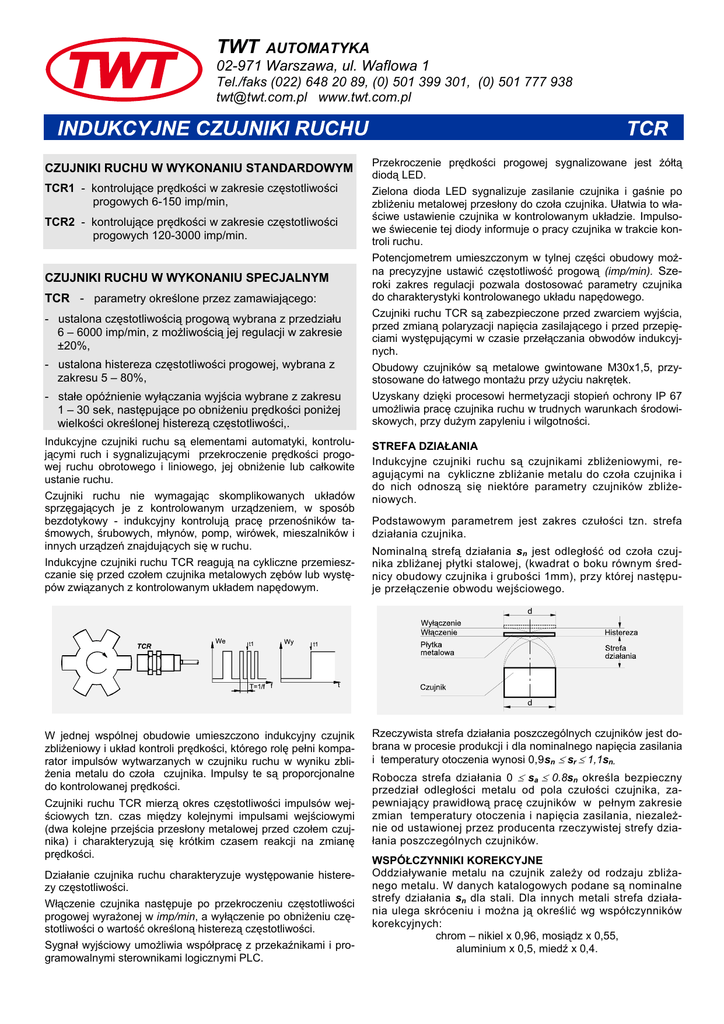 TWT AUTOMATYKA 02-971 Warszawa, ul. Waflowa 1 Tel./faks (022) 648 20 89, (0) 501 399 301, (0) 501 777 938 [email protected] www.twt.com.pl CZUJNIKI RUCHU W WYKONANIU STANDARDOWYM TCR1 - kontrolujące prędkości w zakresie częstotliwości progowych 6-150 imp/min, TCR2 - kontrolujące prędkości w zakresie częstotliwości progowych 120-3000 imp/min. CZUJNIKI RUCHU W WYKONANIU SPECJALNYM TCR - parametry określone przez zamawiającego: - ustalona częstotliwością progową wybrana z przedziału 6 – 6000 imp/min, z możliwością jej regulacji w zakresie ±20%, - ustalona histereza częstotliwości progowej, wybrana z zakresu 5 – 80%, - stałe opóźnienie wyłączania wyjścia wybrane z zakresu 1 – 30 sek, następujące po obniżeniu prędkości poniżej wielkości określonej histerezą częstotliwości,. Indukcyjne czujniki ruchu są elementami automatyki, kontrolującymi ruch i sygnalizującymi przekroczenie prędkości progowej ruchu obrotowego i liniowego, jej obniżenie lub całkowite ustanie ruchu. Czujniki ruchu nie wymagając skomplikowanych układów sprzęgających je z kontrolowanym urządzeniem, w sposób bezdotykowy - indukcyjny kontrolują pracę przenośników taśmowych, śrubowych, młynów, pomp, wirówek, mieszalników i innych urządzeń znajdujących się w ruchu. Indukcyjne czujniki ruchu TCR reagują na cykliczne przemieszczanie się przed czołem czujnika metalowych zębów lub występów związanych z kontrolowanym układem napędowym. W jednej wspólnej obudowie umieszczono indukcyjny czujnik zbliżeniowy i układ kontroli prędkości, którego rolę pełni komparator impulsów wytwarzanych w czujniku ruchu w wyniku zbliżenia metalu do czoła czujnika. Impulsy te są proporcjonalne do kontrolowanej prędkości. Czujniki ruchu TCR mierzą okres częstotliwości impulsów wejściowych tzn. czas między kolejnymi impulsami wejściowymi (dwa kolejne przejścia przesłony metalowej przed czołem czujnika) i charakteryzują się krótkim czasem reakcji na zmianę prędkości. Działanie czujnika ruchu charakteryzuje występowanie histerezy częstotliwości. Włączenie czujnika następuje po przekroczeniu częstotliwości progowej wyrażonej w imp/min, a wyłączenie po obniżeniu częstotliwości o wartość określoną histerezą częstotliwości. Sygnał wyjściowy umożliwia współpracę z przekaźnikami i programowalnymi sterownikami logicznymi PLC. Przekroczenie prędkości progowej sygnalizowane jest żółtą diodą LED. Zielona dioda LED sygnalizuje zasilanie czujnika i gaśnie po zbliżeniu metalowej przesłony do czoła czujnika. Ułatwia to właściwe ustawienie czujnika w kontrolowanym układzie. Impulsowe świecenie tej diody informuje o pracy czujnika w trakcie kontroli ruchu. Potencjometrem umieszczonym w tylnej części obudowy można precyzyjne ustawić częstotliwość progową (imp/min). Szeroki zakres regulacji pozwala dostosować parametry czujnika do charakterystyki kontrolowanego układu napędowego. Czujniki ruchu TCR są zabezpieczone przed zwarciem wyjścia, przed zmianą polaryzacji napięcia zasilającego i przed przepięciami występującymi w czasie przełączania obwodów indukcyjnych. Obudowy czujników są metalowe gwintowane M30x1,5, przystosowane do łatwego montażu przy użyciu nakrętek. Uzyskany dzięki procesowi hermetyzacji stopień ochrony IP 67 umożliwia pracę czujnika ruchu w trudnych warunkach środowiskowych, przy dużym zapyleniu i wilgotności. STREFA DZIAŁANIA Indukcyjne czujniki ruchu są czujnikami zbliżeniowymi, reagującymi na cykliczne zbliżanie metalu do czoła czujnika i do nich odnoszą się niektóre parametry czujników zbliżeniowych. Podstawowym parametrem jest zakres czułości tzn. strefa działania czujnika. Nominalną strefą działania sn jest odległość od czoła czujnika zbliżanej płytki stalowej, (kwadrat o boku równym średnicy obudowy czujnika i grubości 1mm), przy której następuje przełączenie obwodu wejściowego. Rzeczywista strefa działania poszczególnych czujników jest dobrana w procesie produkcji i dla nominalnego napięcia zasilania i temperatury otoczenia wynosi 0,9sn ≤ sr ≤ 1,1sn. Robocza strefa działania 0 ≤ sa ≤ 0.8sn określa bezpieczny przedział odległości metalu od pola czułości czujnika, zapewniający prawidłową pracę czujników w pełnym zakresie zmian temperatury otoczenia i napięcia zasilania, niezależnie od ustawionej przez producenta rzeczywistej strefy działania poszczególnych czujników. WSPÓŁCZYNNIKI KOREKCYJNE Oddziaływanie metalu na czujnik zależy od rodzaju zbliżanego metalu. W danych katalogowych podane są nominalne strefy działania sn dla stali. Dla innych metali strefa działania ulega skróceniu i można ją określić wg współczynników korekcyjnych: chrom – nikiel x 0,96, mosiądz x 0,55, aluminium x 0,5, miedź x 0,4. CZĘSTOTLIWOŚCI PROGOWE WYJŚCIE Włączenie czujnika następuje po przekroczeniu częstotliwości progowej włączania fp, wyłączenie po obniżeniu częstotliwość poniżej progu wyłączania fw. TCR posiada dwustanowe wyjście tranzystorowe typu PNP, które po przekroczeniu prędkości progowej dołącza potencjał dodatni do wyjścia lub typu NPN dołączającym potencjał ujemny do wyjścia z funkcją NO lub NC. Wyjście jest zabezpieczone przed przeciążeniem i zwarciem’, przed zmianą polaryzacji napięcia zasilającego i przed przepięciami występującymi w czasie przełączania obwodów indukcyjnych. Indukcyjne czujniki ruchu TCR1 kontrolują prędkości w dolnym przedziale częstotliwości progowych 6-150imp/min, a czujniki TCR2 w górnym przedziale 120-3000imp/min. Wewnętrzny potencjometr umożliwia ustawienie dowolnego progu prędkości w podanych wyżej zakresach. W wykonaniach specjalnych czujniki ruchu TCR mają ustaloną częstotliwość progową określoną przez zamawiającego, wybraną z zakresu 6 - 6000imp/min. Wewnętrznym potencjometrem można precyzyjnie ustawia