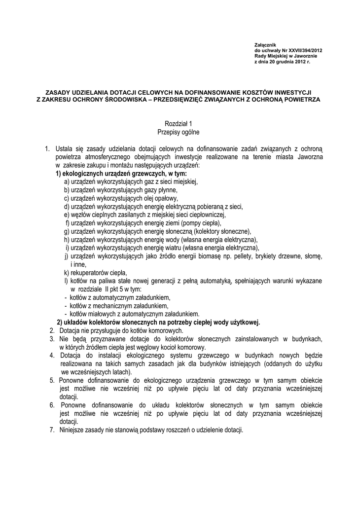 Załącznik do uchwały Nr XXVII/394/2012 Rady Miejskiej w Jaworznie z dnia 20 grudnia 2012 r. ZASADY UDZIELANIA DOTACJI CELOWYCH NA DOFINANSOWANIE KOSZTÓW INWESTYCJI Z ZAKRESU OCHRONY ŚRODOWISKA – PRZEDSIĘWZIĘĆ ZWIĄZANYCH Z OCHRONĄ POWIETRZA Rozdział 1 Przepisy ogólne 1. Ustala się zasady udzielania dotacji celowych na dofinansowanie zadań związanych z ochroną powietrza atmosferycznego obejmujących inwestycje realizowane na terenie miasta Jaworzna w zakresie zakupu i montażu następujących urządzeń: 1) ekologicznych urządzeń grzewczych, w tym: a) urządzeń wykorzystujących gaz z sieci miejskiej, b) urządzeń wykorzystujących gazy płynne, c) urządzeń wykorzystujących olej opałowy, d) urządzeń wykorzystujących energię elektryczną pobieraną z sieci, e) węzłów cieplnych zasilanych z miejskiej sieci ciepłowniczej, f) urządzeń wykorzystujących energię ziemi (pompy ciepła), g) urządzeń wykorzystujących energię słoneczną (kolektory słoneczne), h) urządzeń wykorzystujących energię wody (własna energia elektryczna), i) urządzeń wykorzystujących energię wiatru (własna energia elektryczna), j) urządzeń wykorzystujących jako źródło energii biomasę np. pellety, brykiety drzewne, słomę, i inne, k) rekuperatorów ciepła, l) kotłów na paliwa stałe nowej generacji z pełną automatyką, spełniających warunki wykazane w rozdziale II pkt 5 w tym: - kotłów z automatycznym załadunkiem, - kotłów z mechanicznym załadunkiem, - kotłów miałowych z automatycznym załadunkiem. 2) układów kolektorów słonecznych na potrzeby ciepłej wody użytkowej. 2. Dotacja nie przysługuje do kotłów komorowych. 3. Nie będą przyznawane dotacje do kolektorów słonecznych zainstalowanych w budynkach, w których źródłem ciepła jest węglowy kocioł komorowy. 4. Dotacja do instalacji ekologicznego systemu grzewczego w budynkach nowych będzie realizowana na takich samych zasadach jak dla budynków istniejących (oddanych do użytku we wcześniejszych latach). 5. Ponowne dofinansowanie do ekologicznego urządzenia grzewczego w tym samym obiekcie jest możliwe nie wcześniej niż po upływie pięciu lat od daty przyznania wcześniejszej dotacji. 6. Ponowne dofinansowanie do układu kolektorów słonecznych w tym samym obiekcie jest możliwe nie wcześniej niż po upływie pięciu lat od daty przyznania wcześniejszej dotacji. 7. Niniejsze zasady nie stanowią podstawy roszczeń o udzielenie dotacji. Rozdział 2 Kryteria wyboru inwestycji do dofinansowania Dotacje dotyczą budynków mieszkalnych oraz lokali mieszkalnych w budynkach wielorodzinnych przy spełnieniu następujących warunków: 1) posiadania tytułu prawnego do nieruchomości, na której zamierza się zainstalować ekologiczne urządzenie grzewcze, układ kolektorów słonecznych lub zgody właściciela nieruchomości na wykonanie inwestycji, 2) likwidacji tradycyjnego węglowego kotła rusztowego w istniejącym budynku mieszkalnym (wnioskodawca zlikwiduje dotychczasowe urządzenie grzewcze, co najmniej przez jego trwałe odcięcie od sieci centralnego ogrzewania), 3) braku dodatkowego stałego rusztu dla kotłów węglowych centralnego ogrzewania, na którym w tradycyjny sposób można spalać paliwa gorszej jakości, w tym również odpady, za wyjątkiem urządzeń grzewczych na paliwo stałe wyposażonych w ruszt awaryjny, wykorzystywany wyłącznie w przypadkach awaryjnych związanych z przerwą dostaw energii elektrycznej, 4) wymienione w rozdziale I ust. 1 pkt 1 urządzenie grzewcze musi być głównym źródłem ciepła, nie dopuszcza się sytuacji, kiedy układ grzewczy stanowią dwa równoważne źródła ciepła, włączone w instalację c.o. jak np. kocioł węglowy wraz z gazowym, kocioł węglowy wraz z olejowym, wymiennik ciepła i kocioł, dopuszcza się stosowanie źródeł pomocniczych np. dogrzewanie za pomocą kominka, energii elektrycznej, 5) urządzenia zasilane paliwami stałymi (w tym importowane z zagranicy) muszą posiadać aktualne świadectwo badania na „znak bezpieczeństwa ekologicznego” lub równoważne świadectwo przyznawane przez uprawnione do tego instytuty, laboratoria (np. Instytut Chemicznej Przeróbki Węgla w Zabrzu lub inne), atest energetyczno-emisyjny kotła nie jest takim świadectwem. Rozdział 3 Wysokość przyznanej dotacji 1. Do ekologicznych urządzeń grzewczych można uzyskać dotację w wysokości 23 % poniesionych kosztów zakupu wraz z ich montażem. Maksymalna kwota przyznanej dotacji nie może przekroczyć 3 000,00 zł brutto. 2. Do układu kolektorów słonecznych na potrzeby ciepłej wody użytkowej można uzyskać dotację w wysokości 23 % poniesionych kosztów zakupu wraz z ich montażem. Maksymalna kwota przyznanej dotacji nie może przekroczyć 3 000,00 zł brutto. Rozdział 4 Tryb postępowania w sprawie udzielenia dotacji 1. Warunkiem ubiegania się o udzielenie dotacji celowej jest: a) złożenie wniosku o udzielenie dotacji przed przystąpieniem do realizacji planowanej inwestycji , b) zawarcie z Gminą Jaworzno umowy o udzielenie dotacji. 2. Wnioski o dotację przyjmowane będą do 15 października danego roku kalendarzowego lub do wyczerpania środków przeznaczonych w budżecie miasta w danym roku na ten cel. Informacja o zakończeniu przyjmowania wniosków zostanie podana do publicznej wiadomości na internetowej stronie miejskiej oraz w prasie lokalnej. 3. Wniosek o udzielenie dotacji podlega ocenie pod względem formalnym i merytorycznym w terminie 30 dni od dnia jego złożenia. 4. O rozpatrzeniu wniosku i ewentualnym terminie podpisania umowy wnioskodawca zostanie poinformowany telefonicznie lub drogą elektroniczną. 5. Wniosek nie spełniający wymogów formalnych lub/i merytorycznych podlega odrzuceniu, o którym to fakcie wnioskodawca zostanie poinformowany pisemnie. Decyzja w sprawie przyznania lub odmowy przyznania dotacji jest ostateczna. 6. Udzielenie dotacji następuje na podstawie umowy o u