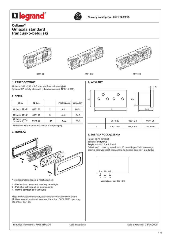 Numery katalogowe : 0671 22/23/25 Celiane TM Gniazda standard francusko-belgijski 0671 22 0671 23 0671 25 4. WYMIARY 1. ZASTOSOWANIE Gniazda 16A - 250 V AC standard francusko-belgijski (gniazda 2P należy stosować tylko do renowacji: NFC 15 100). 2. SERIA Podłączenie Waga (g) Opis Nr kat. Gniazdo 2P+Z 0671 22 2 Auto Gniazdo 2P+ Z 0671 23 3 Auto 94,6 Gniazdo 2P+ Z z blokadą 0671 25 4* Auto 96,6 60,5 *Gniazdo 4 krotne do montażu w puszce potrójnej. A 3. MONTAŻ 0671 22 0671 23 0671 25 116,1 mm 187,1 mm 180,6 mm 5. ZASADA PODŁĄCZENIA Nr kat. 0671 22/23/25 Zaciski sprężynowe Przyłączalność: 2 x 2,5 mm2 Odizolować prz ewody na odcinku 13 mm (długość odizolowanego odcinka prz ewodu jest zaznaczona na ścianie bocznej 1 produktu). * 1 2 3 L * Nie dostarczane razem z mechanizmem N Widok ztyłu nr kat. 0671 22 1 - Mechanizm zatrzasnąć w uchwycie od tyłu. 2 - Plakietkę zatrzasnąć na mechanizmie 4 - Ramkę zatrzasnąć w uchwycie Mogą być wyposażone we wszystkie elementy wykończeniowe Celiane. Możliwy montaż poziomy i pionowy dla nr kat. 0671 22/23 i poziomy dla nr kat. 0671 25. Instrukcja techniczna:: F00531PL/00 Data aktualizacji: Data ut worz enia: 22/04/2008 1 /2 Numery katalogowe : 0671 22/23/25 Celiane TM Gniazda standard francusko-belgijski 6. DZIAŁANIE Nr kat. 0671 22/23/25 Podłączeń dokonuje się poprzez włożenie/wyjęcie znormalizowanej wtyczki. 7. CHARAKTERYSTYKA OGÓLNA 7.1 Dane mechaniczne IP20 IK04 7.2 Charakterystyka materiału Nr kat. 0671 22/23/25 Mechanizm: polipropylen, szary Podstawa: poliwęglan, szary Odporność na wysoką temperaturę i żar: 850° C / 30 s 7.3 Parametry elektryczne Napięcie znamionowe: 250 V AC Prąd znamionowy: 16 A 7.4 Warunki środowiskowe - 5° C do + 35° C 8. CERTYFIKATY I DEKLARACJE Aktualne: Nr kat. 0671 22/23/25 NF - BBJ Instrukcja techniczna : F00531PL/00 Data aktualizacji: Data ut worz enia: 22/04/2008 2 /2