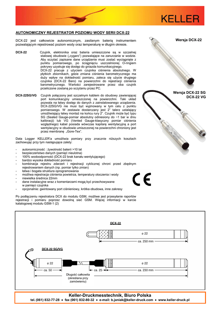 AUTONOMICZNY REJESTRATOR POZIOMU WODY SERII DCX-22 DCX-22 jest całkowicie autonomicznym, zasilanym baterią instrumentem pozwalającym rejestrować poziom wody oraz temperaturę w długim okresie. DCX-22 Czujnik, elektronika oraz bateria umieszczone są w szczelnej stalowej obudowie („cygaro”) pozwalające na zanurzanie w wodzie. Aby sczytać zapisane dane urządzenie musi zostać wyciągnięte z punktu pomiarowego, po ściągnięciu uszczelnionej O-ringiem pokrywy uzyskuje się dostęp do gniazda komunikacyjnego. DCX-22 pracuje z użyciem czujnika ciśnienia absolutnego. W płytkich zbiornikach, gdzie zmiana ciśnienia barometrycznego ma duży wpływ na dokładność pomiaru, zaleca się użycie drugiego czujnika (DCX-22 Baro) na powierzchni do rejestracji ciśnienia barometrycznego. Wartości zarejestrowane przez oba czujnik przeliczone zostaną po sczytaniu przez PC. DCX-22SG/VG Czujnik połączony jest szczelnym kablem do obudowy zawierającej port komunikacyjny umieszczonej na powierzchni. Taki układ pozwala na łatwy dostęp do danych z zainstalowanego urządzenia. DCX-22SG/VG nie musi być wyjmowany w tym celu z punktu pomiarowego. W zestawie dostarczany jest 2” talerz ustalający umożliwiający łatwy montaż na końcu rury 2”. Czujnik może być typu SG (Sealed Gauge-pomiar absolutny odniesiony do ~1 bar w dniu kalibracji) lub VG (Vented Gauge-klasyczny pomiar ciśnienia względnego) kabel posiada wówczas kapilarę wentylacyjną a port wentylacyjny w obudowie umiszczonej na powierzchni chroniony jest przez membranę „Gore-Tex”. Wersja DCX-22 Wersja DCX-22 SG DCX-22 VG Data Logger KELLER’a umożliwia pomiary przy znacznie niższych kosztach zachowując przy tym następujące zalety: - autonomiczność : żywotność baterii >10 lat bezpieczeństwo danych (pamięć nieulotna) 100% wodoodporność (DCX-22 brak kanału wentylującego) bardzo wysoka dokładność pomiaru kombinacja rejestru zdarzeń i rejestracji cyklicznej chroni przed zbędnym rejestrowaniem danych (np. pomiar tylko zmian) łatwa i bogata struktura oprogramowania możliwa rejestracja ciśnienia powietrza, temperatury otoczenia i wody niewielka średnica 22mm dane instalacyjne wraz z komentarzami mogą być przechowywane w pamięci czujnika opcjonalnie: gwintowany port ciśnieniowy, krótka obudowa, inne zakresy Po podłączeniu rejestratora DCX do modułu GSM, możliwe jest przesyłanie raportów rejestracji i pomiaru poprzez dowolną sieć GSM. Więcej informacji w karcie katalogowej modułu GSM-1 (2) Długość całkowita (określana przy zamówieniu) Keller-Druckmesstechnik, Biuro Polska tel. (061) 832-77-28 • fax (061) 832-80-32 • e-mail: [email protected] • www.keller-druck.pl Dane Techniczne: DCX-22 Baro Zakresy pomiarowe (inne na życzenie) PAA 0,8...1,3 bar abs. DCX-22 DCX-22 SG DCX-22 VG PAA PAA PR 10m 20m 50m 100m 0,8…2 0,8…3 0,8…6 0,8…11 bar abs. 0,8…2 0,8…3 0,8…6 0,8…11 bar abs. 1 2 5 10 bar PR - względne (zero przy ciśn. atm.) ; PAA - absolutne (zero przy 0 bar); PA - względne (zero przy ∼1 bar abs w dniu kalibracji) Zasilanie: Żywotność baterii: Wyjście: Przyłącze elektr.: Liniowość: Pole błędu (-10..40°C)*: Kompensacja Rozdzielczość: Stabilność długoterminowa: Przeciążenie: bateria litowa 3,6 V ok. 10 lat @ 1 pomiar/ h cyfrowe RS485 Fischer DEE103A054 typ. 0,02%FS typ. 0,05%, max 0,1%FS -20…50°C max 0,0025%FS typ. 0,5 mbar 2x zakres Dokładność pomiaru temp. Najkrótszy cykl pomiarowy: Pamięć: Opcjonalnie Materiał : Waga: typ. 0,5°C 1s 57000 wartości @ interwał <15s lub 28000@ interwał > 15s (zawsze z odpowiadającym czasem) pamięć 2 razy większa (ponad 114.000 wartości) stal 316L (DIN 1.4435)/O-ring Viton 355 g bez kabla * nieliniowość+ wpływy temperatury, Opcjonalnie 0,05% FS max. Wskazówki instalacyjne Czujnik poziomu połączony kablem z obudową elektroniki zanurzony jest w rurze. Obudowa zawiera elektronikę, baterię i czujnik ciśnienia otoczenia. Obudowa elektroniki zamontowana jest na końcu rury. Pokrywa ochronna powinna być oczyszczona z ziemi i wody przed jej ściągnięciem. Laptop lub palmtop podłączony może być w terenie poprzez kabel komunikacyjny (np. K103A lub K104A). Wszystkie zarejestrowane dane mogą być wówczas sczytane, bądź urządzenie może być przekonfigurowane. System jest ustawiony do przesyłania bezprzewodowego danych poprzez modem. Metalowa osłona zapewnia ochronę przed wpływami atmosferycznymi oraz wandalami. Oprogramowanie LOGGER DCX umożliwia również współpracę z palmtopem (PDA) Sprzęt / Oprogramowanie (bezpłatne) Oprogramowanie konfiguracyjne i odczytujące jest dostarczane wraz z kablem K103A.Oprogramowanie jest kompatybilne z Win2000/NT/XP/ME i 9X. Część WRITER umożliwia start i konfigurację: - wyswietlanie kanałów pomiarowych - wskazanie statusu i stanu baterii - edycja danych początkowych - bufor pierścieniowy lub normalny - ustawianie zera Parametry rejestracji: - do wyboru kanały ciśnienia lub temperatury Metody startu rejestracji: - czasowy - w przypadku przekroczenia ustalonej wartości - z zaprogramowanym interwałem Metody rejestracji: - Interwał (1s..18h) i rejestracja zdarzeń - rejestracja przy zmianach ciśnienia - włacznie/wyłaczanie w progach ciśnienia - uśrednianie wybranej liczby pomiarów Część READER umożliwia odczyt i zapisanie danych w pamięci PC. Zbiór danych, który może być zaimportowany przez programy np. EXCEL zawiera następujące informacje: numer seryjny, zakres pomiarowy, typ sensora, dane wstępne, dane odczytu, jednostki, wartości pomiarowe z datą i godziną. Funkcje ogólne: - wskazanie statusu i stanu baterii - odczyt zbioru rekordów i indywidualnych danych Keller-Druckmesstechnik, Biuro Polska tel. (061) 832-77-28 • fax (061) 832-80-32 • e-mail: [email protected] • www.keller-druck.pl
