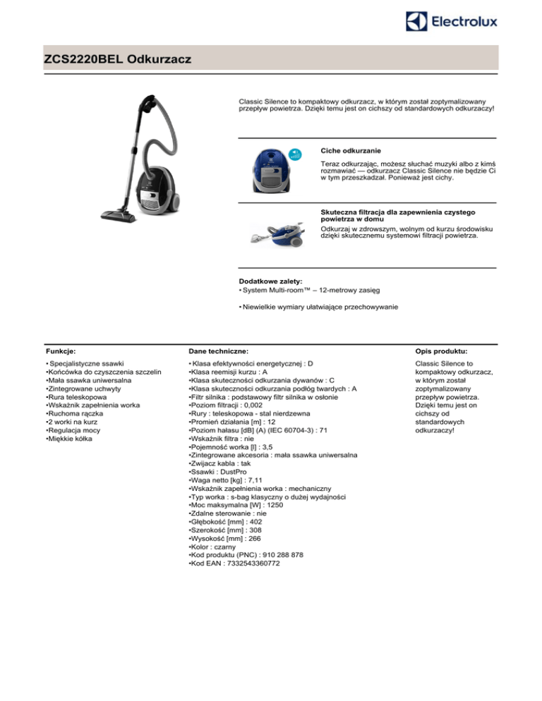 ZCS2220BEL Odkurzacz Classic Silence to kompaktowy odkurzacz, w którym został zoptymalizowany przepływ powietrza. Dzięki temu jest on cichszy od standardowych odkurzaczy! Ciche odkurzanie Teraz odkurzając, możesz słuchać muzyki albo z kimś rozmawiać — odkurzacz Classic Silence nie będzie Ci w tym przeszkadzał. Ponieważ jest cichy. Skuteczna filtracja dla zapewnienia czystego powietrza w domu Odkurzaj w zdrowszym, wolnym od kurzu środowisku dzięki skutecznemu systemowi filtracji powietrza. Dodatkowe zalety: • System Multi-room™ – 12-metrowy zasięg • Niewielkie wymiary ułatwiające przechowywanie Funkcje: Dane techniczne: Opis produktu: • Specjalistyczne ssawki •Końcówka do czyszczenia szczelin •Mała ssawka uniwersalna •Zintegrowane uchwyty •Rura teleskopowa •Wskażnik zapełnienia worka •Ruchoma rączka •2 worki na kurz •Regulacja mocy •Miękkie kółka • Klasa efektywności energetycznej : D •Klasa reemisji kurzu : A •Klasa skuteczności odkurzania dywanów : C •Klasa skuteczności odkurzania podłóg twardych : A •Filtr silnika : podstawowy filtr silnika w osłonie •Poziom filtracji : 0,002 •Rury : teleskopowa - stal nierdzewna •Promień działania [m] : 12 •Poziom hałasu [dB] (A) (IEC 60704-3) : 71 •Wskaźnik filtra : nie •Pojemność worka [l] : 3,5 •Zintegrowane akcesoria : mała ssawka uniwersalna •Zwijacz kabla : tak •Ssawki : DustPro •Waga netto [kg] : 7,11 •Wskaźnik zapełnienia worka : mechaniczny •Typ worka : s-bag klasyczny o dużej wydajności •Moc maksymalna [W] : 1250 •Zdalne sterowanie : nie •Głębokość [mm] : 402 •Szerokość [mm] : 308 •Wysokość [mm] : 266 •Kolor : czarny •Kod produktu (PNC) : 910 288 878 •Kod EAN : 7332543360772 Classic Silence to kompaktowy odkurzacz, w którym został zoptymalizowany przepływ powietrza. Dzięki temu jest on cichszy od standardowych odkurzaczy!
