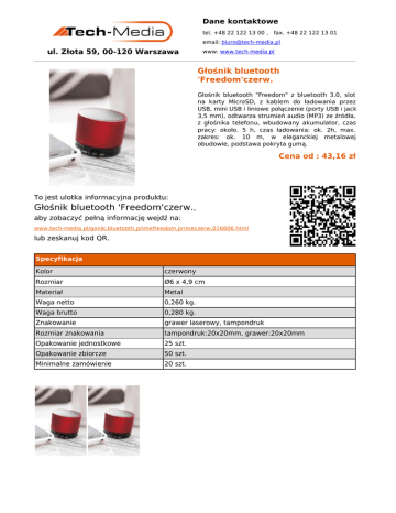 Dane kontaktowe tel. +48 22 122 13 00 , fax. +48 22 122 13 01 email: [email protected] ul. Złota 59, 00-120 Warszawa www: www.tech-media.pl Głośnik bluetooth 'Freedom'czerw. Głośnik bluetooth "Freedom" z bluetooth 3.0, slot na karty MicroSD, z kablem do ładowania przez USB, mini USB i liniowe połączenie (porty USB i jack 3,5 mm), odtwarza strumień audio (MP3) ze źródła, z głośnika telefonu, wbudowany akumulator, czas pracy: około. 5 h, czas ładowania: ok. 2h, max. zakres: ok. 10 m, w eleganckiej metalowej obudowie, podstawa pokryta gumą. Cena od : 43,16 zł To jest ulotka informacyjna produktu: Głośnik bluetooth 'Freedom'czerw., aby zobaczyć pełną informację wejdź na: www.tech-media.pl/gonik,bluetooth,primefreedom,primeczerw,016606.html lub zeskanuj kod QR. Specyfikacja Kolor czerwony Rozmiar Ø6 x 4,9 cm Materiał Metal Waga netto 0,260 kg. Waga brutto 0,280 kg. Znakowanie grawer laserowy, tampondruk Rozmiar znakowania tampondruk:20x20mm, grawer:20x20mm Opakowanie jednostkowe 25 szt. Opakowanie zbiorcze 50 szt. Minimalne zamówienie 20 szt.