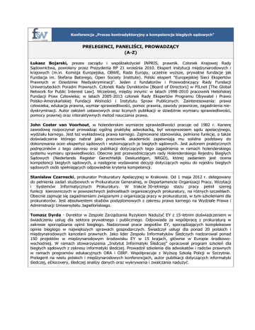 Konferencja „Proces kontradyktoryjny a kompetencje biegłych sądowych” PRELEGENCI, PANELIŚCI, PROWADZĄCY (A-Z) Łukasz Bojarski, prezes zarządu i współzałożyciel INPRIS, prawnik. Członek Krajowej Rady Sądownictwa, powołany przez Prezydenta RP 21 września 2010. Ekspert instytucji międzynarodowych i krajowych (m.in. Komisja Europejska, OBWE, Rada Europy, uczelnie wyższe, prywatne fundacje jak Fundacja im. Stefana Batorego, Open Society Institute). Polski ekspert "Europejskiej Sieci Ekspertów Prawnych w Dziedzinie Niedyskryminacji". Jeden z fundatorów i Przewodniczący Rady Fundacji Uniwersyteckich Poradni Prawnych. Członek Rady Dyrektorów [Board of Directors] w PILnet [The Global Network for Public Interest Law]. Wcześniej, między innymi: w latach 1998-2010 pracownik Helsińskiej Fundacji Praw Człowieka; w latach 2005-2013 członek Rady Ekspertów Programu Obywatel i Prawo Polsko-Amerykańskiej Fundacji Wolności i Instytutu Spraw Publicznych. Zainteresowania: prawa człowieka, edukacja prawna, wymiar sprawiedliwości, pomoc prawna, zawody prawnicze, zagadnienia niedyskryminacji. Autor założeń ustawowych oraz licznych publikacji w dziedzinie wymiaru sprawiedliwości, pomocy prawnej oraz interaktywnych metod nauczania prawa. John Coster van Voorhout, w holenderskim wymiarze sprawiedliwości pracuje od 1982 r. Karierę zawodową rozpoczynał prowadząc ogólną praktykę adwokacką, był wiceprezesem sądu apelacyjnego, wydziału karnego. Jest też wykładowcą prawa karnego. Zajmowane stanowiska, pełnione funkcje, a także doświadczenie którego nabrał jako pracownik akademicki zapewniają mu solidne podstawy do dokonywania ocen ekspertyz sądowych i wykonujących je biegłych sądowych. Jest autorem praktycznych podręczników z tego zakresu oraz publikacji dotyczących tego zagadnienia w ramach holenderskiego systemu wymiaru sprawiedliwości. Obecnie jest przewodniczącym rady Holenderskiego Rejestru Biegłych Sądowych (Nederlands Register Gerechtelijk Deskundigen, NRGD), której zadaniem jest ocena kompetencji biegłych sądowych, a następnie wydawanie decyzji dotyczących wpisu do rejestru biegłych sądowych osób spełniających odpowiednie kryteria kompetencji. Stanisław Czarnecki, prokurator Prokuratury Apelacyjnej w Krakowie. Od 1 maja 2012 r. delegowany do pełnienia zadań służbowych w Prokuraturze Generalnej, w Departamencie Organizacji Pracy, Wizytacji i Systemów Informatycznych Prokuratury. W trakcie 30-letniego stażu pracy pełnił szereg funkcji kierowniczych w powszechnych jednostkach organizacyjnych prokuratury, na różnych szczeblach. Obecnie zajmuje się zagadnieniami związanymi z organizacją pracy w prokuraturze, w tym szkoleniami dla prokuratorów. Jest absolwentem studiów podyplomowych z zakresu prawa karnego na Wydziale Prawa i Administracji Uniwersytetu Jagiellońskiego. Tomasz Dyrda - Dyrektor w Zespole Zarządzania Ryzykiem Nadużyć EY z 15-letnim doświadczeniem w świadczeniu usług dla sektora prywatnego i publicznego. Odpowiada za współpracę z prokuraturą w zakresie sporządzania opinii biegłego. Nadzorował prace zespołów EY, sporządzających kompleksowe opinie biegłego w największych sprawach gospodarczych. Świadczył usługi dla ponad 20 polskich i międzynarodowych kancelarii prawnych. Jako lider Zespołu Informatyków Śledczych nadzorował ponad 150 projektów w międzynarodowym środowisku EY w 15 krajach, głównie w Europie środkowowschodniej. W ramach stowarzyszenia „Instytut Informatyki Śledczej” opracował program szkoleń dla biegłych sądowych z zakresu informatyki śledczej. Prowadził szkolenia dla adwokatów i radców prawnych w ramach programów edukacyjnych ORA i OIRP. Współpracuje z Wyższą Szkołą Policji w Szczytnie. Prelegent na wielu polskich i międzynarodowych konferencjach, autor publikacji dotyczących informatyki śledczej, eDiscovery, śledczej analizy danych oraz wykrywania i zwalczania nadużyć. Piotr Girdwoyń, profesor nauk prawnych, pracownik Katedry Kryminalistyki Uniwersytetu Warszawskiego, adwokat. Ukończył studia na Uniwersytecie Warszawskim, odbywał stypendia i staże naukowe w Law School University of Baltimore (USA), Max Planck Institut für internationales und ausländisches Strafrecht we Freiburgu (Niemcy) i Wydziale Prawa Uniwersytetu w Bazylei (Szwajcaria). Stypendysta Alexander von Humboldt Stiftung, Hertie Stiftung oraz Straniak Stiftung. Jego zainteresowania naukowe obejmują zagadnienia dowodowe (w tym tzw. dowód naukowy), taktykę obrończą, prawo oraz postępowanie karne państw niemieckojęzycznych, USA oraz historię metod identyfikacyjnych. Autor kilkudziesięciu publikacji z zakresu kryminalistyki i procesu karnego. Kacper Gradoń, dyrektor CNS UW, adiunkt w Katedrze Kryminalistyki Wydziału Prawa i Administracji Uniwersytetu Warszawskiego, partner UCL Jill Dando Institute of Crime Science i Honorary Senior Research Associate Professor w Department of Security and Crime Science University College London. Jego praca magisterska (2000) i doktorska (2008; z wyróżnieniem) poświęcone były zagadnieniom zabójstwa wielokrotnego, analizy kryminalnej i profilowania kryminalnego. Kacper Gradoń swoje doświadczenie zawodowe zdobywał pracując w Polsce, Wielkiej Brytanii, Kanadzie i Stanach Zjednoczonych. Przez trzy lata był pracownikiem Komendy Głównej Policji w Warszawie, gdzie odpowiedzialny był m.in. za tworzenie systemów analizy kryminalnej i wywiadu kryminalnego. Jest absolwentem licznych szkoleń policyjnych, w tym kursu negocjacji kryzysowych London Metropolitan Police (Specialist Operations Training of Hostage Negotiations). Wielokrotnie nagradzany stypendiami naukowymi, jest także laureatem pierwszej nagrody Polskiego Towarzystwa Kryminalistycznego i Stypendium dla Młodych Kryminalistyków za wybitne osiągnięcia z dziedziny kryminalistyki (2008), stypendium dla najlepszych młodych doktorów w konkursie „Nowoczesny Uniw