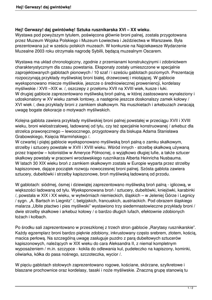 Hej! Gerwazy! daj gwintówkę! Hej! Gerwazy! daj gwintówkę! Sztuka rusznikarska XVI – XX wieku. Wystawa pod powyższym tytułem, poświęcona głównie broni palnej, została przygotowana przez Muzeum Wojska Polskiego i Muzeum Łowiectwa i Jeździectwa w Warszawie. Była prezentowana już w sześciu polskich muzeach. W konkursie na Najciekawsze Wydarzenie Muzealne 2003 roku otrzymała nagrodę Sybilli, będącą muzealnym Oscarem. Wystawa ma układ chronologiczny, zgodnie z przemianami konstrukcyjnymi i zdobnictwem charakterystycznym dla czasu powstania. Eksponaty zostały umieszczone w specjalnie zaprojektowanych gablotach pionowych / 10 szaf / i sześciu gablotach poziomych. Prezentację rozpoczynają przykłady myśliwskiej broni białej, drzewcowej i miotającej. W gablocie wyeksponowano miecze myśliwskie, jeszcze o średniowiecznej proweniencji, kordelasy myśliwskie / XVII –XIX w. /, oszczepy z przełomu XVII na XVIII wiek, kusze i łuki. W drugiej gablocie zaprezentowano myśliwską broń palną, w której zastosowano wynaleziony i udoskonalony w XV wieku zamek lontowy, a następnie jeszcze doskonalszy zamek kołowy / XVI wiek /, dwa przykłady broni z zamkiem skałkowym. Na muszkietach i arkebuzach zwracają uwagę bogate dekoracje o motywach myśliwskich. Kolejna gablota zawiera przykłady myśliwskiej broni palnej powstałej w przeciągu XVII i XVIII wieku, broni wielostrzałowej, ładowanej od tyłu, czy też specjalnie konstruowanej / arkebuz dla strzelca praworęcznego – lewoocznego, przygotowany dla biskupa Adama Stanisława Grabowskiego, Księcia Warmińskiego /. W czwartej i piątej gablocie wyeksponowano myśliwską broń palną o zamku skałkowym, strzelby i sztucery powstałe w XVII i XVIII wieku. Wśród innych - strzelbę skałkową używaną przez traperów – kolonistów w Ameryce Północnej, o wyjątkowo długiej lufie, a także sztucer skałkowy powstały w pracowni wrocławskiego rusznikarza Alberta Heinricha Nusbauma. W latach 30 XIX wieku broń z zamkiem skałkowym została w Europie wyparta przez strzelby kapiszonowe, dające początek rozwoju nowoczesnej broni palnej. Szósta gablota zawiera sztucery, dubeltówki i strzelby kapiszonowe, broń myśliwską ładowaną od przodu. W gablotach: siódmej, ósmej i dziewiątej zaprezentowano myśliwską broń palną - iglicową, w większości ładowaną od tyłu. Wyeksponowana broń / sztucery, dubeltówki, kniejówki, karabinki /, powstała w XIX i XX wieku, w wytwórniach niemieckich, śląskich – w Jeleniej Górze i Legnicy / sygn. „A. Bartsch in Liegnitz” /, belgijskich, francuskich, austriackich. Pod obrazem śląskiego malarza „Ubite ptactwo i pies myśliwski” wystawiono trzy siedemnastowieczne przykłady broni / dwie strzelby skałkowe i arkebuz kołowy / o bardzo długich lufach, efektownie zdobionych łożach i kolbach. Po środku sali zaprezentowano w przeszklonej z trzech stron gablocie „Rarytasy rusznikarskie”. Każdy egzemplarz broni bardzo pięknie zdobiony, inkrustowany często srebrem, złotem, kością, macica perłową. Na szczególną uwagę zasługuje puzdro z parą dubeltowych sztucerów kapiszonowych, należących w XIX wieku do cara Aleksandra II, z niemal kompletnym wyposażeniem / m.in. szczypce - kokila do odlewania kul, pudełeczko na kapiszony, kominki, oliwiarka, kółka do pasa nośnego, szczoteczka, wycior /. W pięciu gablotach stołowych zaprezentowano rogowe, kościane, skórzane, szylkretowe i blaszane prochownice oraz kordelasy, tasaki i noże myśliwskie. Znaczną grupę stanowią tu 1/2 Hej! Gerwazy! daj gwintówkę! prochownice z angielskich i francuskich wytwórni. Wśród kordelasów zwraca uwagę kordelas myśliwski z pistoletem kapiszonowym i kordelas należący do marszałka Edwarda Rydza – Śmigłego. Prezentacji broni myśliwskiej towarzyszy katalog wystawy i płyta CD z ilustracjami i tekstami Romana Matuszewskiego oraz Stefana Olecha, którzy są autorami ekspozycji. Łucja Wojtasik - Seredyszyn Otwarcie wystawy - 03.09.2004 Komisarz wystawy - Łucja Wojtasik - Seredyszyn Autorzy wystawy - Roman Matuszewski z Muzeum Wojska Polskiego w Warszawie i Stefan Olech z Muzeum Łowiectwa i Jeździectwa w Warszawie Czynna do - 09.01.2005 2/2