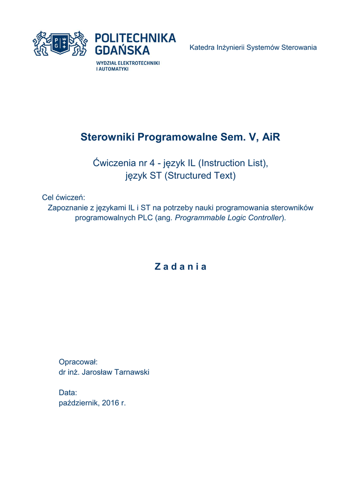 Katedra Inżynierii Systemów Sterowania Sterowniki Programowalne Sem. V, AiR Ćwiczenia nr 4 - język IL (Instruction List), język ST (Structured Text) Cel ćwiczeń: Zapoznanie z językami IL i ST na potrzeby nauki programowania sterowników programowalnych PLC (ang. Programmable Logic Controller). Zadania Opracował: dr inż. Jarosław Tarnawski Data: październik, 2016 r. Przebieg ćwiczeń #4 SP - IL/ST Zachęcenie Studentów do aktywnego uczestniczenia w zajęciach tj. do zgłaszania swoich uwag/pytań w dowolnym momencie zajęć. Podkreślenie, że zaproponowane rozwiązania nie są jedynymi możliwymi, a przemyślanymi i przejrzystymi propozycjami rozwiązań, Zachęcenie do weryfikowania na zajęciach laboratoryjnych wszystkich omawianych na Ć przykładów na ćwiczeniach obowiązuje zasada, że nie ma głupich pytań są tylko głupie odpowiedzi (proszę jej nie ekstrapolować na wszystkie dziedziny życia) 1. definiowanie zmiennych - norma, środowiska Proficy, TIA Portal 2. jak wywołać blok IL lub ST i jak zmienić _MAIN 3. Skok w tył - pętla w pętli - układ watchdog - zatrzymanie pracy PLC 4. 5. 6. 7. 8. 9. 10. 11. Przypomnienie podstawowych struktur A i Stos dla języka IL Przypomnienie o wersjach jednoargumentowych i wieloargumentowych Operacje na stykach LD i LDN, AND, ANDN, OR, ORN Operacje przekaźniki ST, STN, S, R, PT, NT Operacje z wykorzystaniem stosu OR(, AND(, ) Operacje na zmiennych binarnych, timer, licznik, matematyka, relacje matematyczne w IL Skoki i etykiety JMP, JMPC, JMPCN, etykieta, etykieta: Zasady konstrukcji funkcji wysokopoziomowych w języku niskopoziomowym IF, CASE, FOR, DO..WHILE, WHILE, 12. --- separator części IL/ST 13. główne cechy języka ST: język wysokopoziomowy, operator podstawienia :=, średnik na końcu wiersza, ścisła kontrola typów, liczby real w formacie 0.0, obecność funkcji wysokopoziomywch IF_THEN, CASE, FOR, WHILE, REPEAT i zamykanie tych funkcji ENF_IF; END_CASE itd. 14. Operacje na zmiennych binarnych, timer, licznik, matematyka, relacje matematyczne w ST 15. Program sygnalizacja świetlna w ST czyli realizacja procesów sekwencyjnych w ST 16. Operacje na tablicach, jedno i dwuargumentowych - brak możliwości operacji arytmetycznych jako indeks wektora czy macierzy wektor[i+1]. 17. Sortowanie bąbelkowe elementów wektora Elementy[20] 18. Dodawanie macierzy Do samodzielnego rozwiązania: 19. Do pierwszego wyjścia analogowego PLC podłączone jest wejście obiektu inercyjnego Igo rzędu z opóźnieniem, a na drugiego wejście analogowe PLC trafia sygnał wyjściowy z tego obiektu. Napisz program, który ustali: wzmocnienie obiektu, stałą czasową, opóźnienie. 20. W PLC dobierano w sposób eksperymentalny nastawy regulatora. Aby porównać jakość działania tych regulatorów opracuj program dla PLC obliczający całkę z kwadratu uchybu, przeregulowanie, czas T95 (+/- 5%). 21. mnożenie i odwracanie macierzy