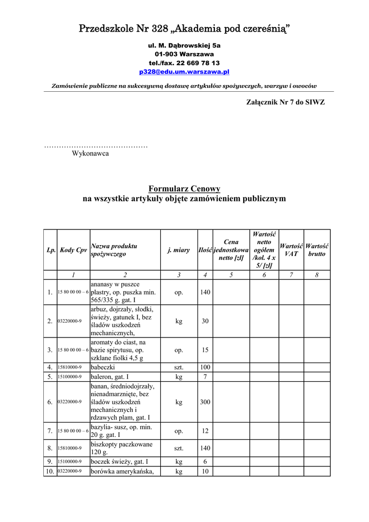Przedszkole Nr 328 „Akademia pod czereśnią” ul. M. Dąbrowskiej 5a 01-903 Warszawa tel./fax. 22 669 78 13 [email protected] Zamówienie publiczne na sukcesywną dostawę artykułów spożywczych, warzyw i owoców Załącznik Nr 7 do SIWZ …………………………………… Wykonawca Formularz Cenowy na wszystkie artykuły objęte zamówieniem publicznym Lp. Kody Cpv 1 1. 15 80 00 00 – 6 2. 03220000-9 3. 15 80 00 00 – 6 4. 5. 15810000-9 6. 03220000-9 7. 15 80 00 00 – 6 8. 15810000-9 9. 10. 15100000-9 15100000-9 03220000-9 Nazwa produktu spożywczego 2 ananasy w puszce plastry, op. puszka min. 565/335 g. gat. I arbuz, dojrzały, słodki, świeży, gatunek I, bez śladów uszkodzeń mechanicznych, aromaty do ciast, na bazie spirytusu, op. szklane fiolki 4,5 g babeczki baleron, gat. I banan, średniodojrzały, nienadmarznięte, bez śladów uszkodzeń mechanicznych i rdzawych plam, gat. I bazylia- susz, op. min. 20 g. gat. I biszkopty paczkowane 120 g. boczek świeży, gat. I borówka amerykańska, j. miary 3 Wartość Cena netto Wartość Wartość Ilość jednostkowa ogółem VAT brutto netto [zł] /kol. 4 x 5/ [zł] 4 5 6 7 8 op. 140 kg 30 op. 15 szt. kg 100 7 kg 300 op. 12 szt. 140 kg kg 6 10 Przedszkole Nr 328 „Akademia pod czereśnią” ul. M. Dąbrowskiej 5a 01-903 Warszawa tel./fax. 22 669 78 13 [email protected] Zamówienie publiczne na sukcesywną dostawę artykułów spożywczych, warzyw i owoców 11. 03220000-9 12. 15896000-5 13. 03220000-9 14. 03220000-9 15. 15 80 00 00 – 6 16. 15 80 00 00 – 6 17. 15810000-9 18. 15810000-9 19. 15810000-9 20. 21. 15810000-9 22. 15810000-9 23. 03220000-9 24. 03220000-9 25. 03220000-9 15810000-9 świeża gat. I, pakowane 0,5 kg botwina świeża, pakowana w pęczki brokuły (opakowanie foliowe 0,45 kg.) gat. I brokuły świeże, bez śladów uszkodzeń mechanicznych, brukselka bez śladów uszkodzeń mechanicznych, brzoskwinie w puszce połówki owoców, opakowanie puszka min. 820/470 g. gat. I budyń bez sztucznych barwników, bez cukru, różne smaki, op. min. 60 g. gat. I bułeczka bankietowa, świeża, 30 g bułka długa krojona, paryska-bagietka, świeża, 330 g bułka kajzerka, świeża, 50 g bułka maślana min. 50 g bułka tarta, op 500 g bułki grahamki, świeże, 50 g buraki czerwone, świeże, bez liści, nienadmarznięte, bez śladów uszkodzeń mechanicznych cebula biała, świeża, bez szczypioru, sucha, nienadmarznięta, bez śladów uszkodzeń mechanicznych cebula czerwona, świeża, sucha, nienadmarznięta, bez śladów uszkodzeń pęczek 60 kg 20 szt. 40 kg 10 op. 60 op. 80 szt. 300 szt. 1150 szt. 200 szt. kg 200 50 szt. 300 kg 400 kg 160 kg 10 Przedszkole Nr 328 „Akademia pod czereśnią” ul. M. Dąbrowskiej 5a 01-903 Warszawa tel./fax. 22 669 78 13 [email protected] Zamówienie publiczne na sukcesywną dostawę artykułów spożywczych, warzyw i owoców mechanicznych 26. 15810000-9 27. 15810000-9 28. 15810000-9 29. 15810000-9 30. 15810000-9 31. 15810000-9 32. 15 80 00 00 – 6 33. 15810000-9 34. 15810000-9 35. 15100000-9 36. 15 80 00 00 – 6 37. 15 80 00 00 – 6 38. 15 80 00 00 – 6 39. 03220000-9 40. 03220000-9 41. 15896000-5 chałka tradycyjna, świeża, 310 g chleb biały pszenny, typu baltonowski, świeży, 650 g chleb graham świeży, 500 g chleb pytlowy 500 g chleb razowy na zakwasie, świeży, 500 g chleb razowy wieloziarnisty, świeży, 500 g chrzan tarty śmietankowy, w słoiku min. 260 g. bez dodatku octu ciasto piaskowe lub drożdżowe, świeże, pakowane w folię o pojemności 300 g ciastka kruche, wafle, op. min. 1 kg cielęcina surowa b/k, elementy świeże, gat. I cukier biały, sypki, op. papierowe 1 kg. gat. I cukier puder op. min 400 g. gat. I cukier waniliowy op. papierowe min. 5 g. gat. I cukinia bez śladów uszkodzeń mechanicznych, cytryna, dojrzała, średniej wielkości, z cienką skórką, bez śladów uszkodzeń mechanicznych, gat. I czarne porzeczki (opakowanie foliowe min. 0,45 kg.) gat. I szt. 220 szt. 650 szt. 50 szt. 40 szt. 100 szt. 100 op. 10 szt. 60 kg 40 kg 30 kg 520 op. 4 op. 50 kg 10 kg 75 kg 10 Przedszkole Nr 328 „Akademia pod czereśnią” ul. M. Dąbrowskiej 5a 01-903 Warszawa tel./fax. 22 669 78 13 [email protected] Zamówienie publiczne na sukcesywną dostawę artykułów spożywczych, warzyw i owoców 42. 15 80 00 00 – 6 43. 15 80 00 00 – 6 44. 15 80 00 00 – 6 45. 03220000-9 46. 15810000-9 47. 15500000-3 48. 15220000-0 49. 15 80 00 00 – 6 50. 15810000-9 51. 03220000-9 52. 15 80 00 00 – 6 53. 03220000-9 54. 15896000-5 55. 03220000-9 56. 15100000-9 czekolada mleczna Czekoladowe Jajko z niespodzianką Czekoladowy Zajączek wielkanocny czosnek krajowy, świeży w główkach, bez śladów uszkodzeń mechanicznych delicje szampańskie, różne smaki, op. ok. 150 g deser mlecznoczekoladowy typu Monte, op. 100G Dorsz mrożony, filet bez skóry, bez ości, (opakowanie foliowe w kartonie waga min. 5 kg.), nie więcej niż 3 % glazury technologicznej drożdże piekarskie, świeże, op. 100 g. gat. I drożdżówki różne smaki min. 50 g dynia dojrzała, słodka, bez śladów uszkodzeń mechanicznych, dżem niskosłodzony, nie mniej niż 35g owoców na 100 g produktu op. słoik min. 280 g. smaki: czarna porzeczka, truskawka, brzoskwinia gat. I fasola sucha drobna, op. foliowe min,. 500 g. gat. I fasolka szparagowa zielona/ żółta (opakowanie foliowe min. 0,45 kg.) gat. I fasolka szparagowa, żółta/ zielona, świeża filet z indyka,piersi z op. 260 szt. 135 szt. 135 główki 25 op. 45 op. 185 kg 30 op. 25 szt. 600 kg 20 op. 60 kg 45 kg 40 kg 20 kg 70 Przedszkole Nr 328 „Akademia pod czereśnią” ul. M. Dąbrowskiej 5a 01-903 Warszawa tel./fax. 22 669 78 13 [email protected] Zamówienie publiczne na sukcesywną dostawę artykułów spożywczych, warzyw i owoców 57. 15100000-9 58. 15 80 00 00 – 6 59. 03220000-9 60. 15 80 00 00 – 6 61. 15810000-9 62. 03220000-9 63. 15 80 00 00 – 6 64. 15 80 00 00 – 6 65. 15 80 00 00 – 6 66. 15 80 00 00 