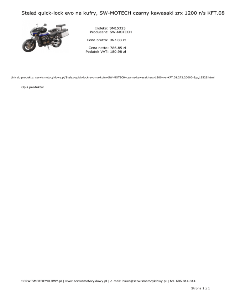 Stelaź quick-lock evo na kufry, SW-MOTECH czarny kawasaki zrx 1200 r/s KFT.08. Indeks: SM15325 Producent: SW-MOTECH Cena brutto: 967.83 zł Cena netto: 786.85 zł Podatek VAT: 180.98 zł Link do produktu: serwismotocyklowy.pl/Stelaz-quick-lock-evo-na-kufry-SW-MOTECH-czarny-kawasaki-zrx-1200-r-s-KFT.08.272.20000-B,p,15325.html Opis produktu: SERWISMOTOCYKLOWY.pl | www.serwismotocyklowy.pl | e-mail: [email protected] | tel. 606 814 814 Strona 1 z 1