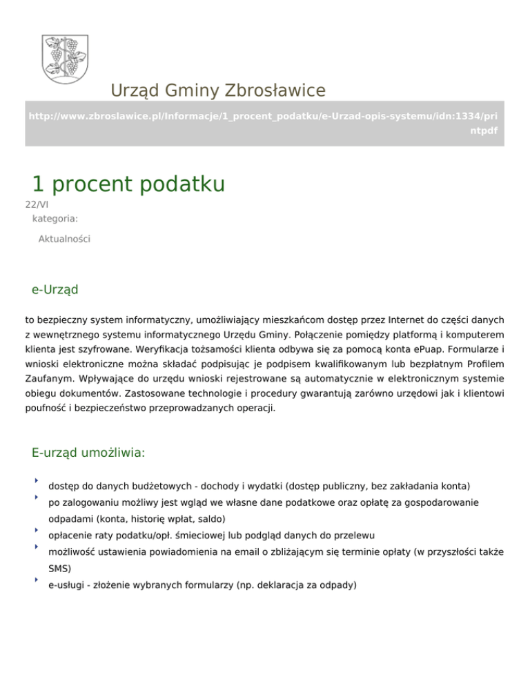 Urząd Gminy Zbrosławice http://www.zbroslawice.pl/Informacje/1_procent_podatku/e-Urzad-opis-systemu/idn:1334/pri ntpdf 1 procent podatku 22/VI kategoria: Aktualności e-Urząd to bezpieczny system informatyczny, umożliwiający mieszkańcom dostęp przez Internet do części danych z wewnętrznego systemu informatycznego Urzędu Gminy. Połączenie pomiędzy platformą i komputerem klienta jest szyfrowane. Weryfikacja tożsamości klienta odbywa się za pomocą konta ePuap. Formularze i wnioski elektroniczne można składać podpisując je podpisem kwalifikowanym lub bezpłatnym Profilem Zaufanym. Wpływające do urzędu wnioski rejestrowane są automatycznie w elektronicznym systemie obiegu dokumentów. Zastosowane technologie i procedury gwarantują zarówno urzędowi jak i klientowi poufność i bezpieczeństwo przeprowadzanych operacji. E-urząd umożliwia: dostęp do danych budżetowych - dochody i wydatki (dostęp publiczny, bez zakładania konta) po zalogowaniu możliwy jest wgląd we własne dane podatkowe oraz opłatę za gospodarowanie odpadami (konta, historię wpłat, saldo) opłacenie raty podatku/opł. śmieciowej lub podgląd danych do przelewu możliwość ustawienia powiadomienia na email o zbliżającym się terminie opłaty (w przyszłości także SMS) e-usługi - złożenie wybranych formularzy (np. deklaracja za odpady) Aby uzyskać dostęp do platformy Eurząd należy: zarejestrować się na platformie ePuap i potwierdzić swój wniosek o Profil Zaufany w najbliższym punkcie (np. w sekretariacie Urzędu Gminy, pok 6.) złożyć wniosek o dostęp do systemu informatycznego (Katalog usług -> Dostęp do systemu teleinformatycznego) poczekać na weryfikację danych, aktywację konta i zwrotną wiadomość z Urzędu Gminy przejdź do platformy e-Urząd Geneza powstania platformy eurząd: Gmina Zbrosławice, jako partner gmin Wielowieś, Świerklaniec oraz miast Tarnowskie Góry, Sosnowiec i Jaworzno (jako Lidera) przystąpiła do projektu „e-Urzędy – utworzenie zintegrowanego systemu wspomagania zarządzaniem w administracji publicznej wraz z zapewnieniem świadczenia usług drogą elektroniczną". 3 czerwca 2014 r. została podpisana umowa o dofinansowanie z Ministerstwem Administracji i Cyfryzacji, co było ostatnim etapem fazy starań o możliwość realizacji projektu w ramach Programu Operacyjnego Kapitał Ludzki. Projekt ten znacząco unowocześnił posiadane już systemy informatyczne oraz pozwolił na zwiększenie wydajności pracy urzędu, przez automatyzację części procesów, które wcześniej musiały być wykonywane ręcznie. Wdrożenie pozwoliło na uruchomienie e-usług dla mieszkańców: płatności masowe – każdy podatnik będzie posiadał swój, indywidualny numer konta bankowego po stronie urzędu, który będzie służył do rozliczeń. Operacje będą rozliczane automatycznie, podobnie jak realizowane są rozliczenia za energię elektryczną, czy telefony komórkowe. system informacji podatkowej - mieszkańcy, po utworzeniu konta w systemie, będą mogli sprawdzić wysokość podatku, opłat śmieciowych oraz mieć wgląd w historię operacji. system powiadamiania kontrahenta umożliwi elektroniczne informowanie o nadchodzącej racie podatku, opłacie śmieciowej oraz innych istotnych wydarzeniach z życia gminy. punkt potwierdzania Profilu Zaufanego ePuap – pozwoli na bezpłatne i szybkie potwierdzenie tożsamości mieszkańca w lokalnym urzędzie i założenie konta na platformie ePuap, dzięki czemu nie będzie konieczności zakupu płatnego podpisu kwalifikowanego. opracowanie formularzy na platformie ePuap umożliwi realizację wybranych usług bez fizycznej obecności petenta w urzędzie. Wystarczy jednorazowo potwierdzić tożsamość w punkcie potwierdzania profilu zaufanego, by resztę spraw załatwić przez Internet. Planowane jest uruchomienie ponad dwudziestu dedykowanych formularzy. Budżet projektu dla Gminy Zbrosławice wyniósł 189.693,81 zł i finansowany był z Europejskiego Funduszu Społecznego (85%) oraz ze środków Gminy Zbrosławice (15%). Z powyższych środków został zakupiony niezbędny sprzęt informatyczny, licencje na oprogramowanie oraz specjalistyczne szkolenia urzędników, mające na celu podwyższenie kompetencji i umiejętności w tematyce zastosowania e-usług. Projekt zakończono w październiku 2015 r. Maciej Połoński - koordynator projektu e-Urzędy Redagował:
